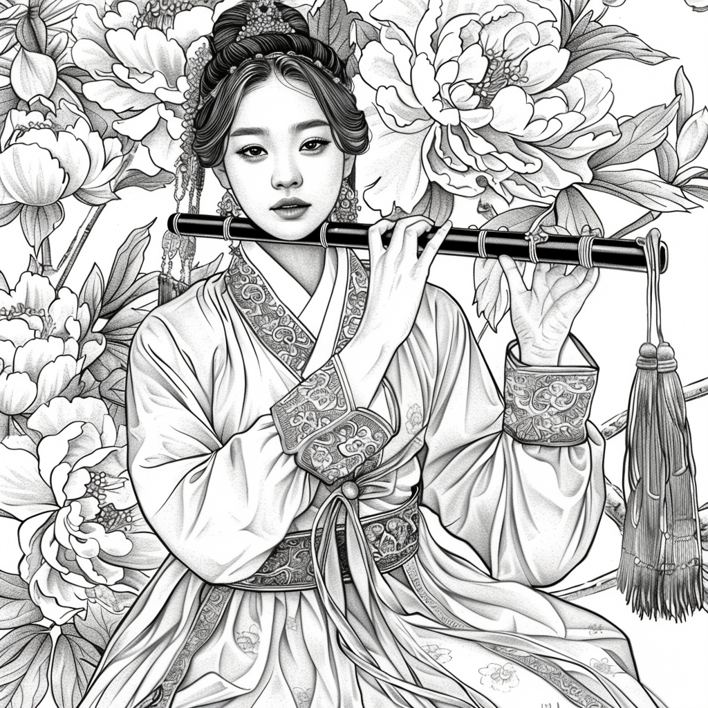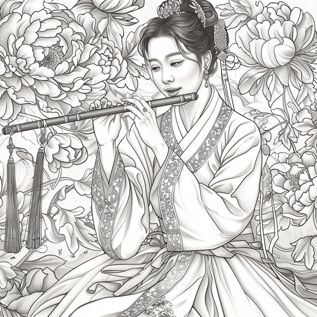A gentle Korean woman dressed in a soft, pastel-colored hanbok plays a traditional flute, surrounded by lush watercolor peonies in full bloom. Her delicate expression, paired with the graceful movement of her hands, creates a serene and poetic moment. The intricate floral embroidery on her sleeves echoes the blossoms behind her, blending music, beauty, and tradition into a harmonious scene that feels both timeless and tender.