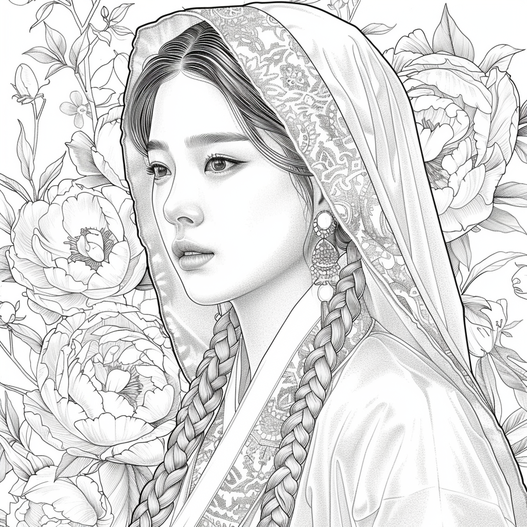 A mysterious Korean maiden stands wrapped in deep blue embroidered garments, her braided hair framed by a richly decorated hood. Behind her, enormous peonies bloom in vivid shades of crimson, violet, and coral, creating a dramatic contrast to her calm, moonlit gaze. Intricate floral patterns woven into her hanbok echo the surrounding blossoms, blending tradition and fantasy in a mesmerizing portrait filled with depth, elegance, and quiet enchantment.