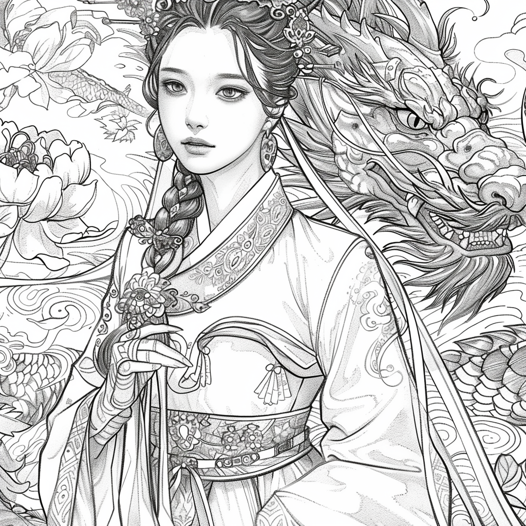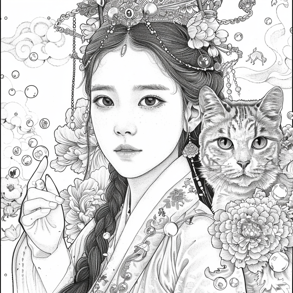 A radiant young woman glows with charm and tradition, dressed in a stunning hanbok blooming with embroidered flowers in every shade of spring. The rainbow palette of her outfit—from emerald green and plum to amber and lilac—echoes the vibrant floral arch that surrounds her. Her neatly styled hair, adorned with fresh blossoms and delicate hairpins, complements her poised elegance and warm gaze. This whimsical watercolor illustration celebrates youthful beauty, Korean culture, and the lively harmony between nature and heritage.