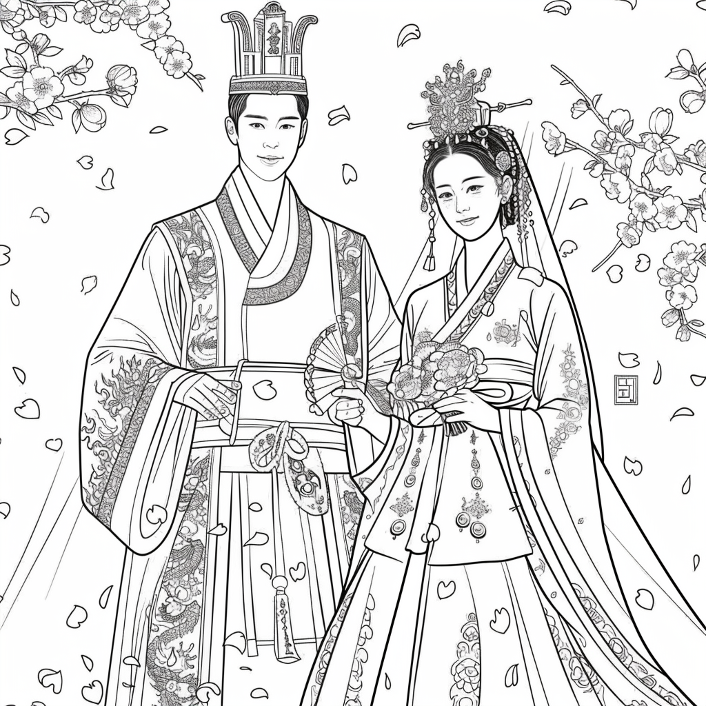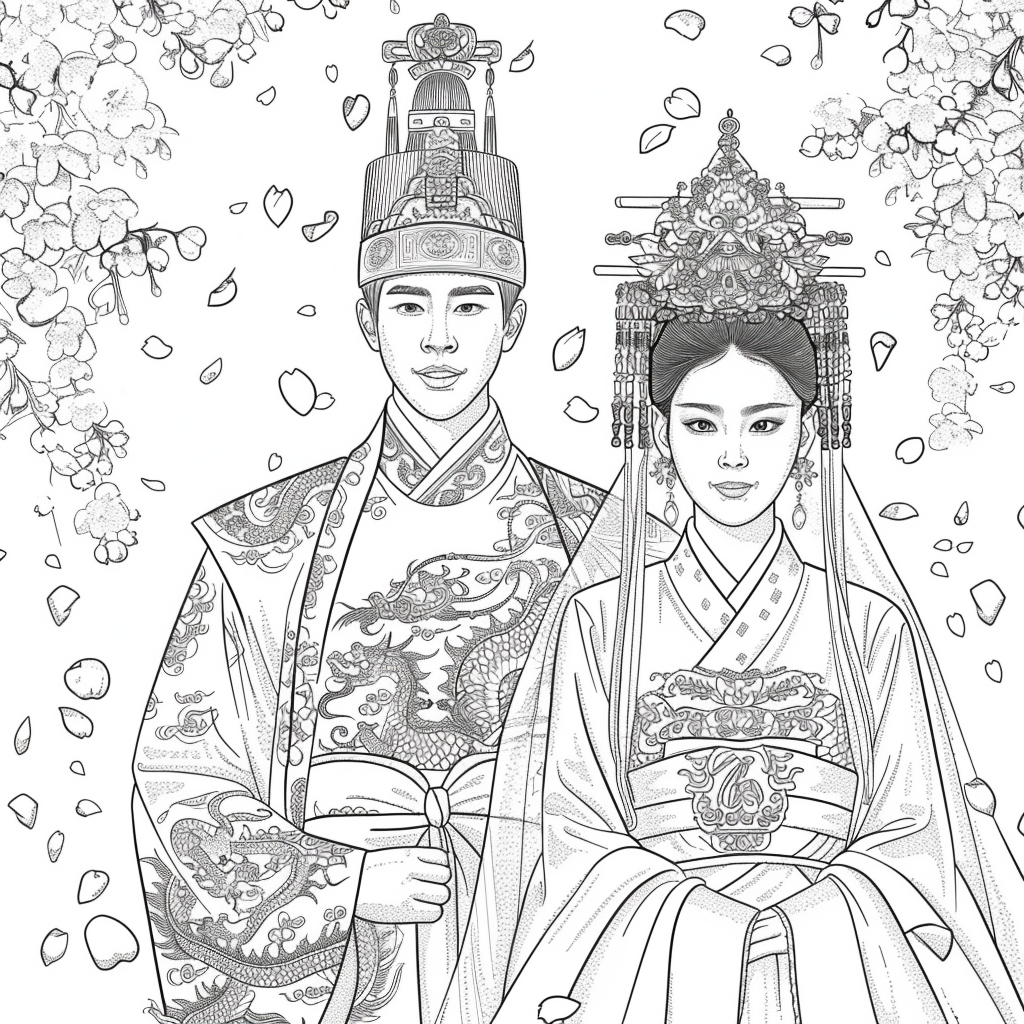 A noble bride and groom stand hand in hand beneath falling cherry blossoms, dressed in exquisite traditional hanbok. The bride glows in a radiant red gown adorned with delicate floral patterns and an ornate golden crown, while the groom wears a dignified black robe with dragon embroidery and a ceremonial headpiece. Their serene expressions capture both elegance and strength, embodying the grace of Korean royal heritage. The soft watercolor style and drifting petals create a timeless atmosphere of love, honor, and unity.