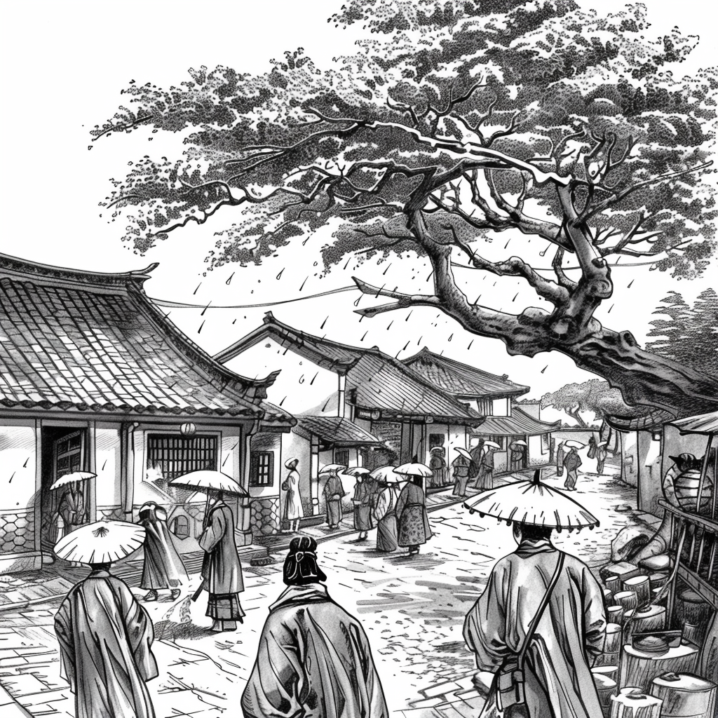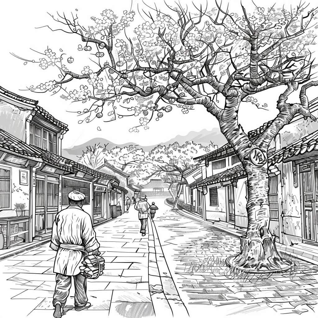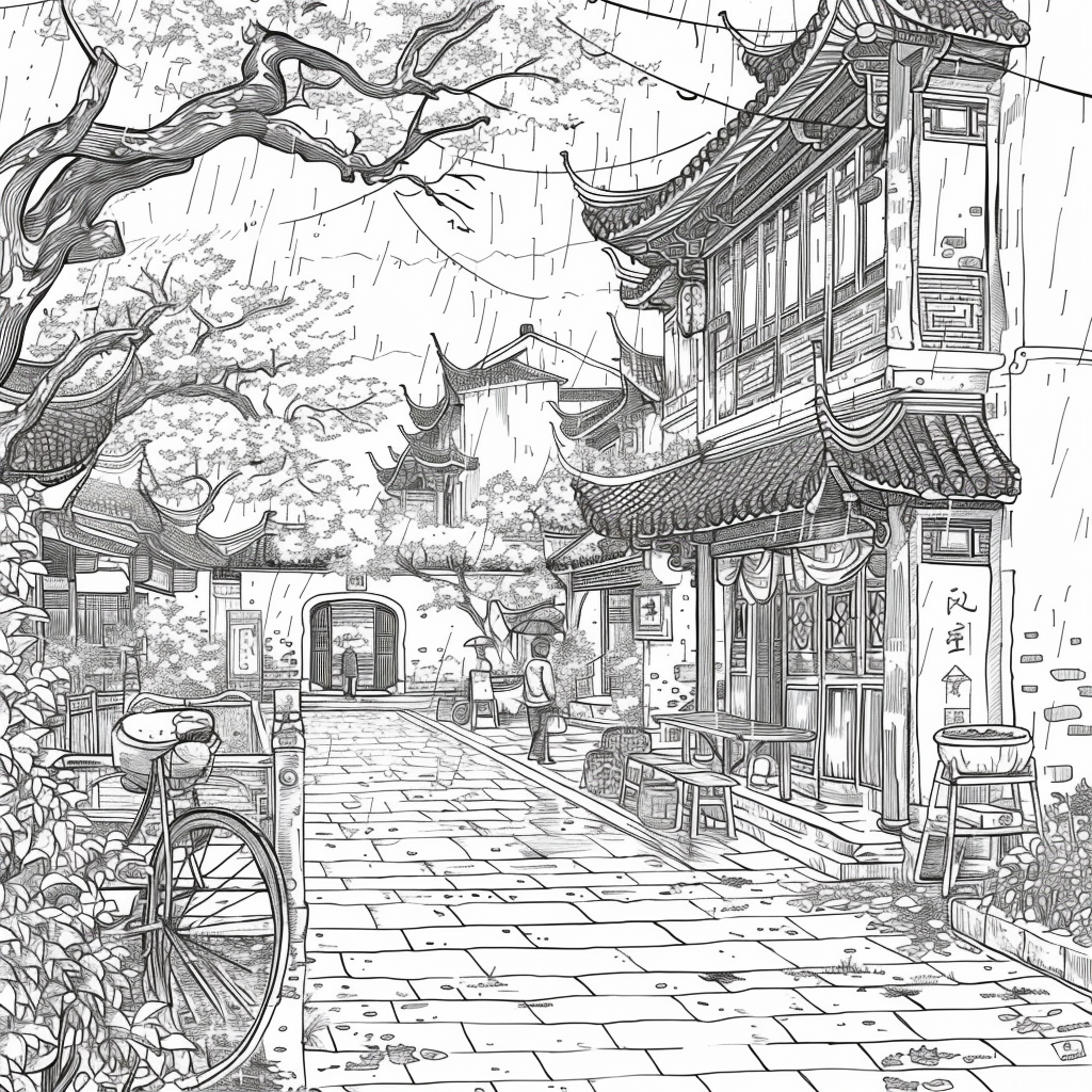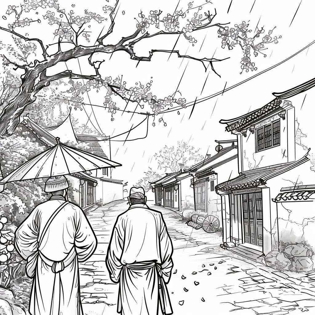 This vibrant artwork captures the serene beauty of a rainy day in a traditional courtyard, where cherry blossoms bloom in dazzling shades of pink and red. Umbrella-carrying figures stroll along the glistening pathways, their reflections shimmering on the wet ground. The ancient tiled rooftops and glowing lanterns of the buildings provide a warm contrast to the cool rain and misty sky. The splashes of watercolor-like textures give the scene both movement and intimacy, evoking the quiet joy of walking under spring rain among blossoms. The painting conveys a poetic moment where tradition, nature, and fleeting weather harmoniously blend.