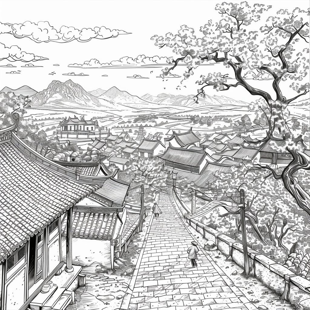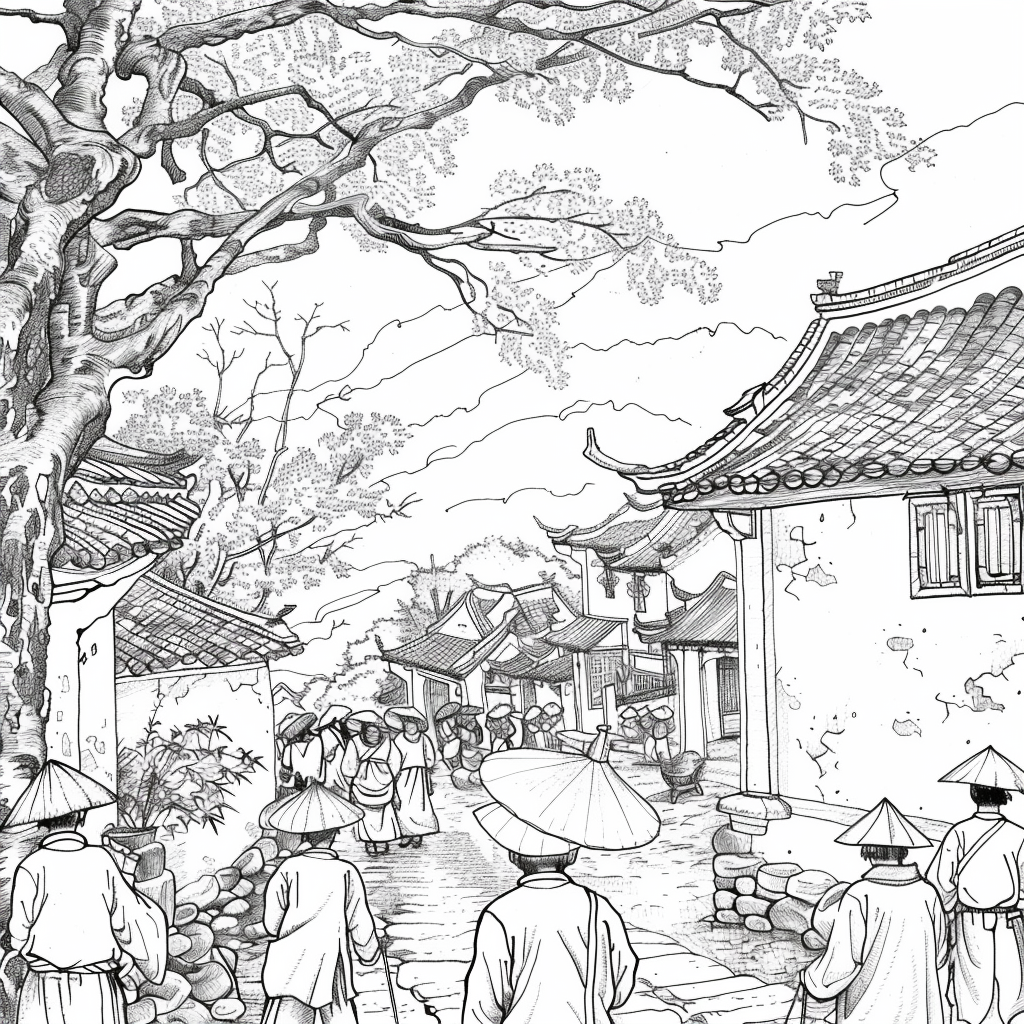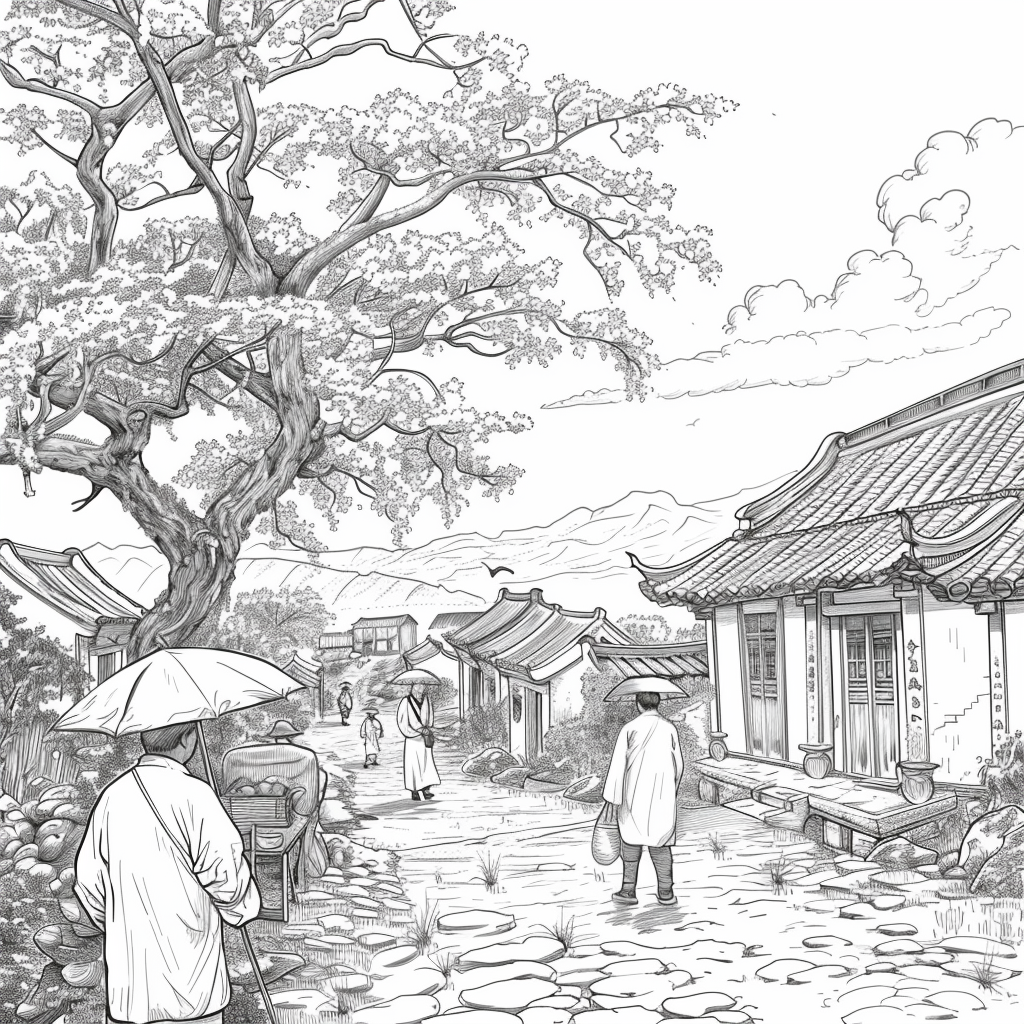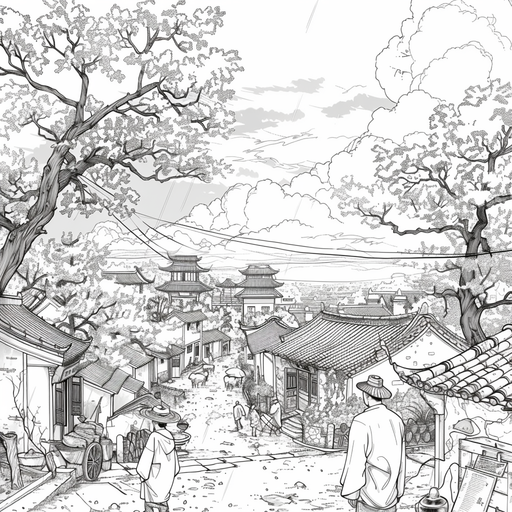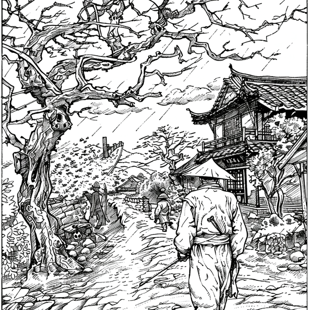 This vibrant artwork captures the serene beauty of a rainy day in a traditional courtyard, where cherry blossoms bloom in dazzling shades of pink and red. Umbrella-carrying figures stroll along the glistening pathways, their reflections shimmering on the wet ground. The ancient tiled rooftops and glowing lanterns of the buildings provide a warm contrast to the cool rain and misty sky. The splashes of watercolor-like textures give the scene both movement and intimacy, evoking the quiet joy of walking under spring rain among blossoms. The painting conveys a poetic moment where tradition, nature, and fleeting weather harmoniously blend.