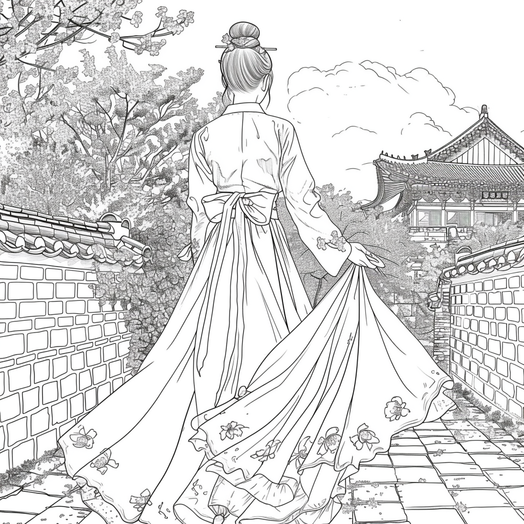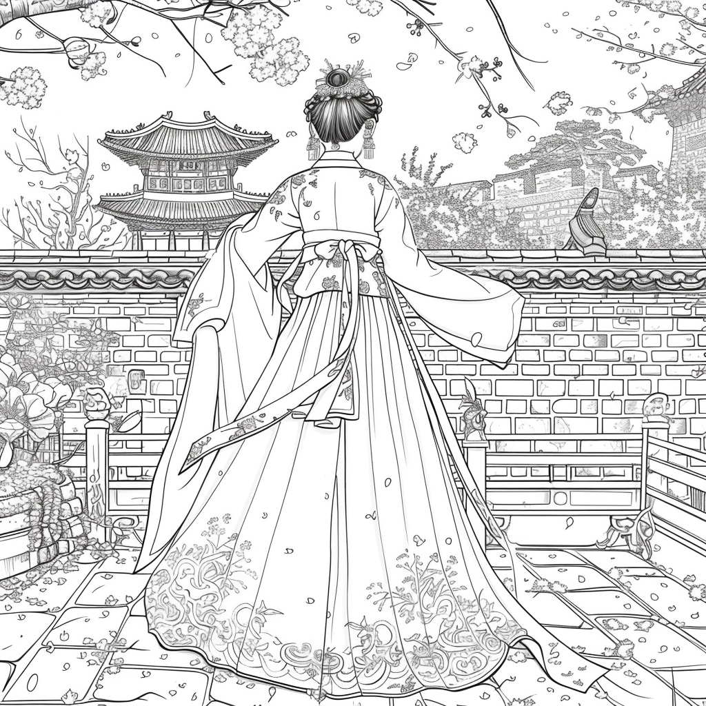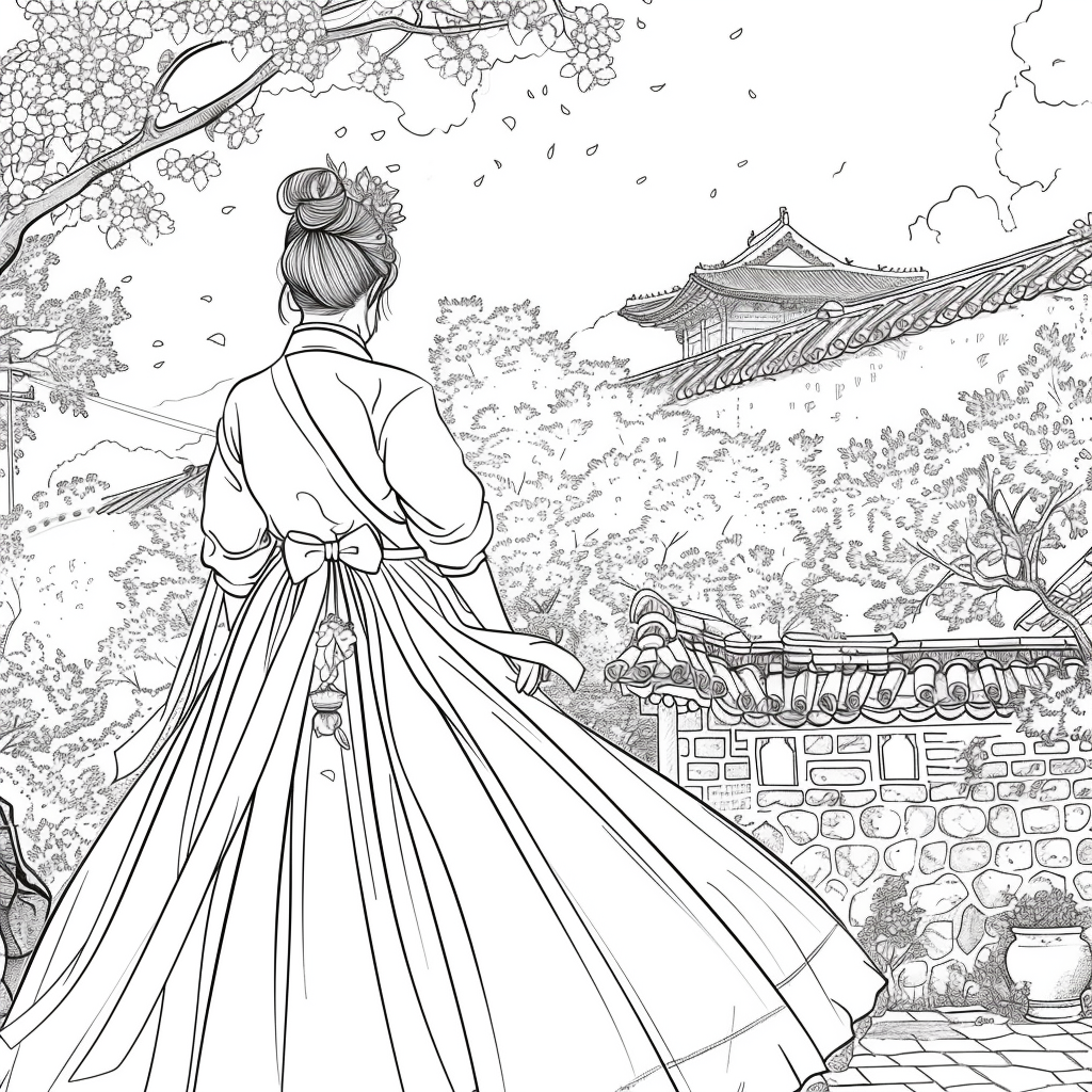 Beneath a canopy of blooming cherry blossoms, a young woman in a flowing pink hanbok gracefully walks through a traditional Korean hanok courtyard. The sunlight filters gently onto the stone path, casting soft shadows that dance with the petals drifting in the breeze. Her gown, adorned with delicate floral patterns, sways like a watercolor dream, blending harmoniously with the natural and architectural beauty around her. This serene scene captures the timeless elegance of Korea’s spring, where tradition, nature, and gentle romance come alive in perfect harmony.