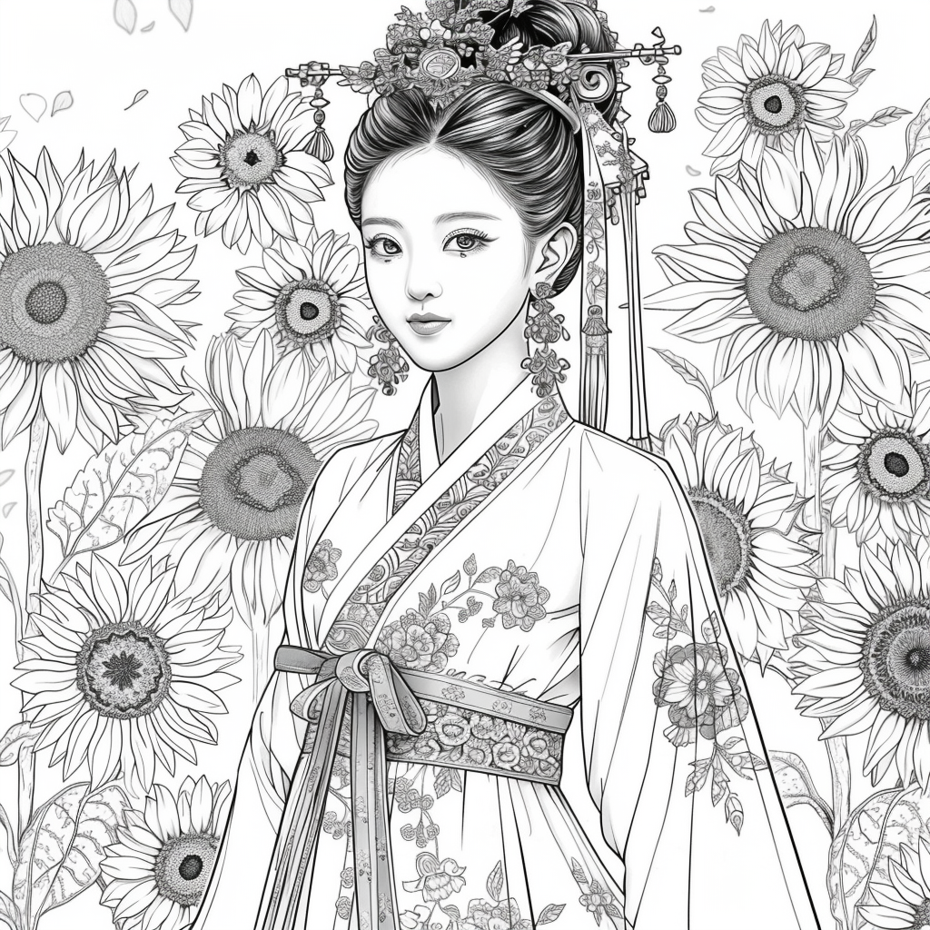 A luminous Korean princess in an elegant royal hanbok is framed by radiant sunflowers and adorned with an intricate jeweled crown of floral ornaments. Soft pastel tones, delicate facial features, and refined decorative details create a graceful portrait that feels both regal and dreamy. This artwork beautifully blends Korean-inspired elegance with the warmth and symbolism of sunflowers, expressing beauty, light, and gentle nobility.