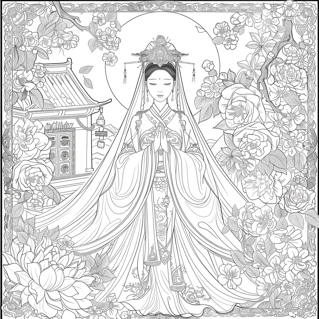 This enchanting artwork depicts a serene princess dressed in a flowing, ethereal hanbok adorned with delicate floral embroidery and rainbow-like ribbons. With hands gently clasped in prayer, she radiates tranquility and grace. Two majestic peacocks unfurl their iridescent tails behind her, symbolizing beauty, nobility, and divine protection. Surrounded by a vivid garden of blossoms in full bloom, the scene captures the harmony of nature and spirit. The crown of flowers and jewels on her head enhances her divine aura, making her appear as a guardian of peace and prosperity in a realm where elegance meets the mystical.