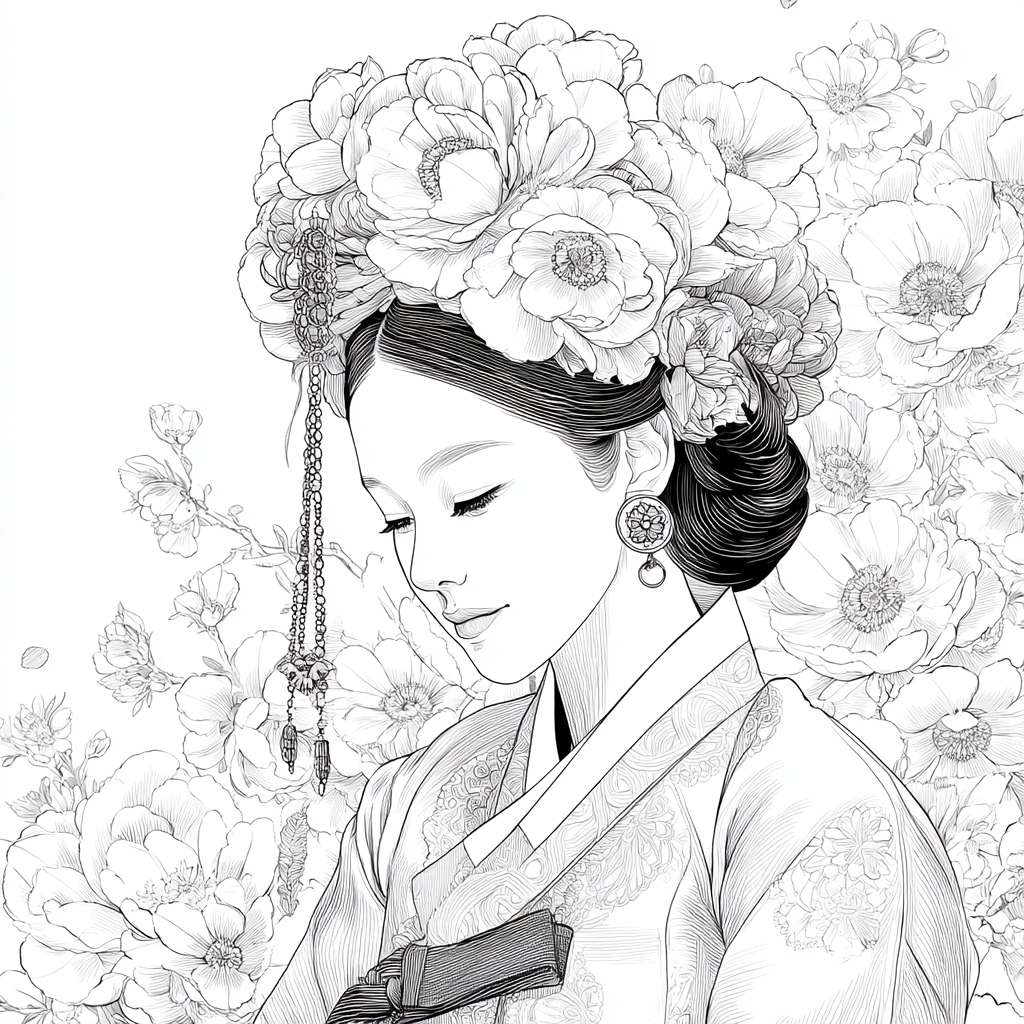 This delicate watercolor illustration captures a serene Korean woman dressed in an intricately embroidered hanbok, her hat and garments adorned with peonies and magnolia blossoms. The palette blends gentle pinks, mint blues, and pastel lavenders, symbolizing elegance, renewal, and femininity. Every stroke reflects harmony between nature and culture, evoking the quiet beauty of Joseon-era artistry infused with a dreamlike spring glow.