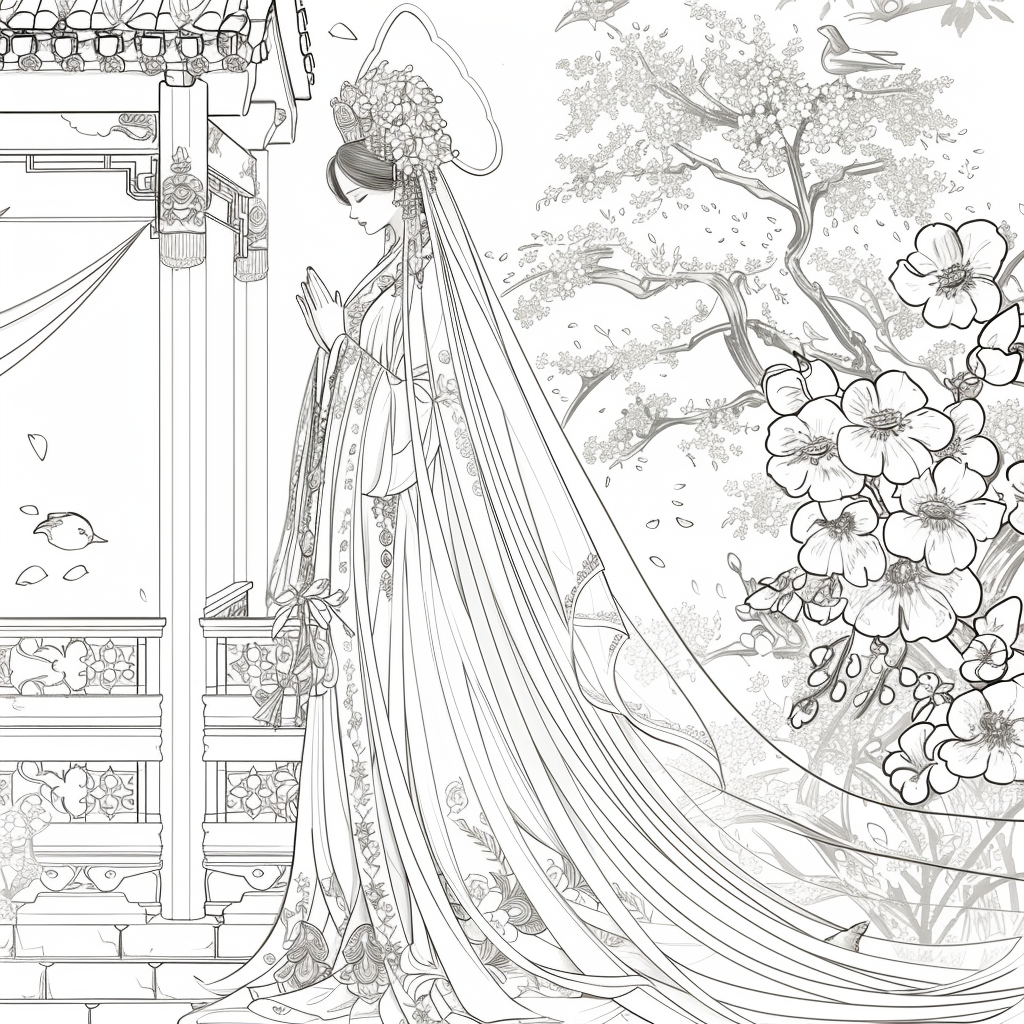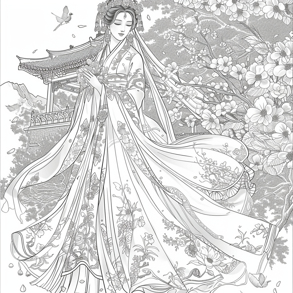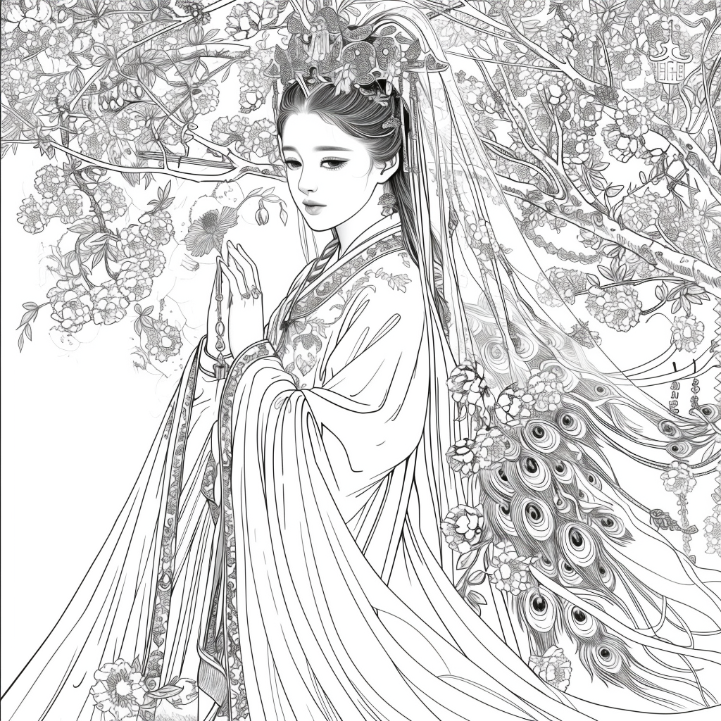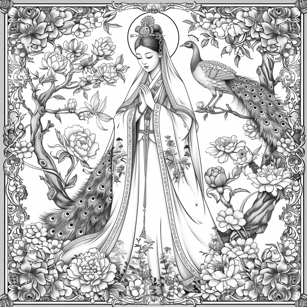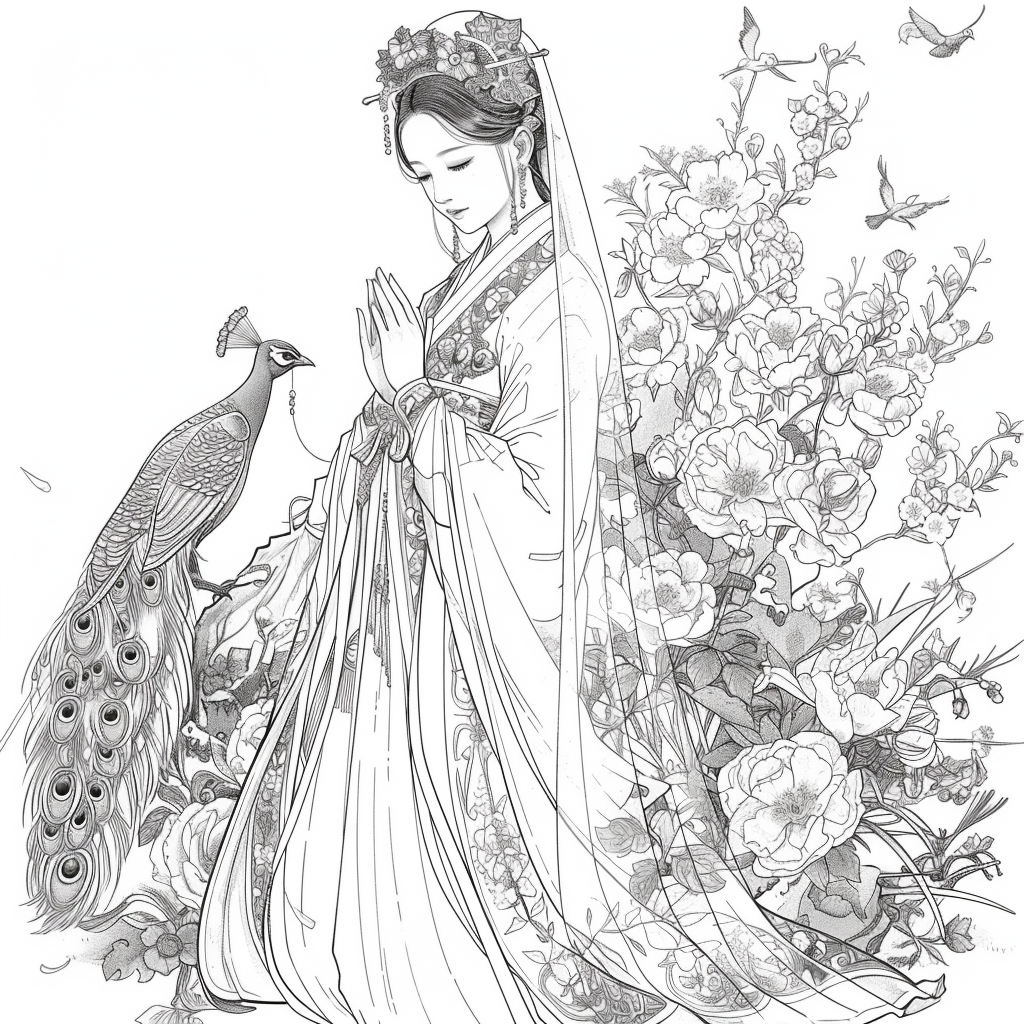 A serene princess stands in quiet grace, hands gently pressed together in a gesture of prayer and harmony. Her flowing hanbok, adorned with vivid floral embroidery and radiant blue silks, glimmers under soft light. Beside her, a majestic peacock spreads its resplendent feathers, symbolizing beauty, dignity, and eternal renewal. Around them, roses and wild blossoms bloom in abundance, while butterflies drift through the air, creating an enchanting garden of color and life. The scene radiates a sense of divine tranquility, where elegance, nature, and spirit intertwine in perfect balance.