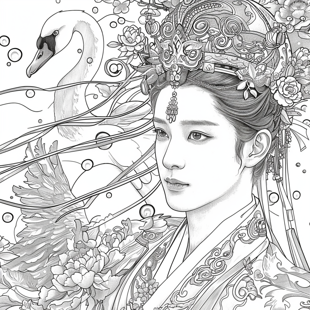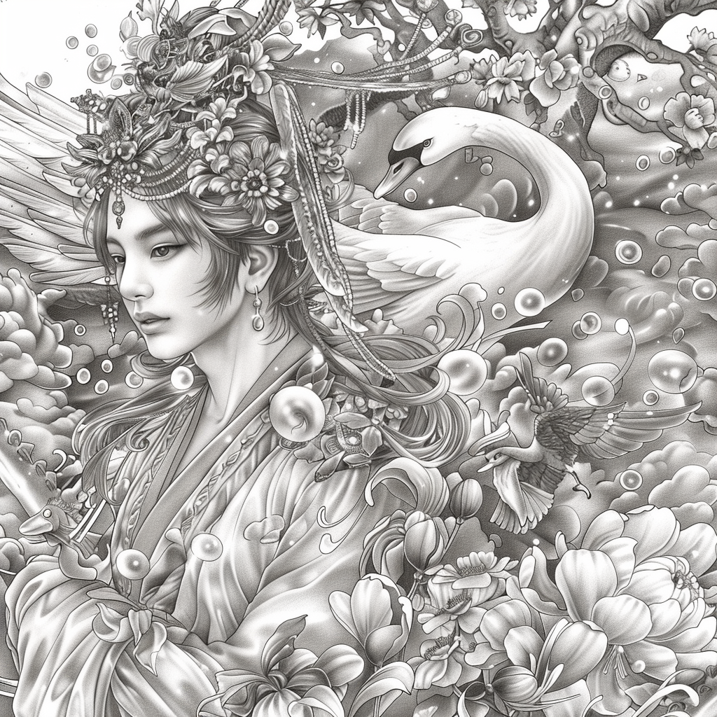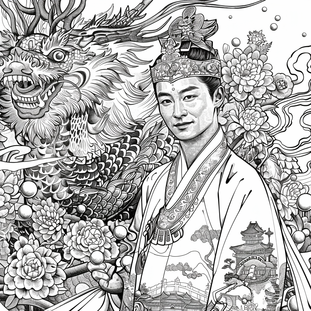 A young emperor stands in regal poise, his elaborate crown gleaming with golden symbols of power and wisdom. His silk robes shimmer in emerald, crimson, and sapphire, embroidered with intricate dragon motifs that flow like waves across the fabric. At his side coils a magnificent dragon, its scales glowing with shades of jade and gold, surrounded by blossoms and ethereal bubbles that rise as if from a dream. The emperor’s calm yet commanding presence, paired with the dragon’s fierce vitality, embodies the union of human authority and divine guardianship. This artwork radiates majesty, harmony, and celestial strength.