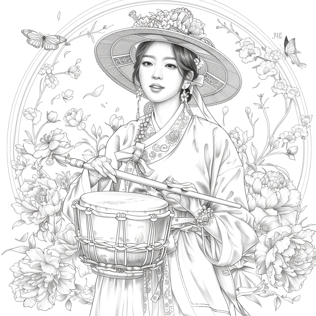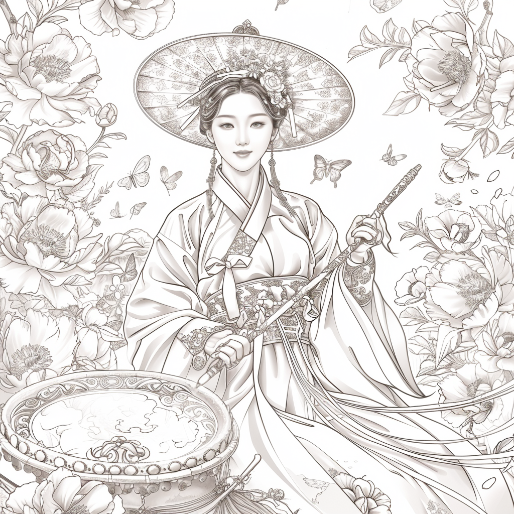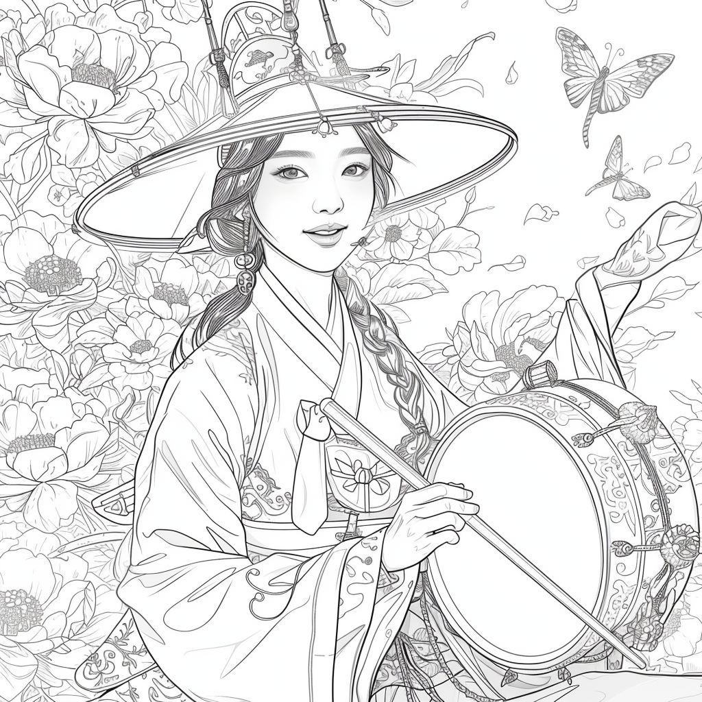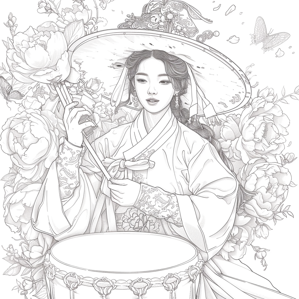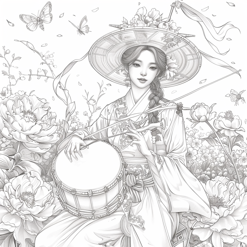 This captivating artwork depicts a graceful Korean woman in a flowing red hanbok, her elegance highlighted by intricate golden embroidery. She holds a traditional drum, poised to play, embodying both rhythm and harmony. Her braided hair is adorned with vivid flowers, while a grand, ornate hat frames her serene face. Surrounding her, peonies bloom in abundance, and butterflies flutter delicately, symbolizing beauty, vitality, and fleeting moments of joy. A celebration of tradition and femininity, this piece radiates cultural richness and timeless artistry.
