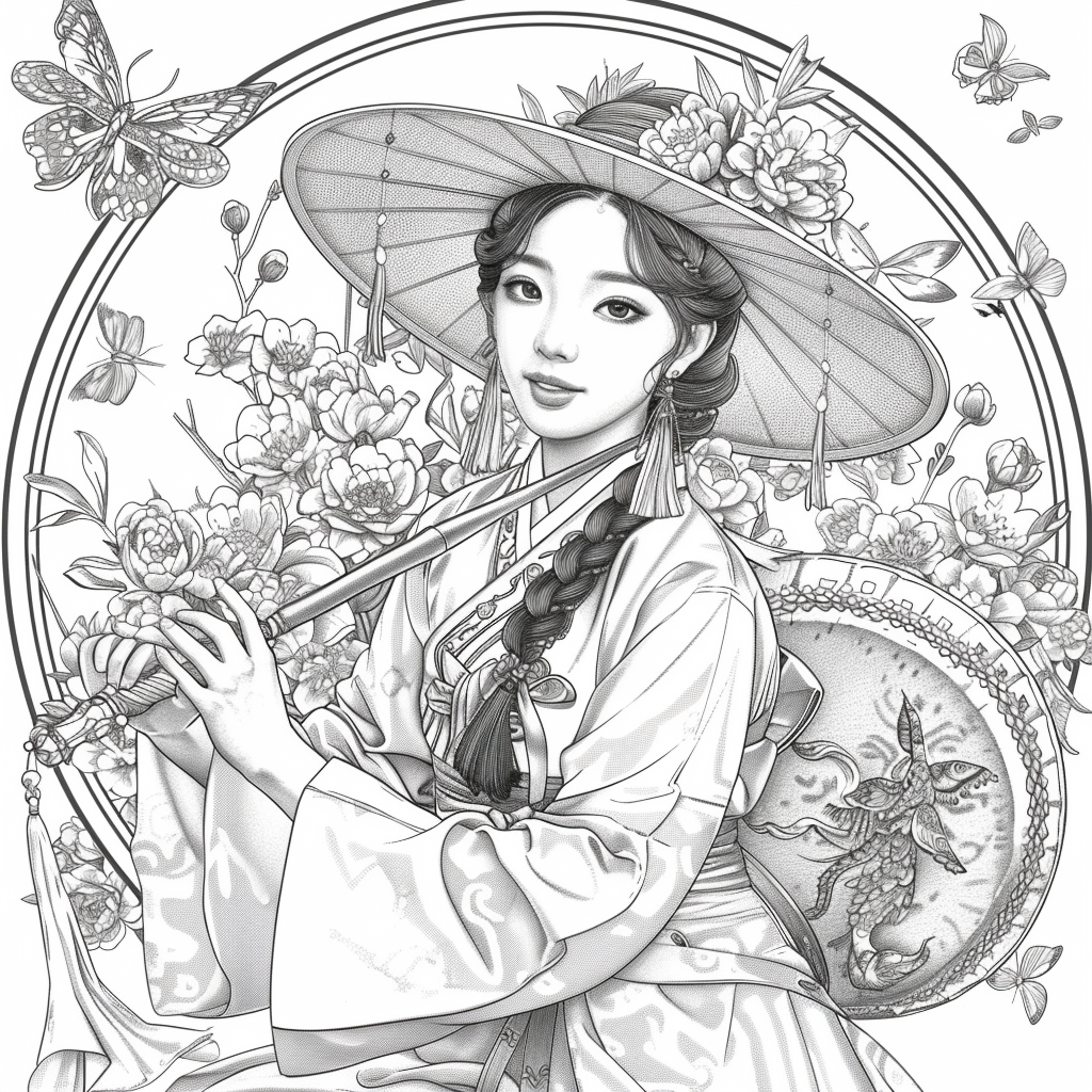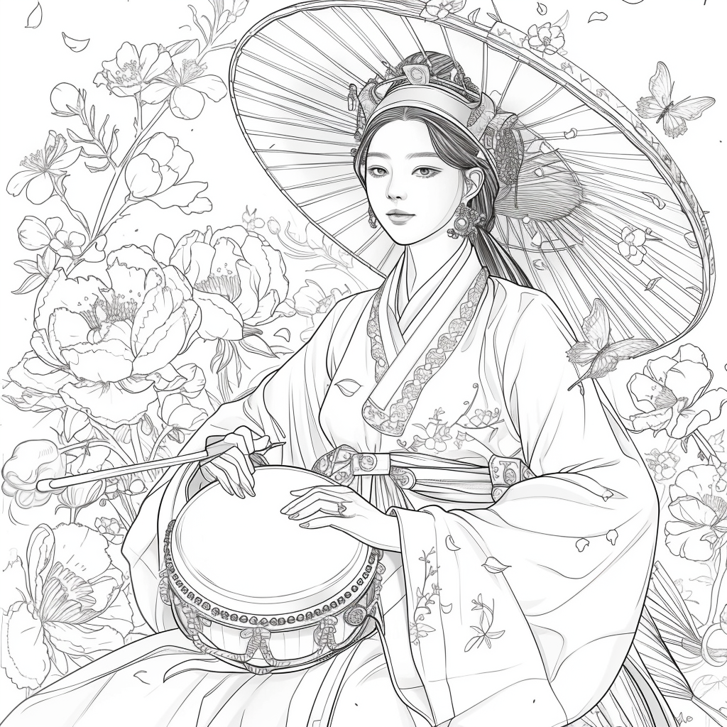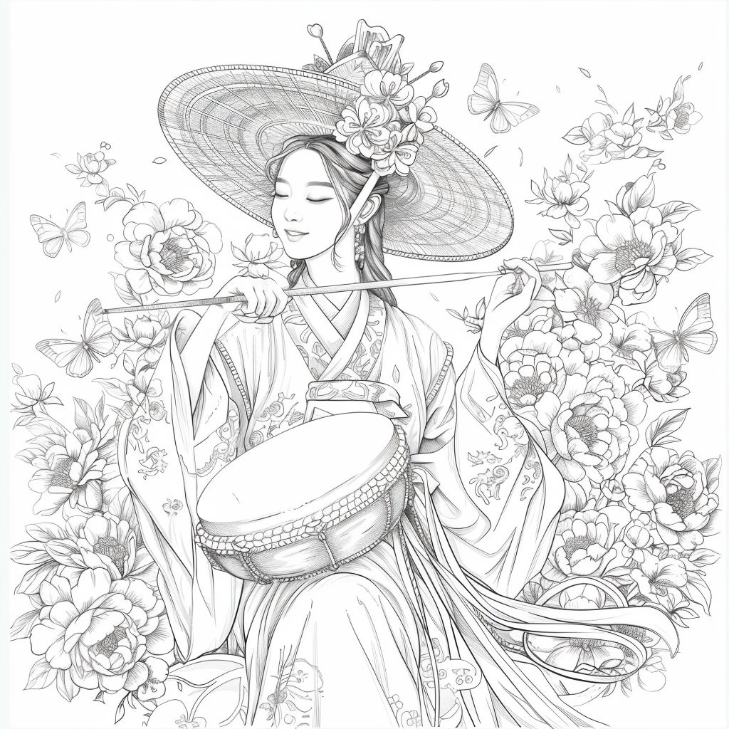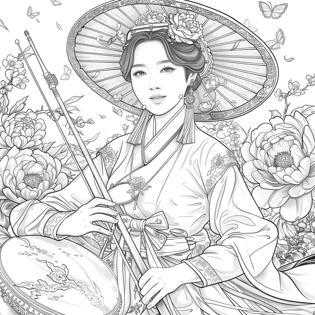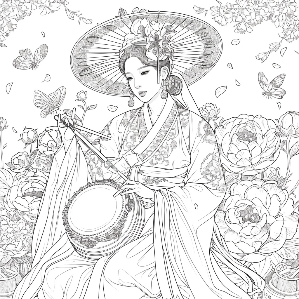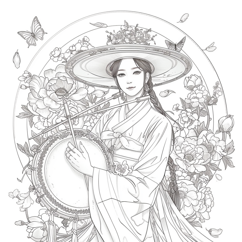 This captivating artwork depicts a graceful Korean woman in a flowing red hanbok, her elegance highlighted by intricate golden embroidery. She holds a traditional drum, poised to play, embodying both rhythm and harmony. Her braided hair is adorned with vivid flowers, while a grand, ornate hat frames her serene face. Surrounding her, peonies bloom in abundance, and butterflies flutter delicately, symbolizing beauty, vitality, and fleeting moments of joy. A celebration of tradition and femininity, this piece radiates cultural richness and timeless artistry.
