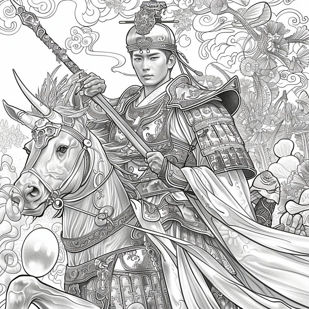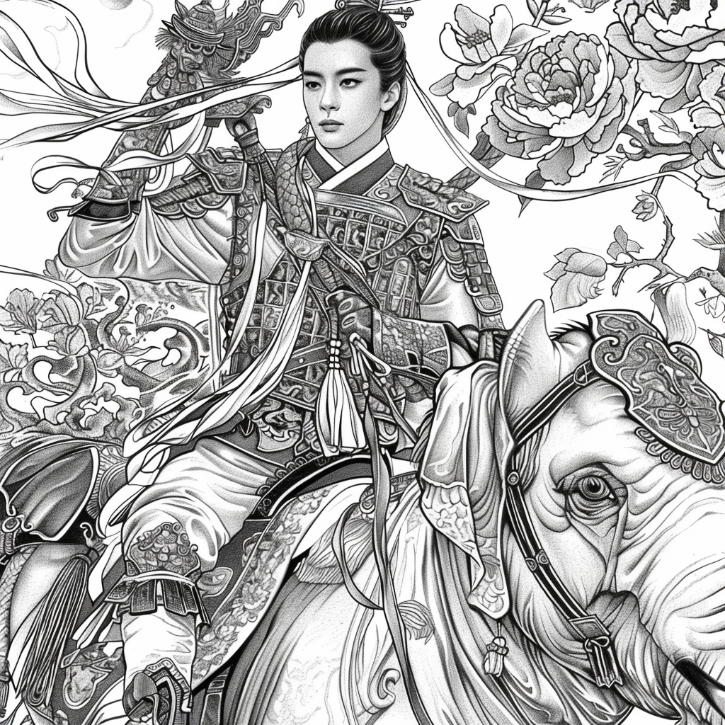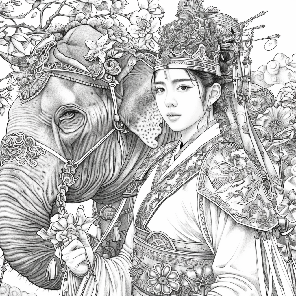 This mesmerizing artwork portrays a regal empress adorned in a richly embroidered hanbok, her attire glowing with layers of crimson, jade, and golden patterns. Her elaborate headdress is crowned with a dazzling array of flowers and jewels, symbolizing prosperity, beauty, and divine grace. The background bursts into life with vibrant blossoms and soft flowing textures, enhanced by floating bubbles that add an ethereal, dreamlike atmosphere. With her poised gaze and elegant presence, she embodies timeless majesty, cultural heritage, and the enchanting harmony of nature and royalty.