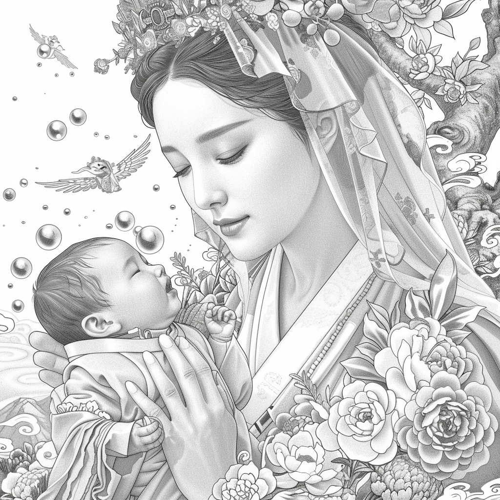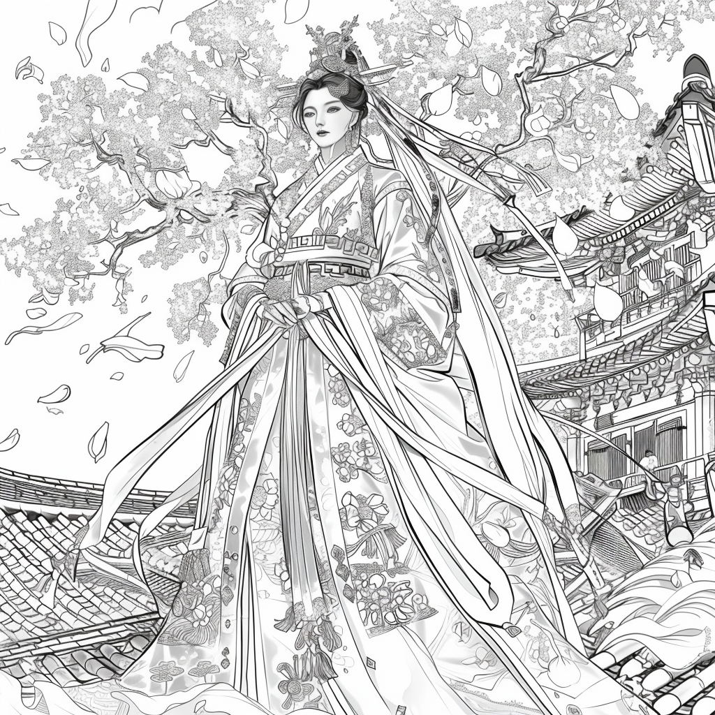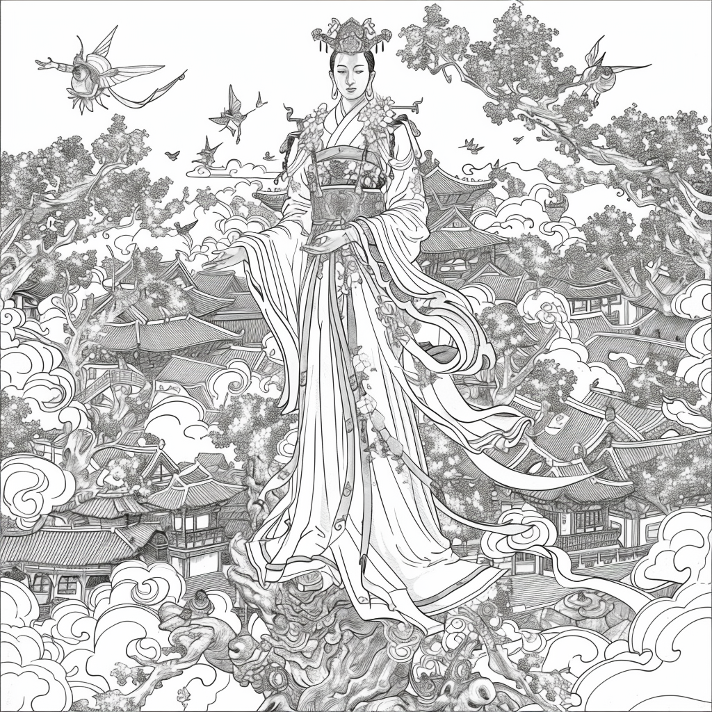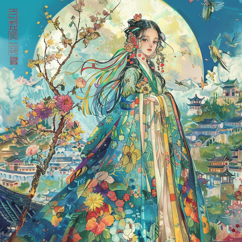 Bathed in the glow of a luminous full moon, a graceful empress stands atop a mountain village adorned with cherry blossoms, fluttering birds, and ancient tiled rooftops. Her hanbok flows like a tapestry of spring itself—bursting with peonies, lotuses, and celestial blues—each petal and thread echoing rebirth, serenity, and divine femininity. Ribboned strands dance in the breeze as birds soar skyward, symbolizing freedom and renewal. The backdrop of mountains and temples grounds this ethereal vision in the harmony of nature and tradition.