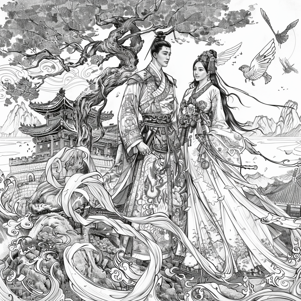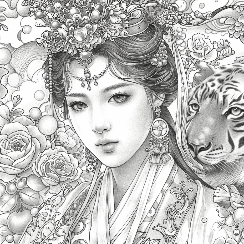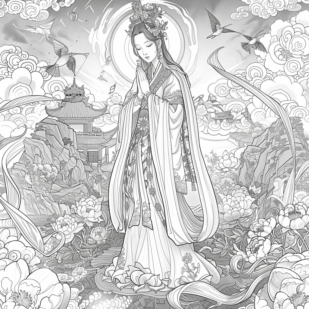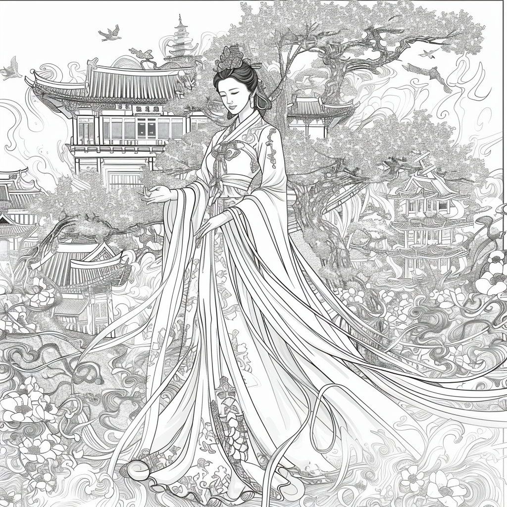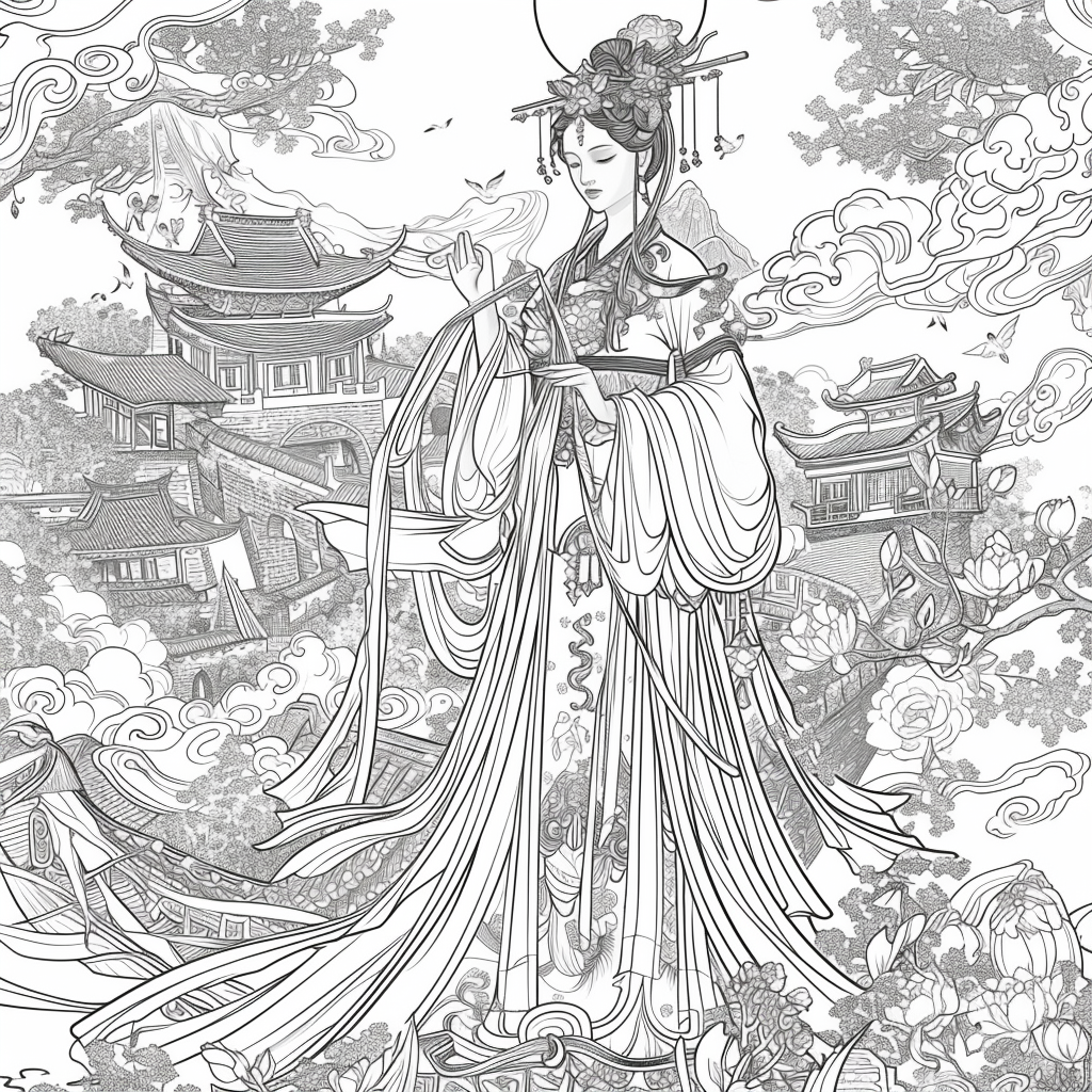 Bathed in the glow of a luminous full moon, a graceful empress stands atop a mountain village adorned with cherry blossoms, fluttering birds, and ancient tiled rooftops. Her hanbok flows like a tapestry of spring itself—bursting with peonies, lotuses, and celestial blues—each petal and thread echoing rebirth, serenity, and divine femininity. Ribboned strands dance in the breeze as birds soar skyward, symbolizing freedom and renewal. The backdrop of mountains and temples grounds this ethereal vision in the harmony of nature and tradition.
