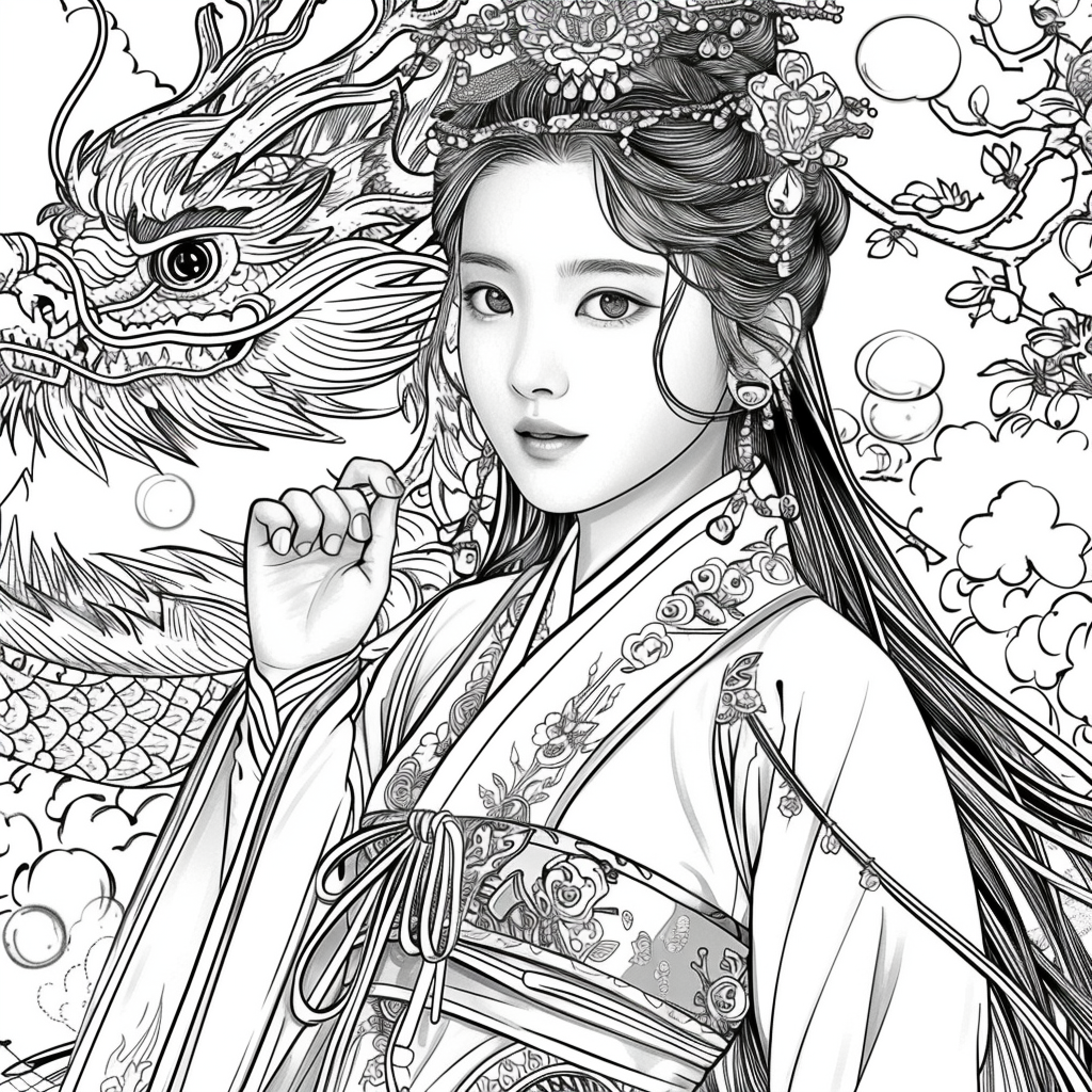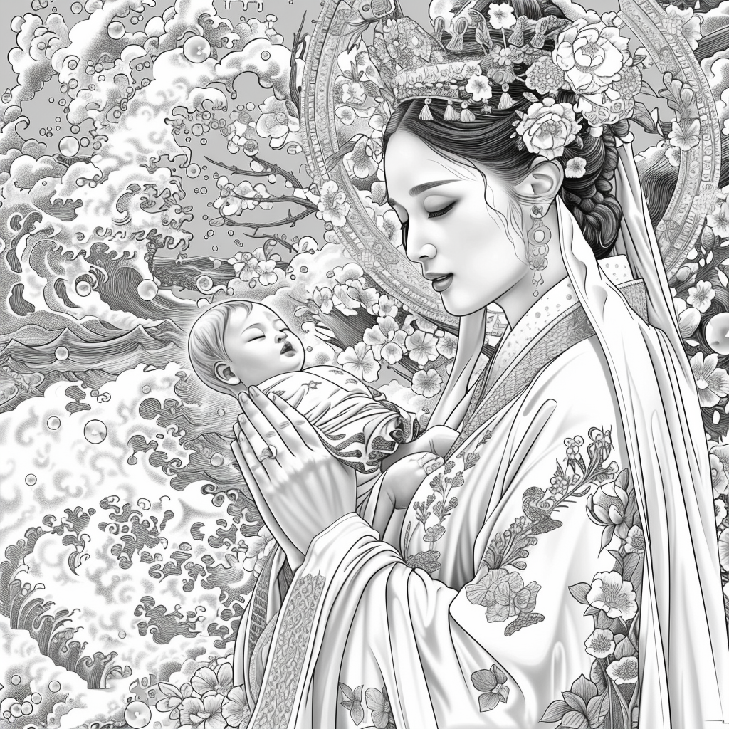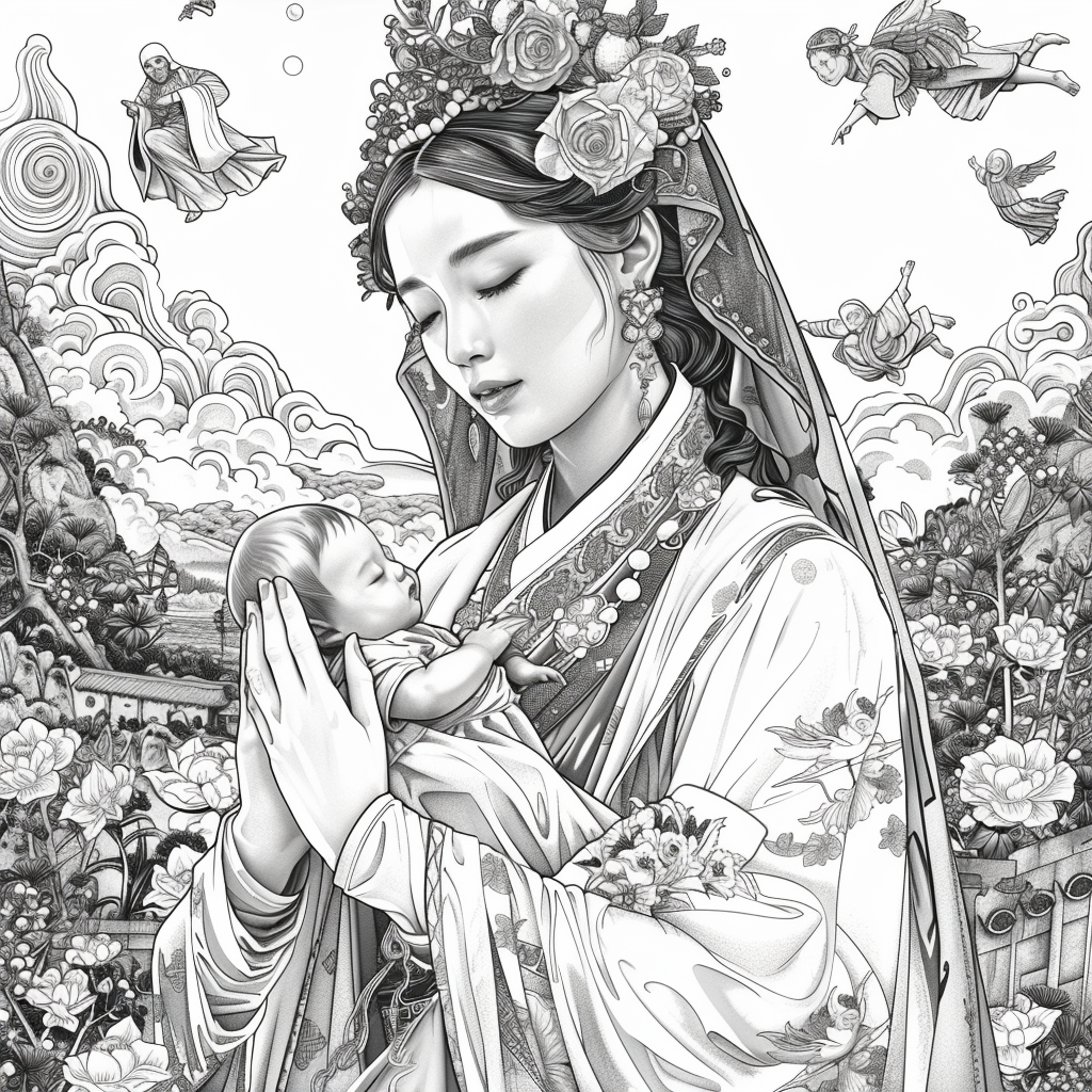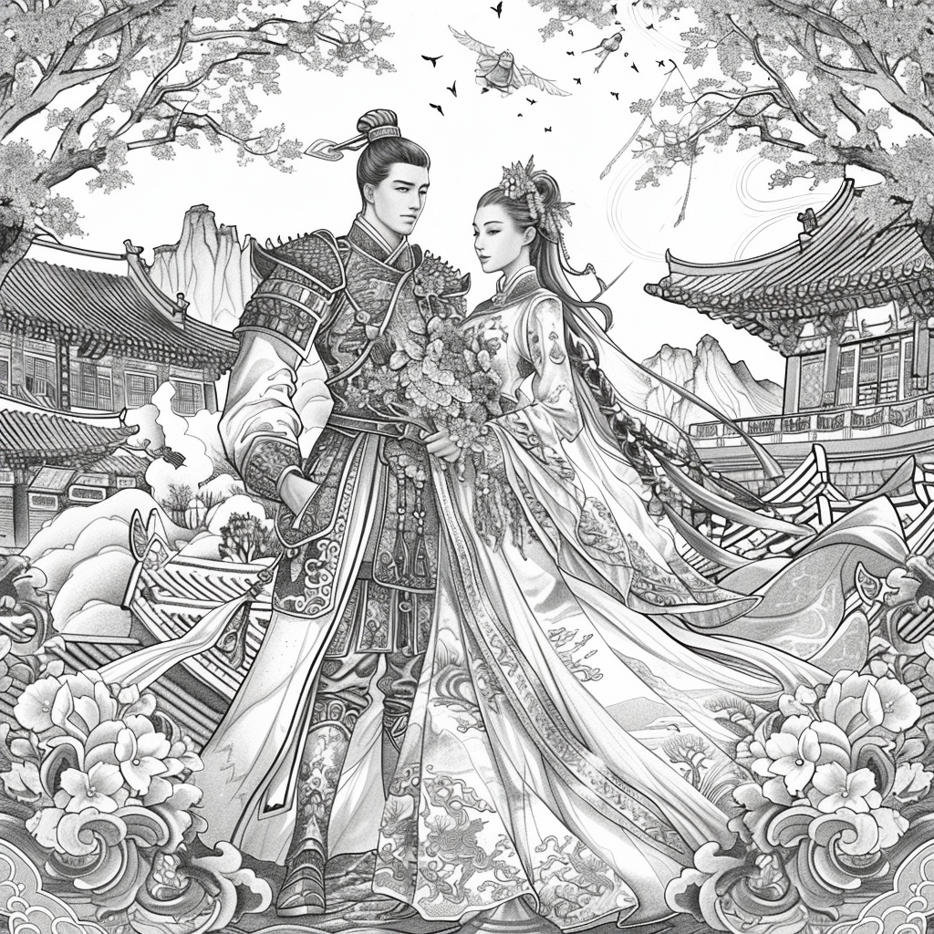 Bathed in the glow of a luminous full moon, a graceful empress stands atop a mountain village adorned with cherry blossoms, fluttering birds, and ancient tiled rooftops. Her hanbok flows like a tapestry of spring itself—bursting with peonies, lotuses, and celestial blues—each petal and thread echoing rebirth, serenity, and divine femininity. Ribboned strands dance in the breeze as birds soar skyward, symbolizing freedom and renewal. The backdrop of mountains and temples grounds this ethereal vision in the harmony of nature and tradition.