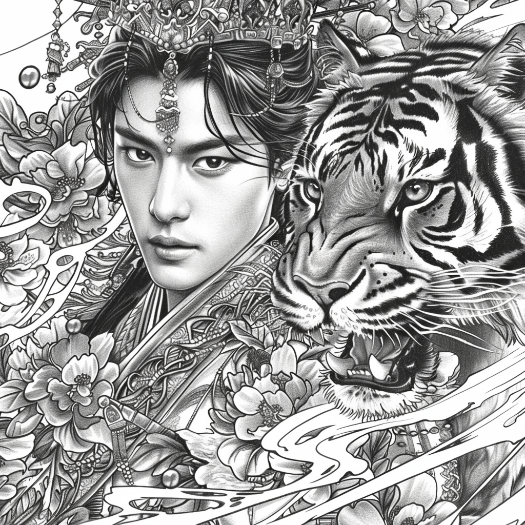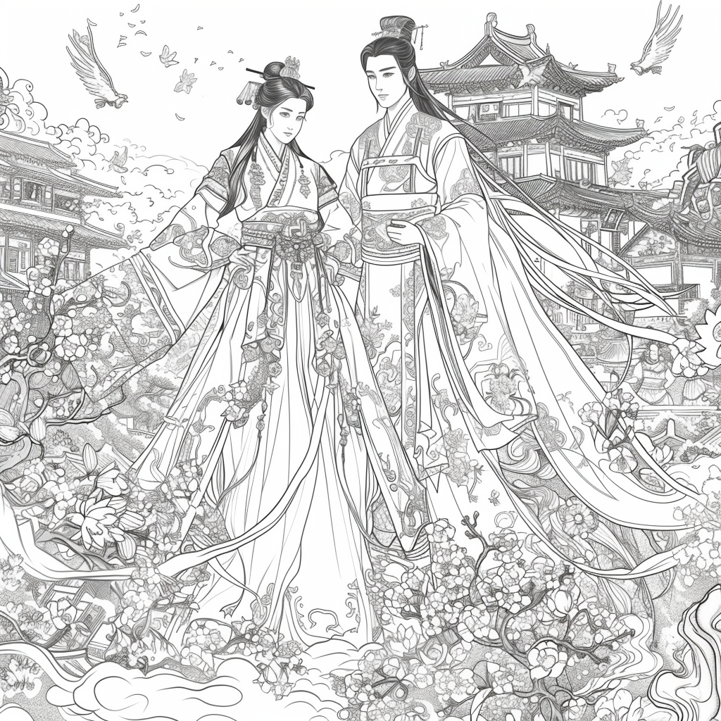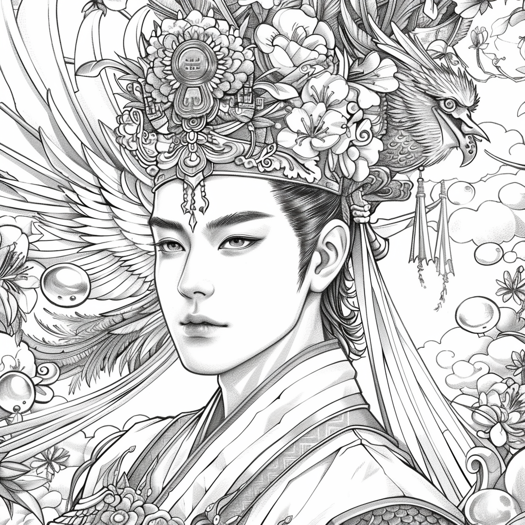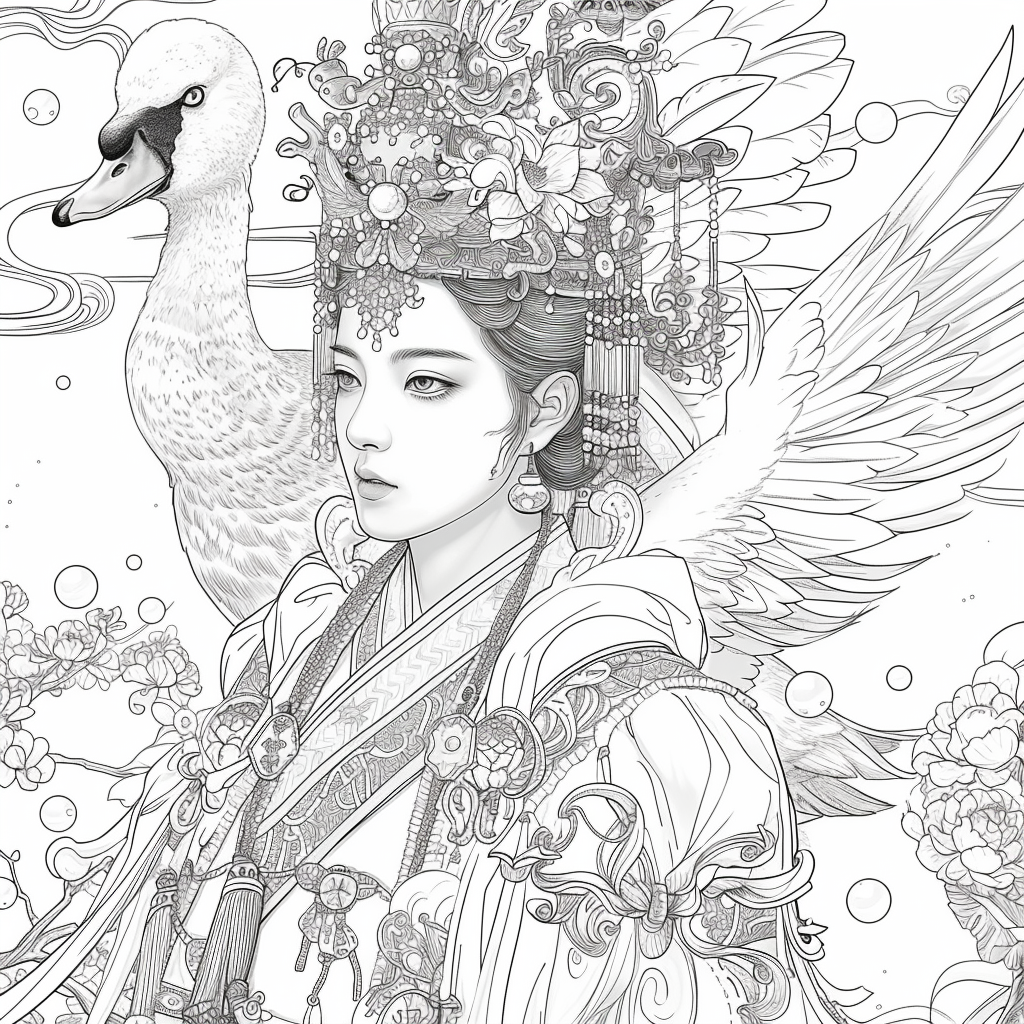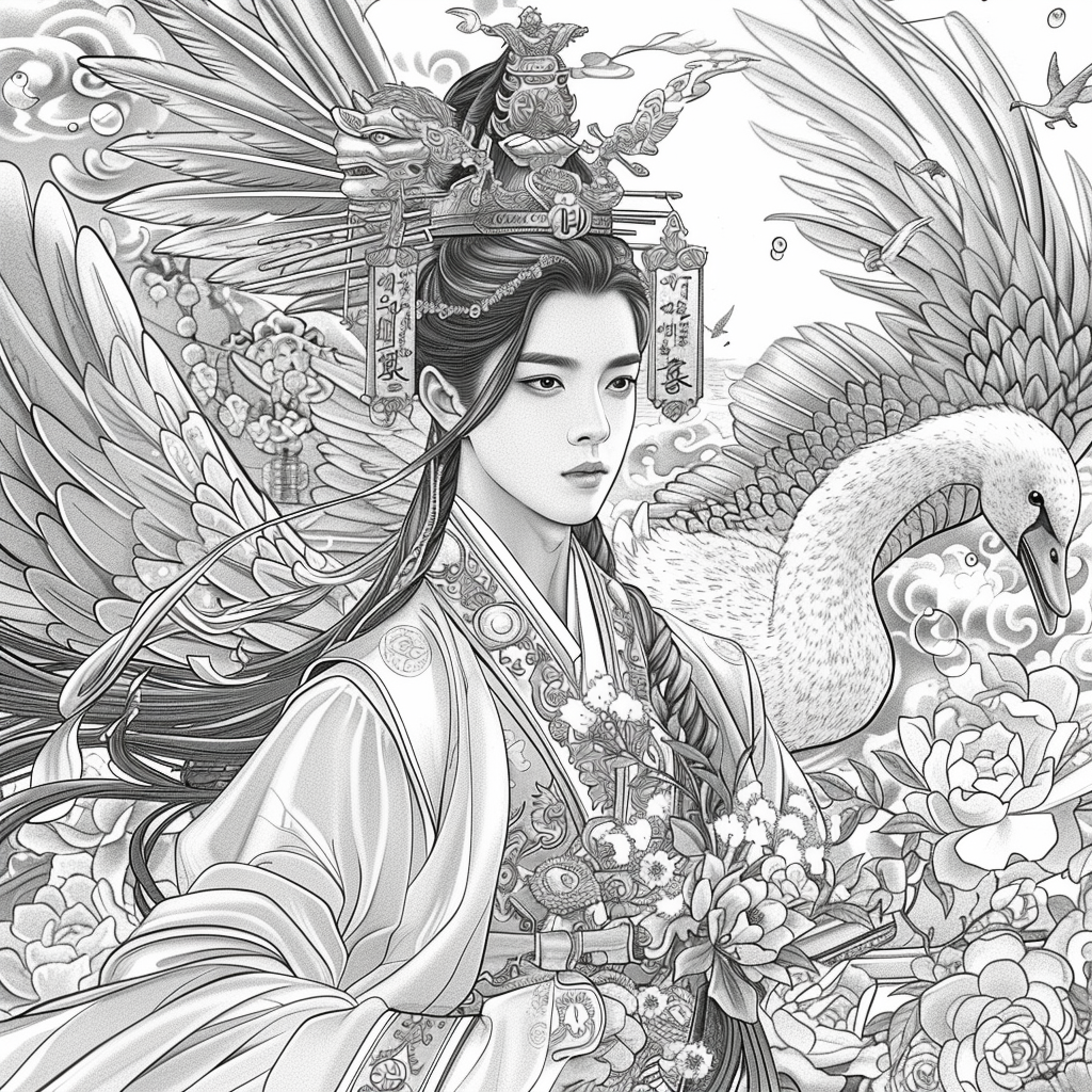 Bathed in the glow of a luminous full moon, a graceful empress stands atop a mountain village adorned with cherry blossoms, fluttering birds, and ancient tiled rooftops. Her hanbok flows like a tapestry of spring itself—bursting with peonies, lotuses, and celestial blues—each petal and thread echoing rebirth, serenity, and divine femininity. Ribboned strands dance in the breeze as birds soar skyward, symbolizing freedom and renewal. The backdrop of mountains and temples grounds this ethereal vision in the harmony of nature and tradition.
