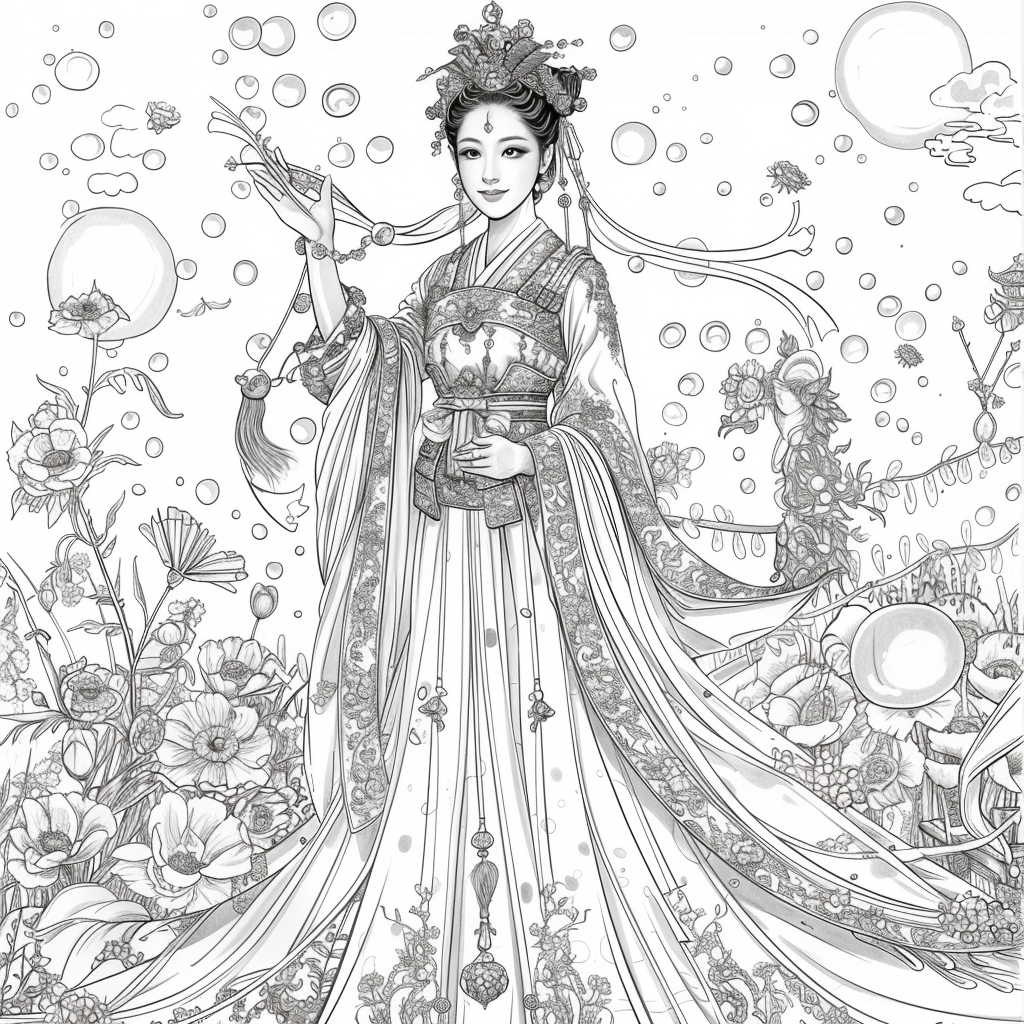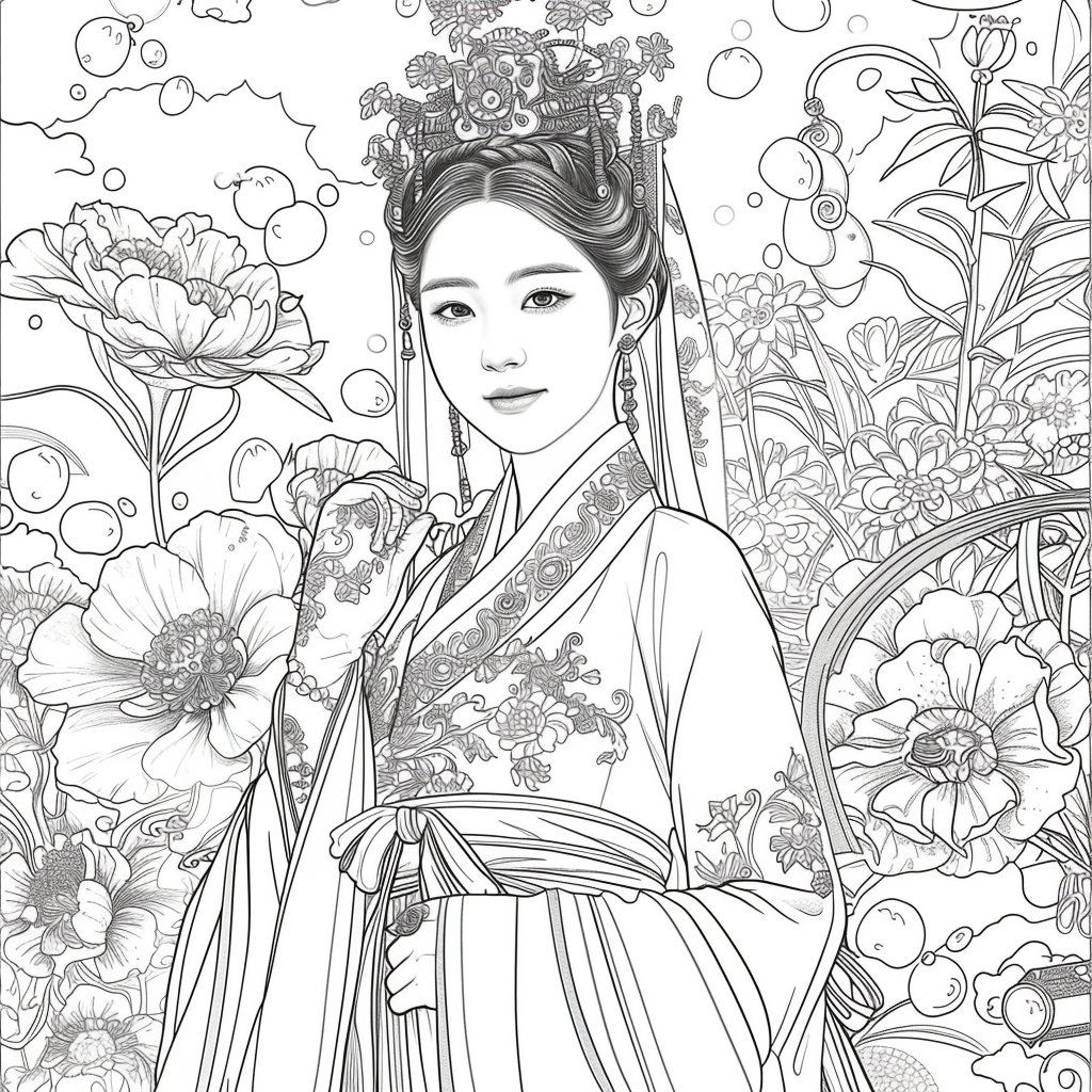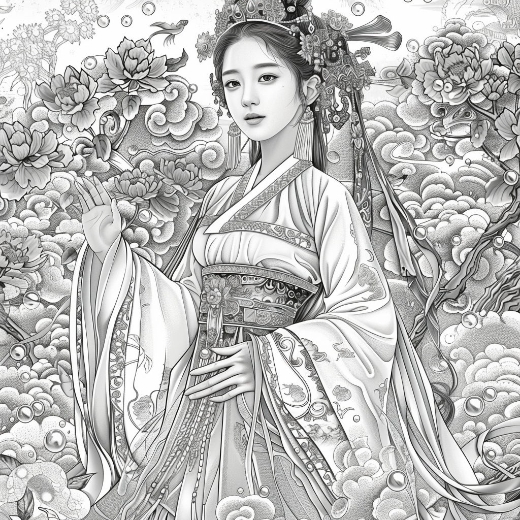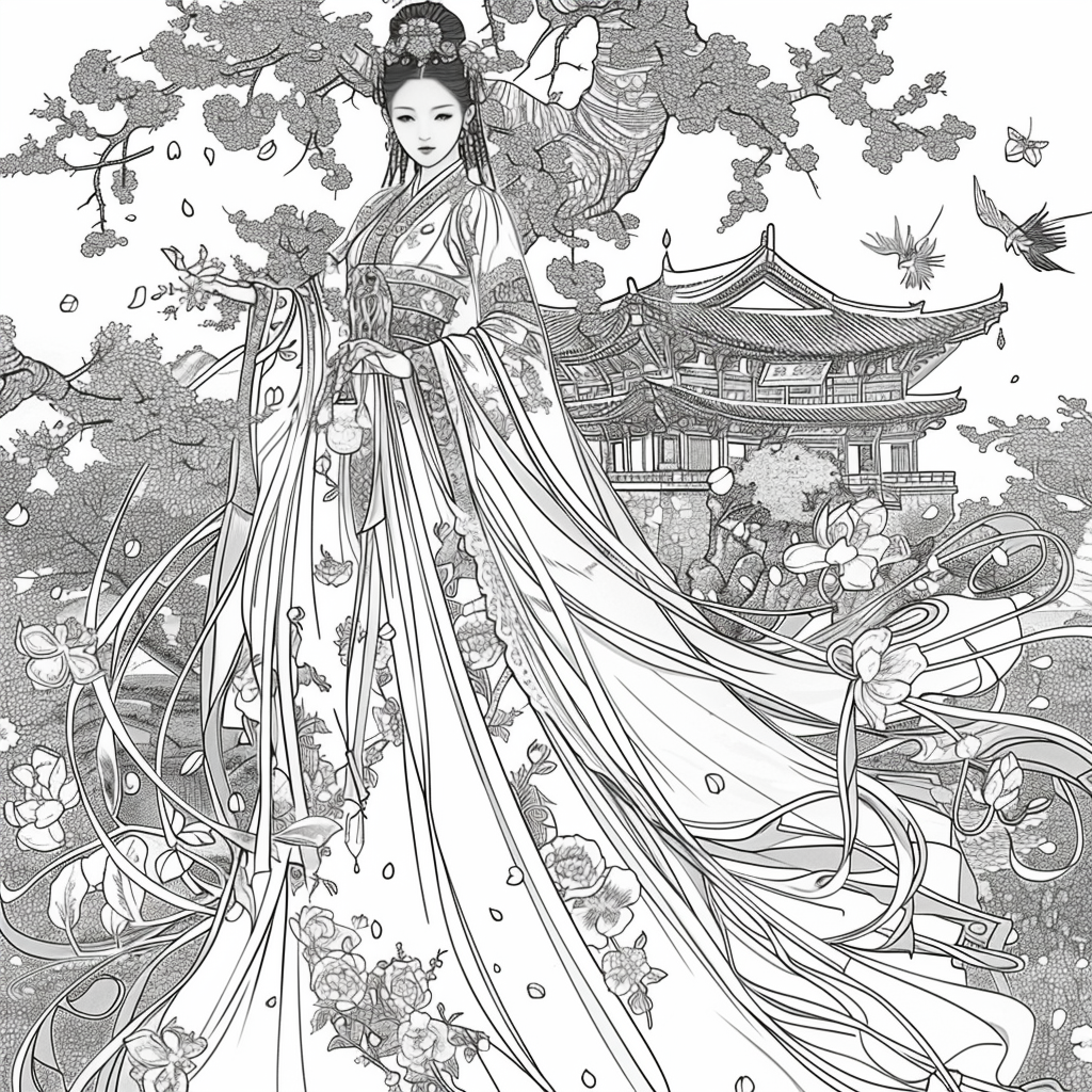 Amidst a flourishing paradise of blossoms and soaring birds, the empress steps gracefully through a dreamlike landscape. Draped in flowing silk robes of turquoise, crimson, and gold, her gown blooms with embroidered flowers that merge seamlessly with the living garden around her. Cherry blossoms drift through the air, carried by the breeze, as birds in vibrant flight accompany her presence. Behind her, an ornate palace rises among ancient trees, symbolizing the harmony of human artistry and natural wonder. With long flowing hair adorned in floral ornaments, she embodies beauty, renewal, and the eternal spirit of spring. This artwork radiates serenity and majesty, as if capturing the very soul of a goddess walking within a painting of paradise.