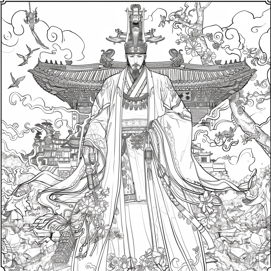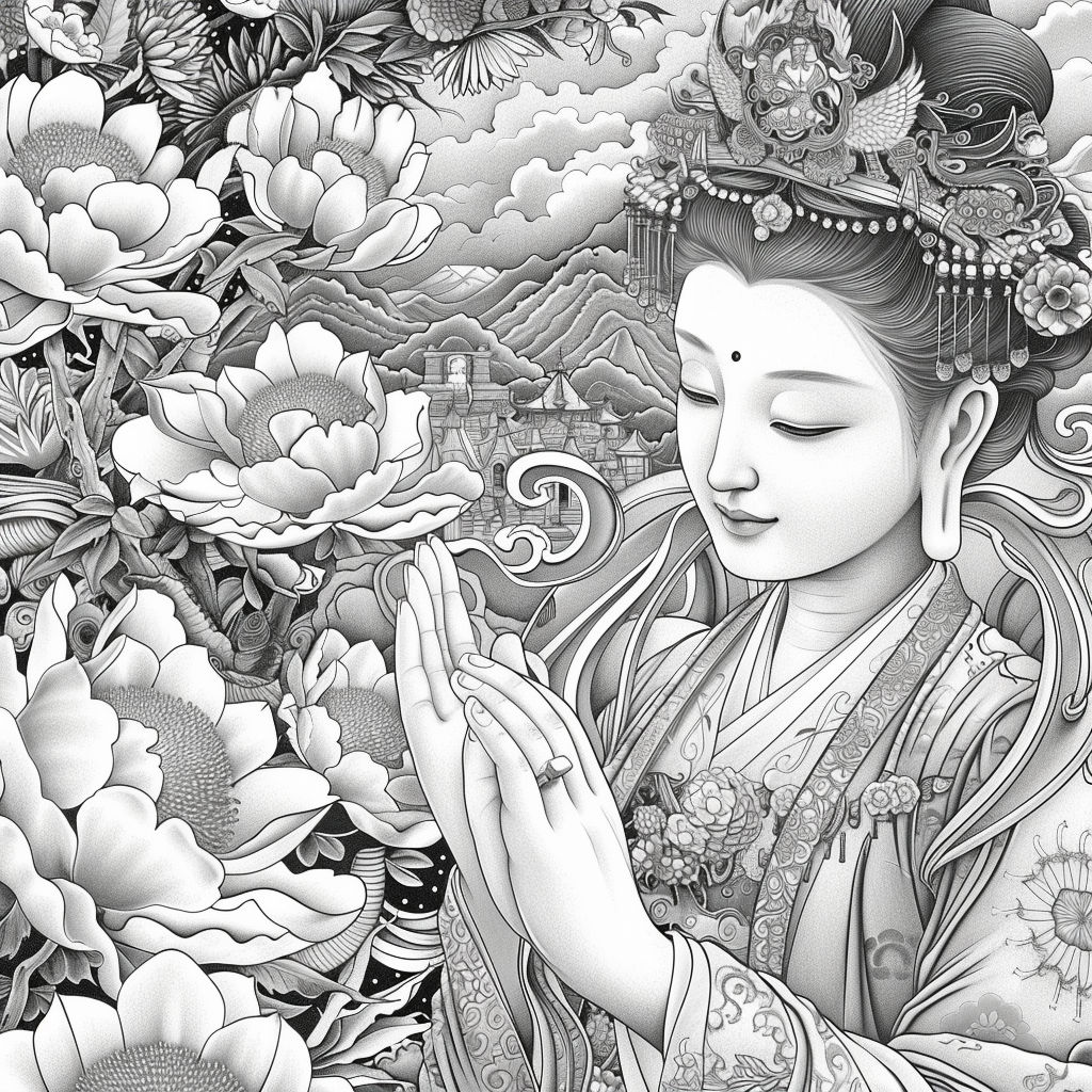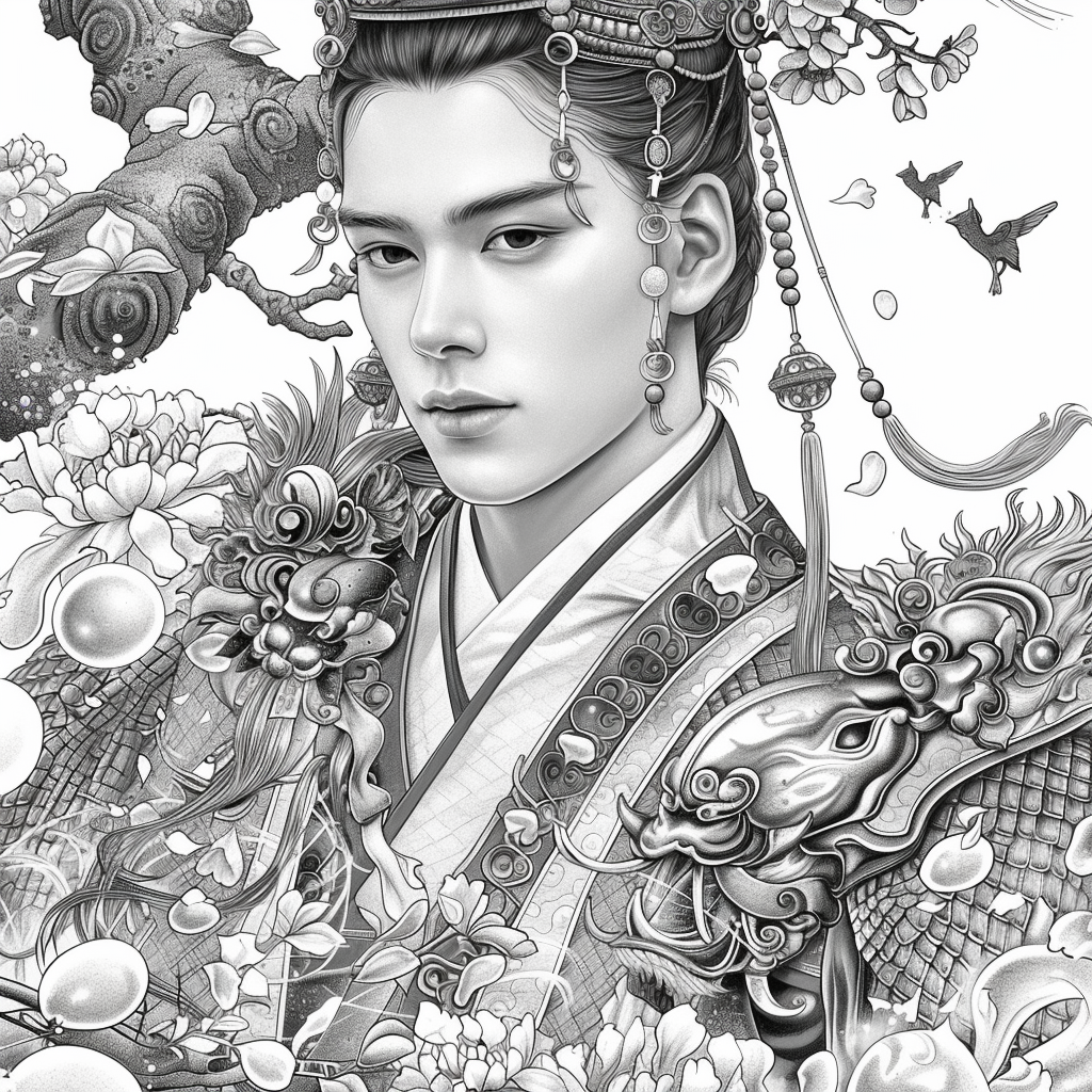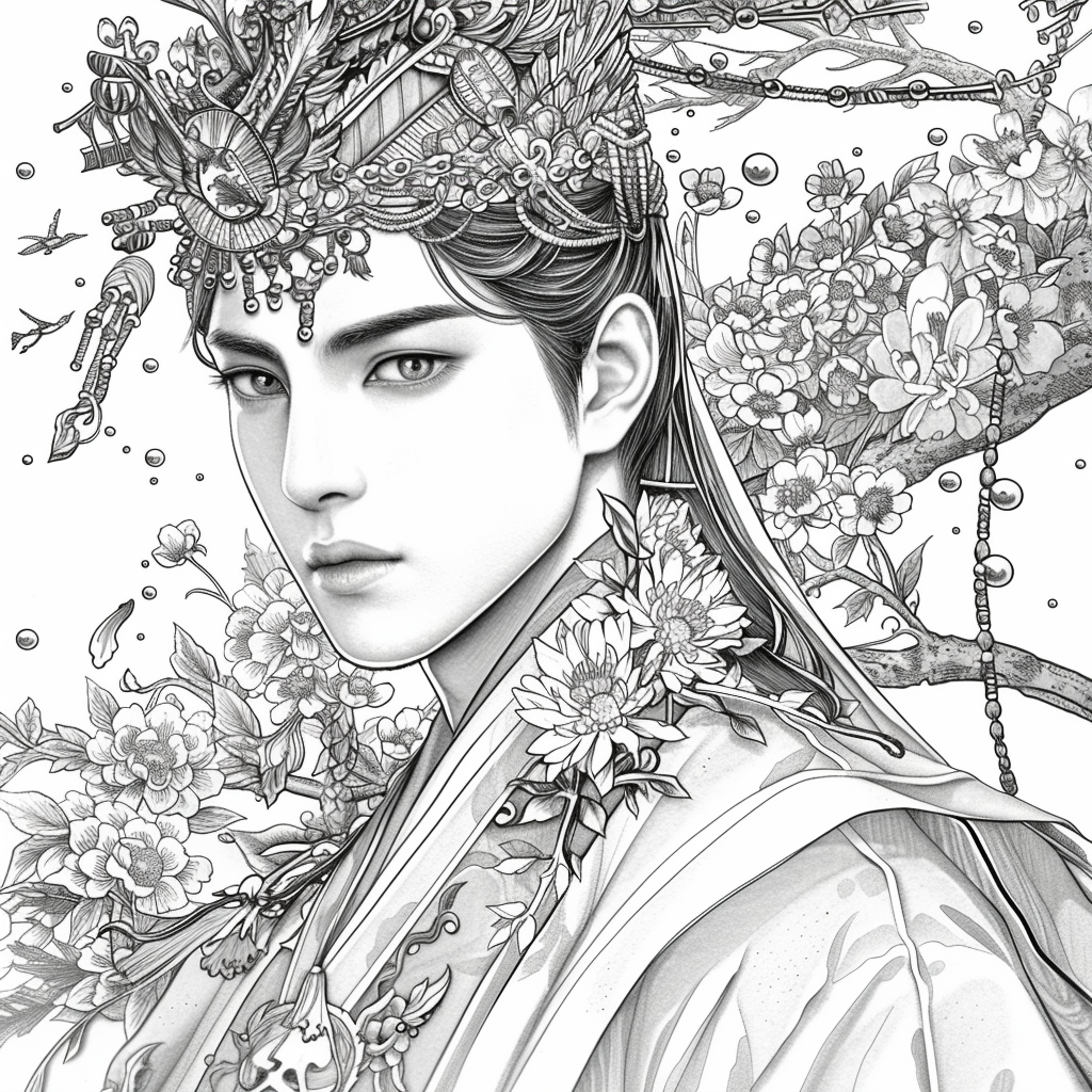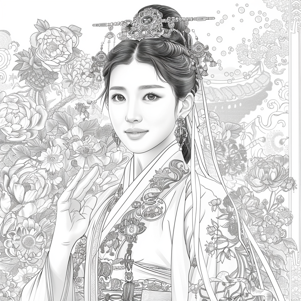 Amidst a flourishing paradise of blossoms and soaring birds, the empress steps gracefully through a dreamlike landscape. Draped in flowing silk robes of turquoise, crimson, and gold, her gown blooms with embroidered flowers that merge seamlessly with the living garden around her. Cherry blossoms drift through the air, carried by the breeze, as birds in vibrant flight accompany her presence. Behind her, an ornate palace rises among ancient trees, symbolizing the harmony of human artistry and natural wonder. With long flowing hair adorned in floral ornaments, she embodies beauty, renewal, and the eternal spirit of spring. This artwork radiates serenity and majesty, as if capturing the very soul of a goddess walking within a painting of paradise.