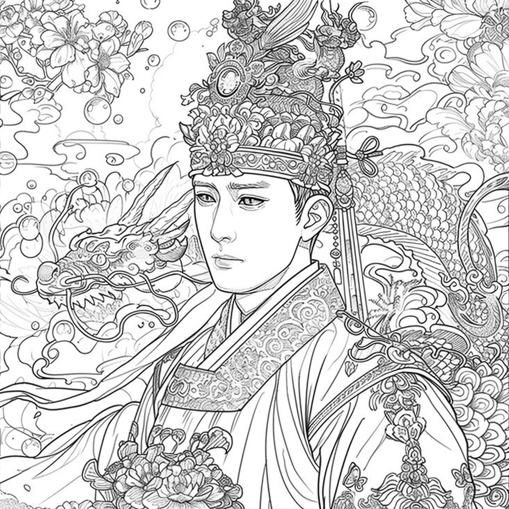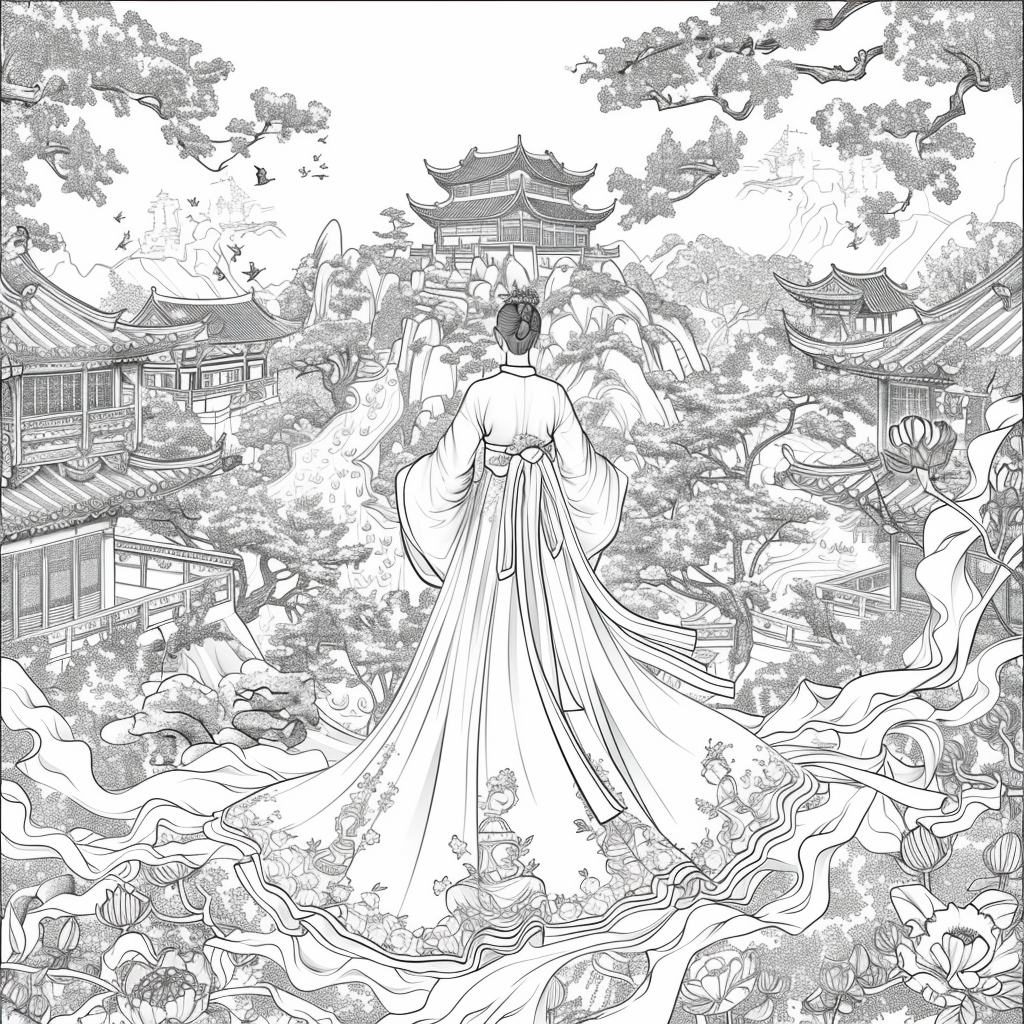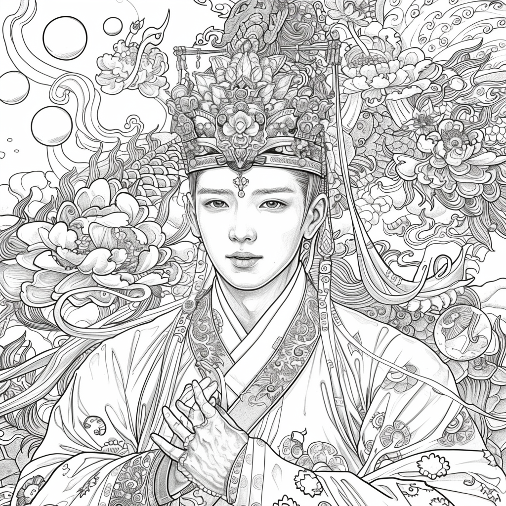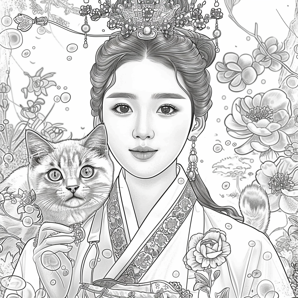 This enchanting artwork portrays a princess in a pastel hanbok adorned with floral patterns, seated amidst a dreamlike world of blossoms, butterflies, and shimmering bubbles. With elegance and serenity, she balances a small cat upon her finger, symbolizing playfulness and companionship. Her ornate headdress, adorned with jewels and flowers, glimmers with ethereal light, enhancing the fantasy atmosphere. The composition is alive with vibrant colors and magical elements, blending tradition with imagination. It embodies both innocence and wonder, presenting the princess as a bridge between earthly grace and otherworldly fantasy.
