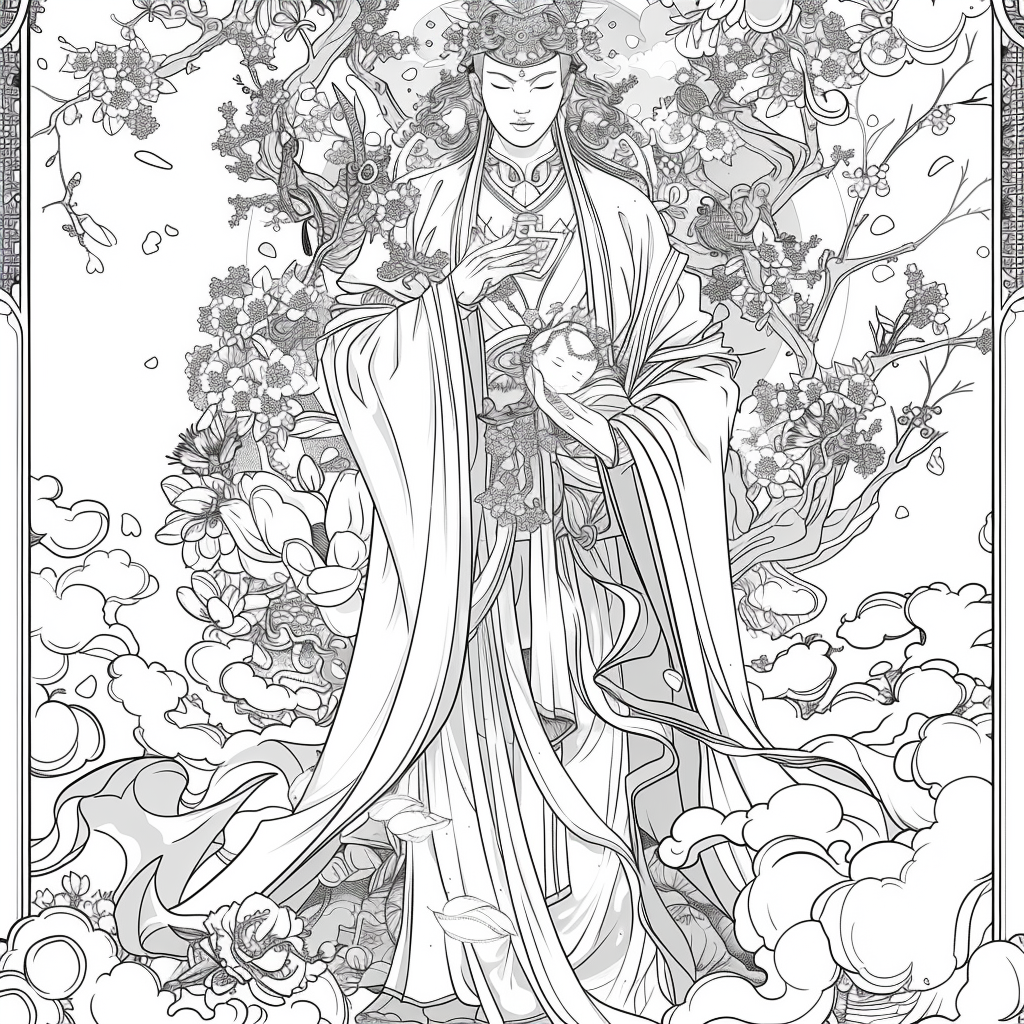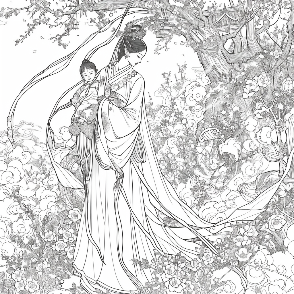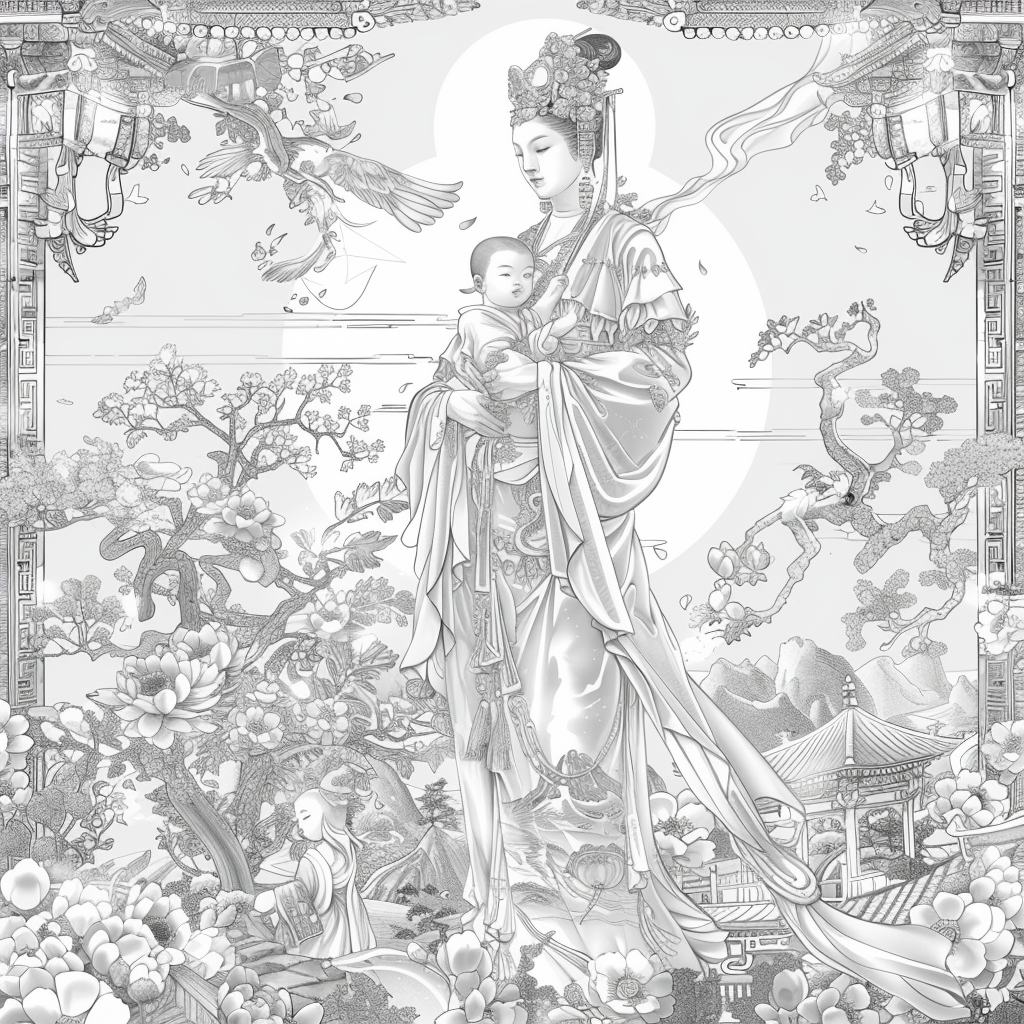 A serene and divine artwork depicting a graceful mother holding her sleeping child amidst a garden of blooming peonies and lotus flowers. Dressed in an elaborately embroidered hanbok with golden accents, she radiates warmth and maternal love. A luminous halo encircles her head, symbolizing purity, grace, and protection. In the background, mountains rise majestically, while heavenly figures and flowing clouds add a celestial atmosphere. The harmonious blend of soft pastel tones and intricate detailing captures the sacred bond between mother and child, embodying themes of love, blessing, and new beginnings.