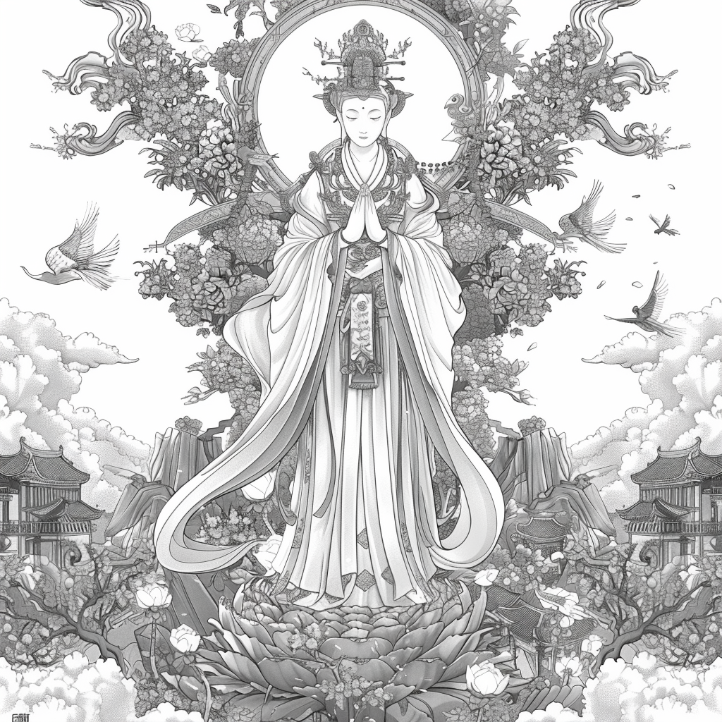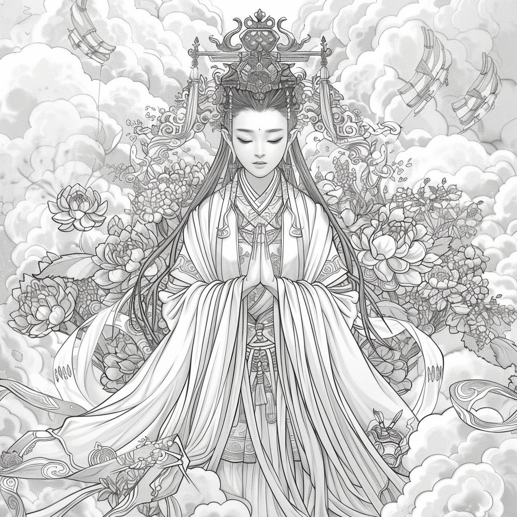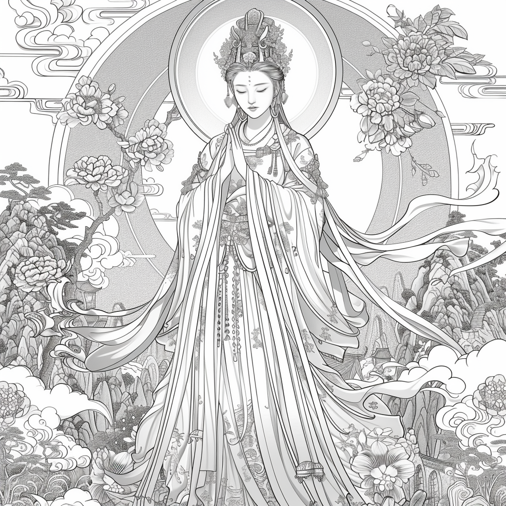 A serene and divine artwork depicting a graceful mother holding her sleeping child amidst a garden of blooming peonies and lotus flowers. Dressed in an elaborately embroidered hanbok with golden accents, she radiates warmth and maternal love. A luminous halo encircles her head, symbolizing purity, grace, and protection. In the background, mountains rise majestically, while heavenly figures and flowing clouds add a celestial atmosphere. The harmonious blend of soft pastel tones and intricate detailing captures the sacred bond between mother and child, embodying themes of love, blessing, and new beginnings.
