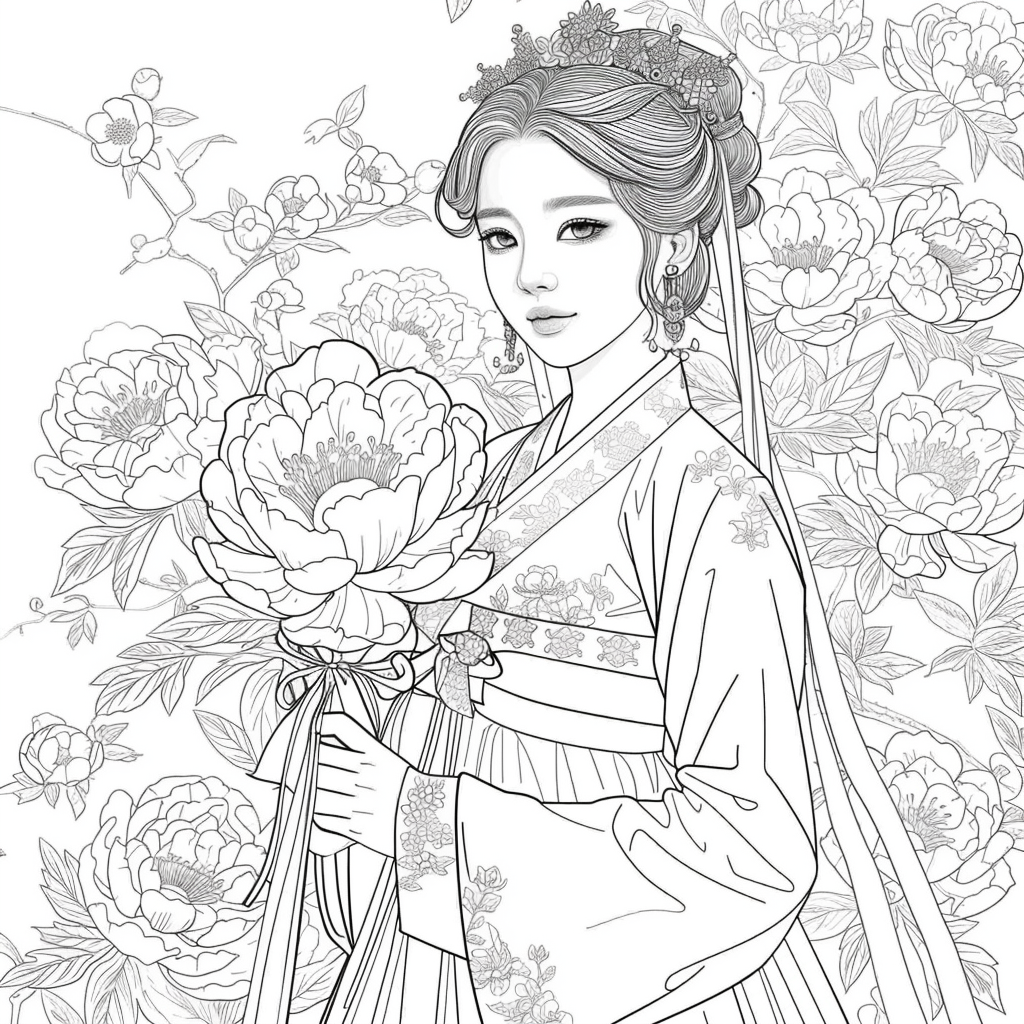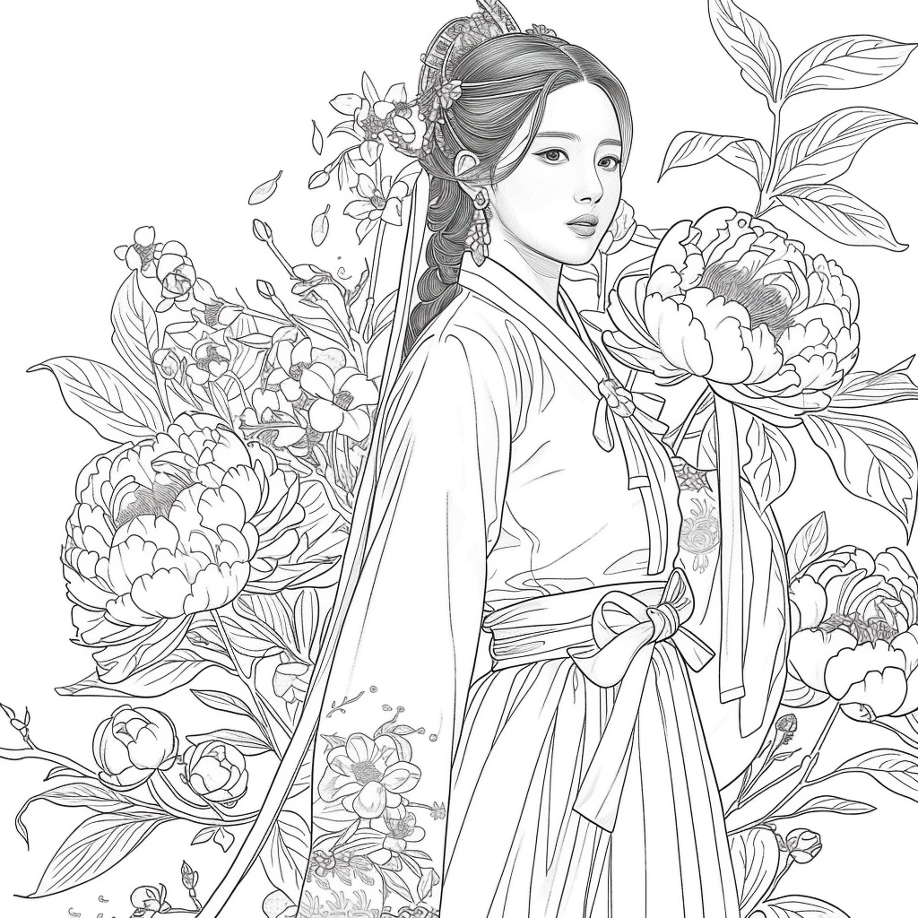 A graceful young woman in traditional Korean hanbok is portrayed in serene profile, her figure radiating elegance and poise. Her golden-yellow attire is richly embroidered with delicate floral patterns, harmonizing with the vibrant blossoms woven into her intricately styled hair. The background is adorned with sunflowers, wildflowers, and soft botanical motifs, creating a dreamlike canvas of natural beauty. The balance of warm yellows and turquoise tones evokes a timeless harmony between tradition, femininity, and the vibrant life of blooming flowers.