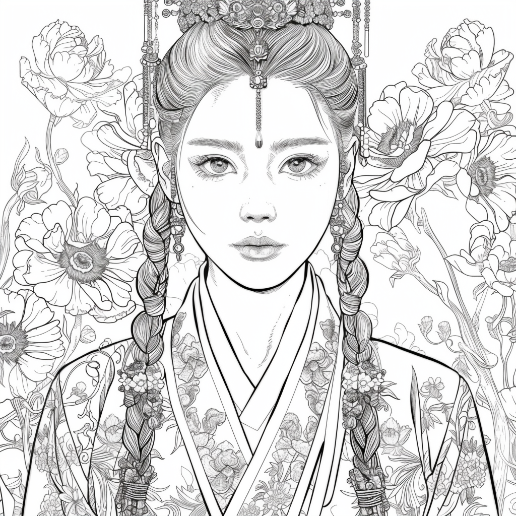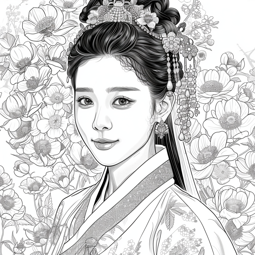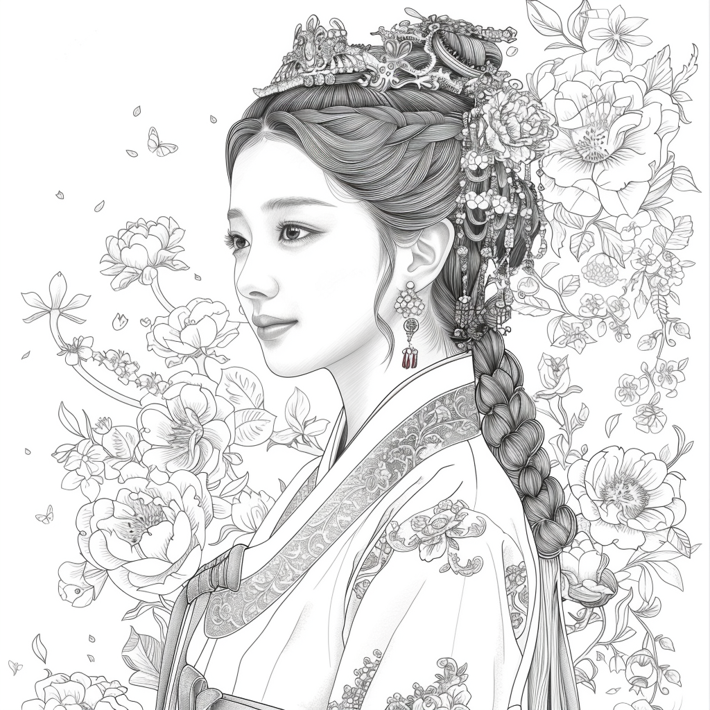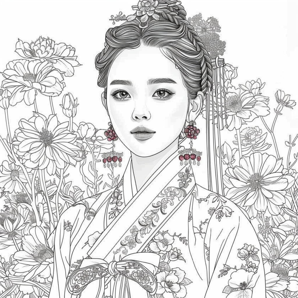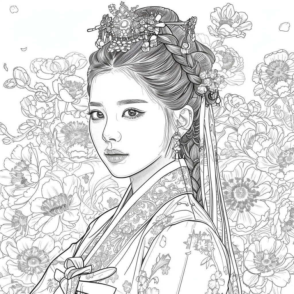 This artwork portrays a stunning young woman in a deep blue hanbok embroidered with intricate floral patterns, symbolizing elegance and prosperity. Her braided hair is adorned with a golden crown and jeweled ornaments, richly decorated with blossoms and colorful beads. She gazes with serene intensity, embodying both delicacy and quiet strength. Behind her, golden patterns shimmer against a backdrop of blooming peonies and wildflowers, creating a harmonious fusion of luxury and nature’s splendor. The composition radiates timeless beauty, royal dignity, and cultural pride.