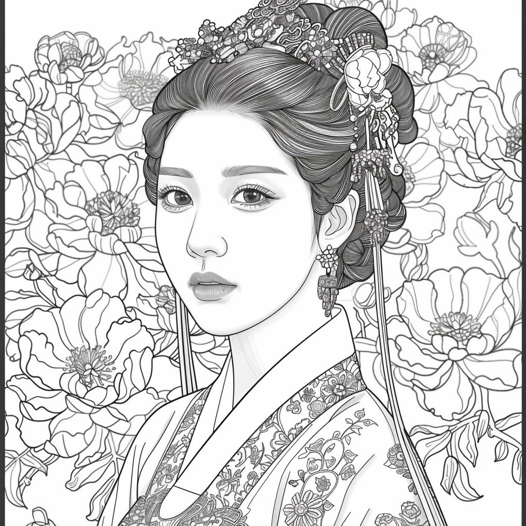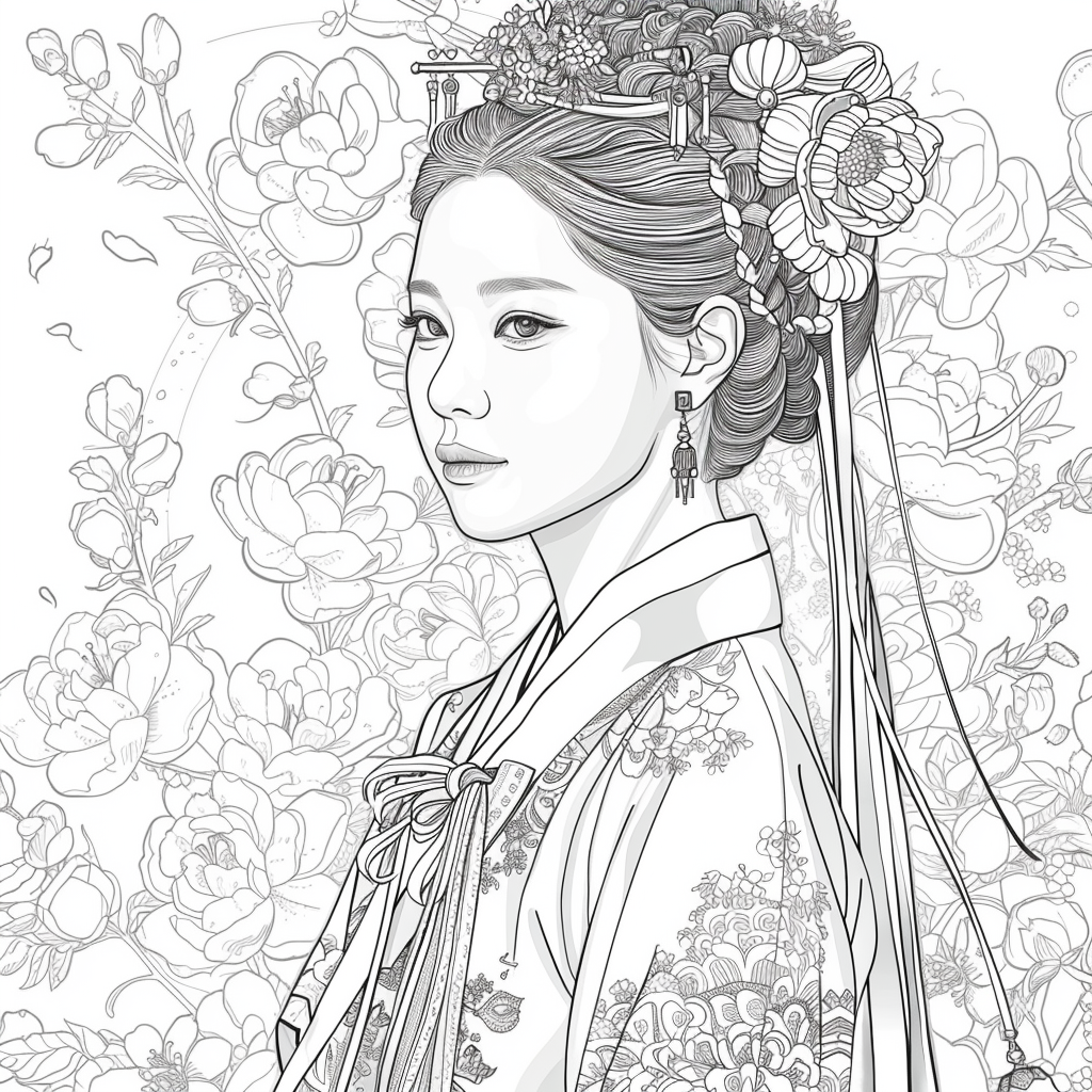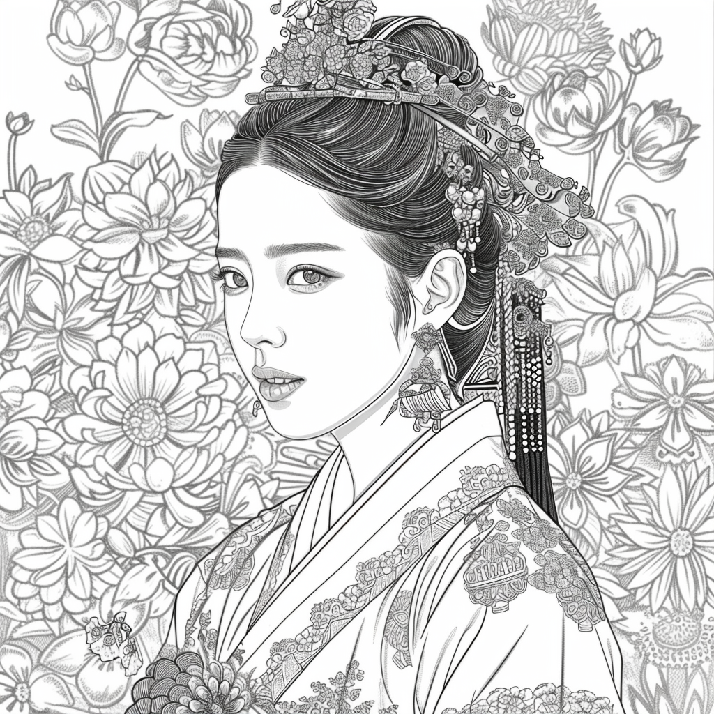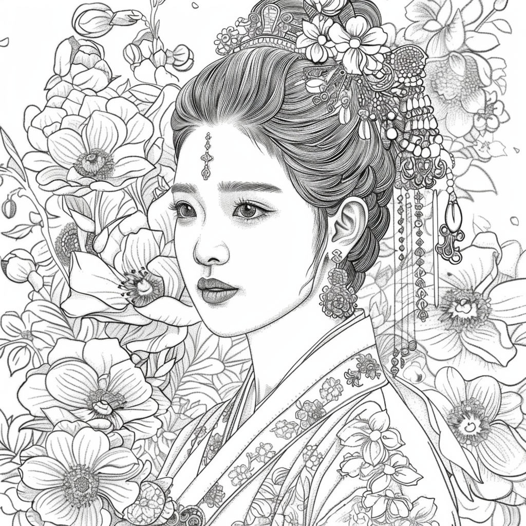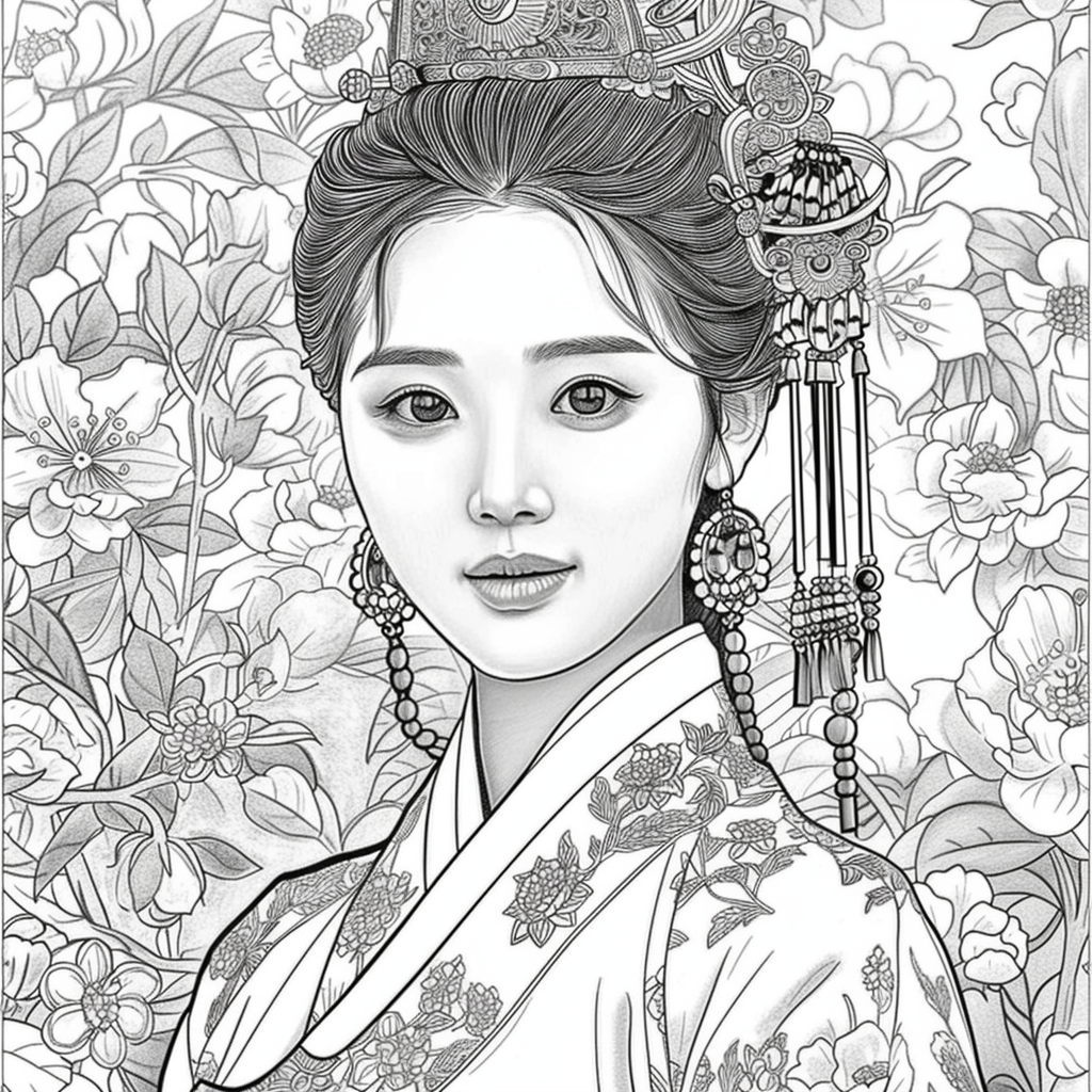 This artwork portrays a stunning young woman in a deep blue hanbok embroidered with intricate floral patterns, symbolizing elegance and prosperity. Her braided hair is adorned with a golden crown and jeweled ornaments, richly decorated with blossoms and colorful beads. She gazes with serene intensity, embodying both delicacy and quiet strength. Behind her, golden patterns shimmer against a backdrop of blooming peonies and wildflowers, creating a harmonious fusion of luxury and nature’s splendor. The composition radiates timeless beauty, royal dignity, and cultural pride.