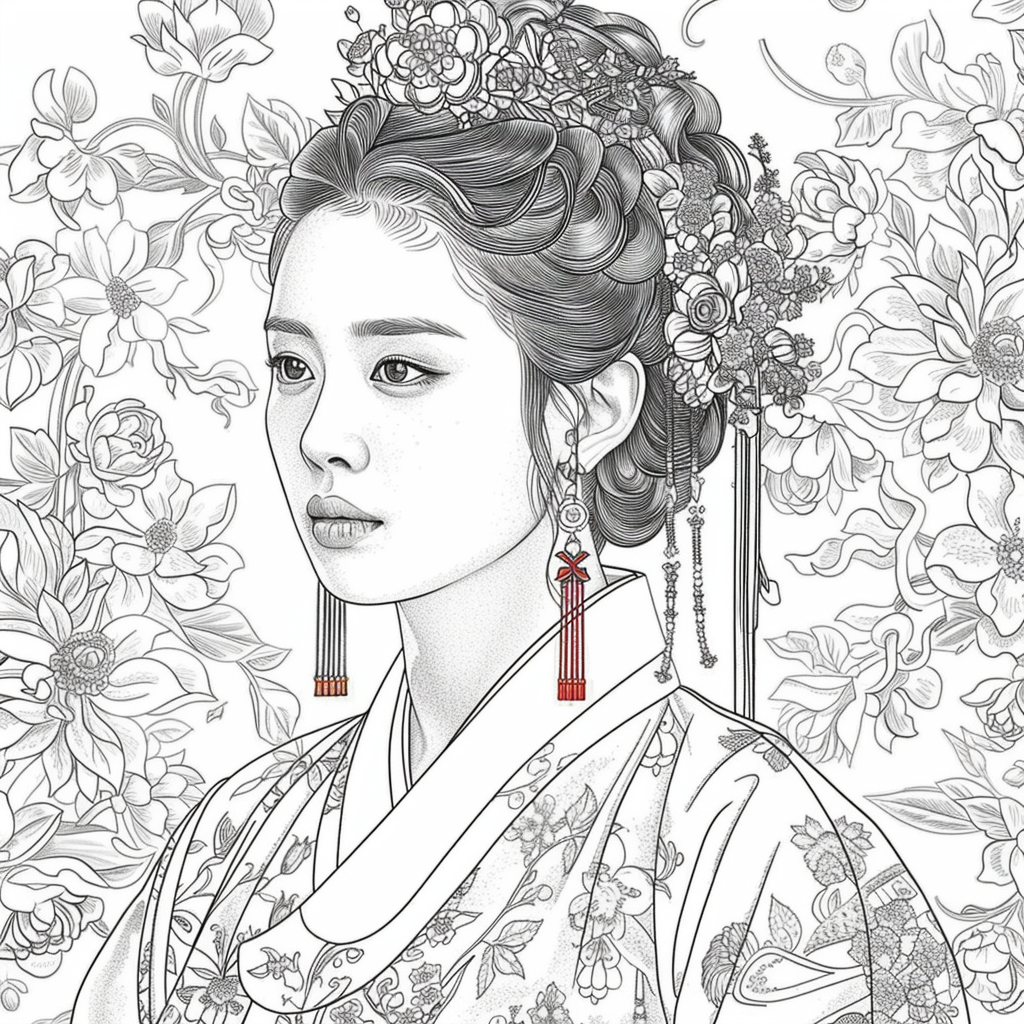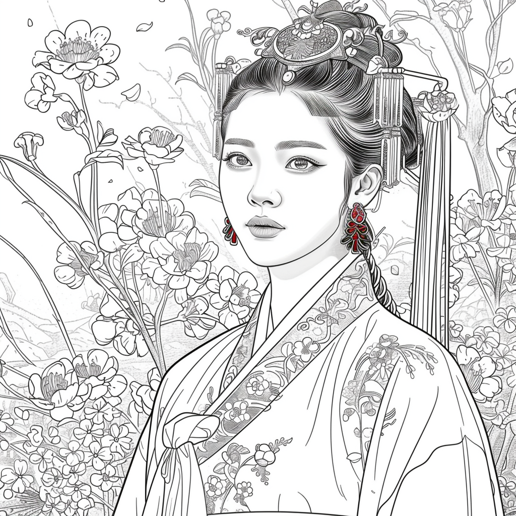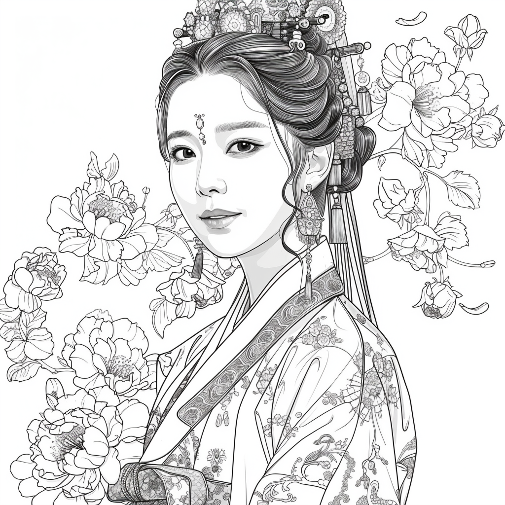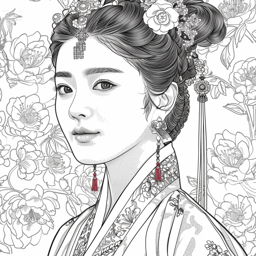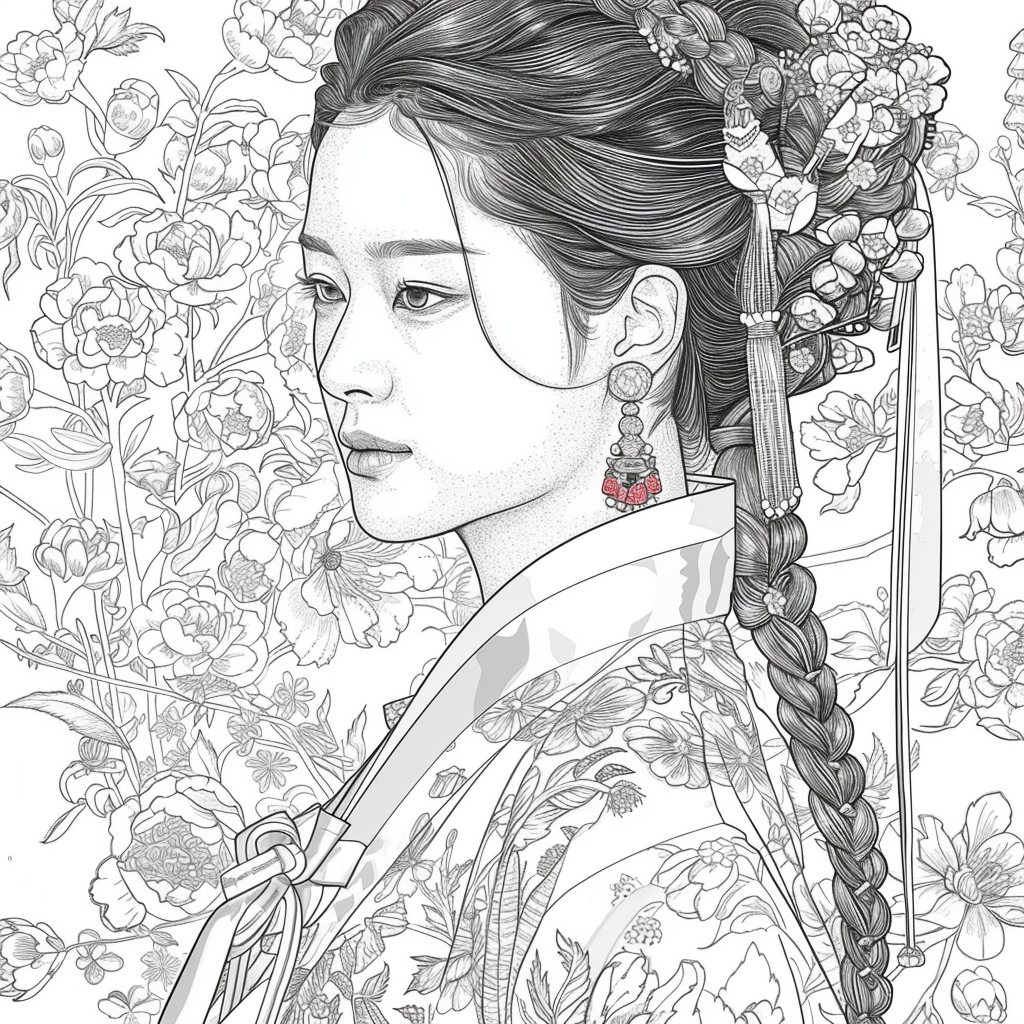 This artwork portrays a stunning young woman in a deep blue hanbok embroidered with intricate floral patterns, symbolizing elegance and prosperity. Her braided hair is adorned with a golden crown and jeweled ornaments, richly decorated with blossoms and colorful beads. She gazes with serene intensity, embodying both delicacy and quiet strength. Behind her, golden patterns shimmer against a backdrop of blooming peonies and wildflowers, creating a harmonious fusion of luxury and nature’s splendor. The composition radiates timeless beauty, royal dignity, and cultural pride.