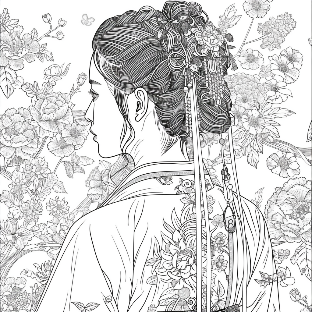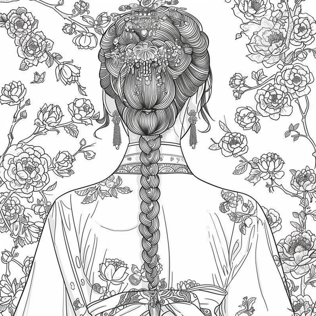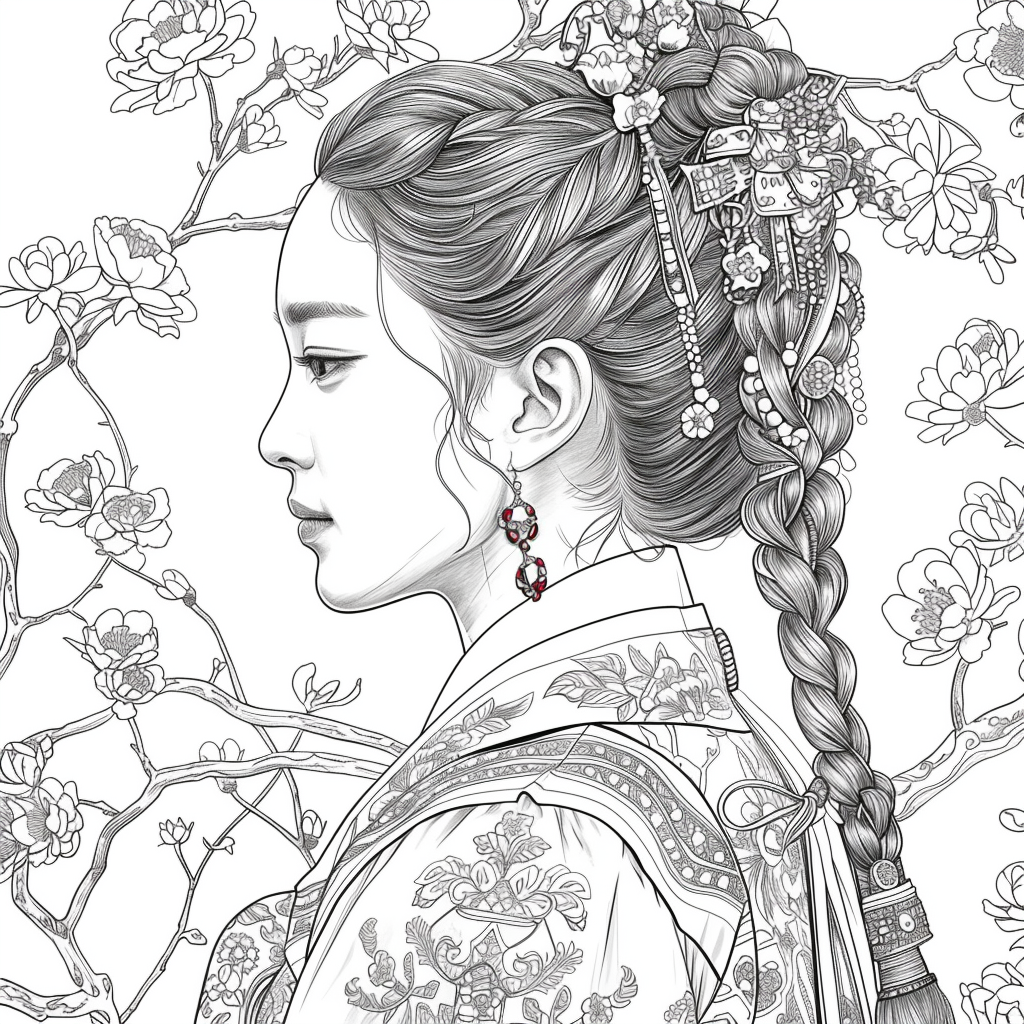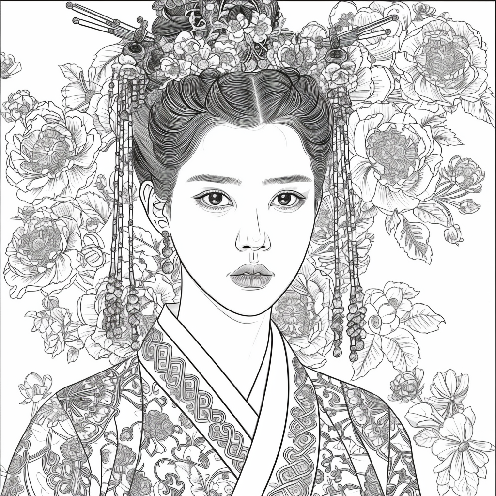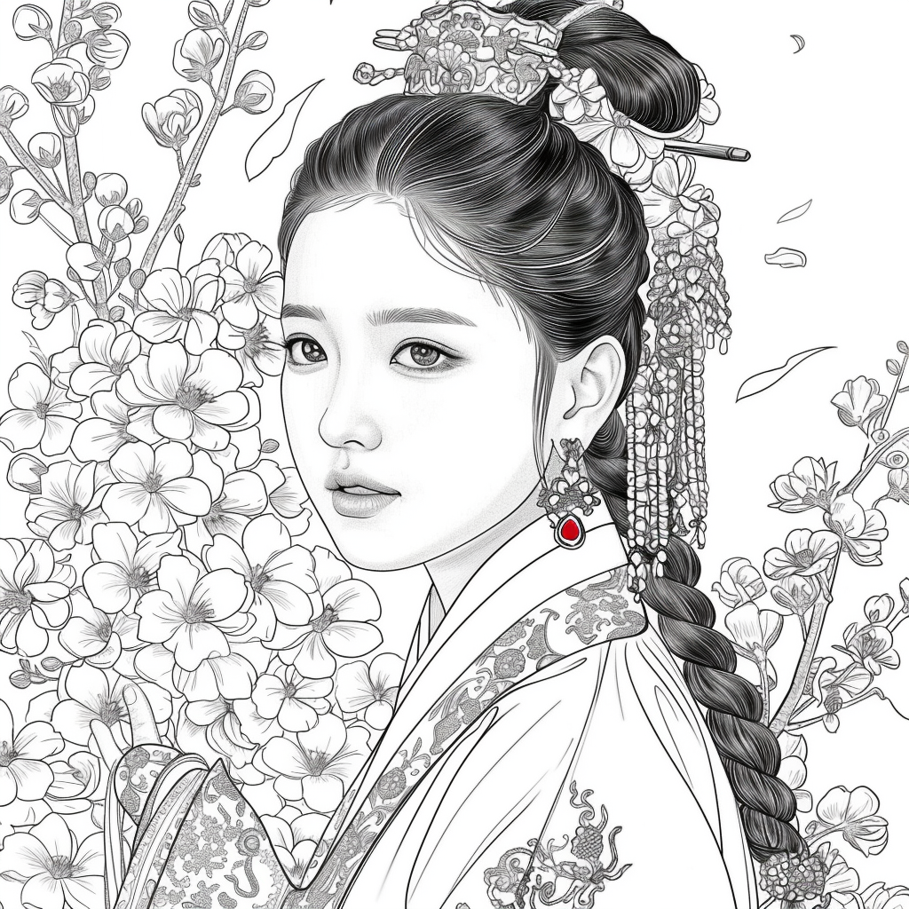 This artwork portrays a stunning young woman in a deep blue hanbok embroidered with intricate floral patterns, symbolizing elegance and prosperity. Her braided hair is adorned with a golden crown and jeweled ornaments, richly decorated with blossoms and colorful beads. She gazes with serene intensity, embodying both delicacy and quiet strength. Behind her, golden patterns shimmer against a backdrop of blooming peonies and wildflowers, creating a harmonious fusion of luxury and nature’s splendor. The composition radiates timeless beauty, royal dignity, and cultural pride.