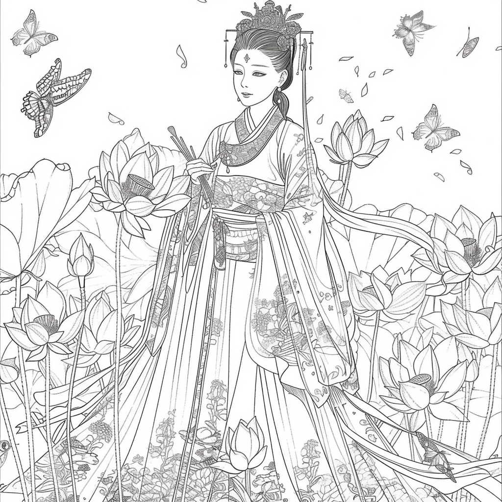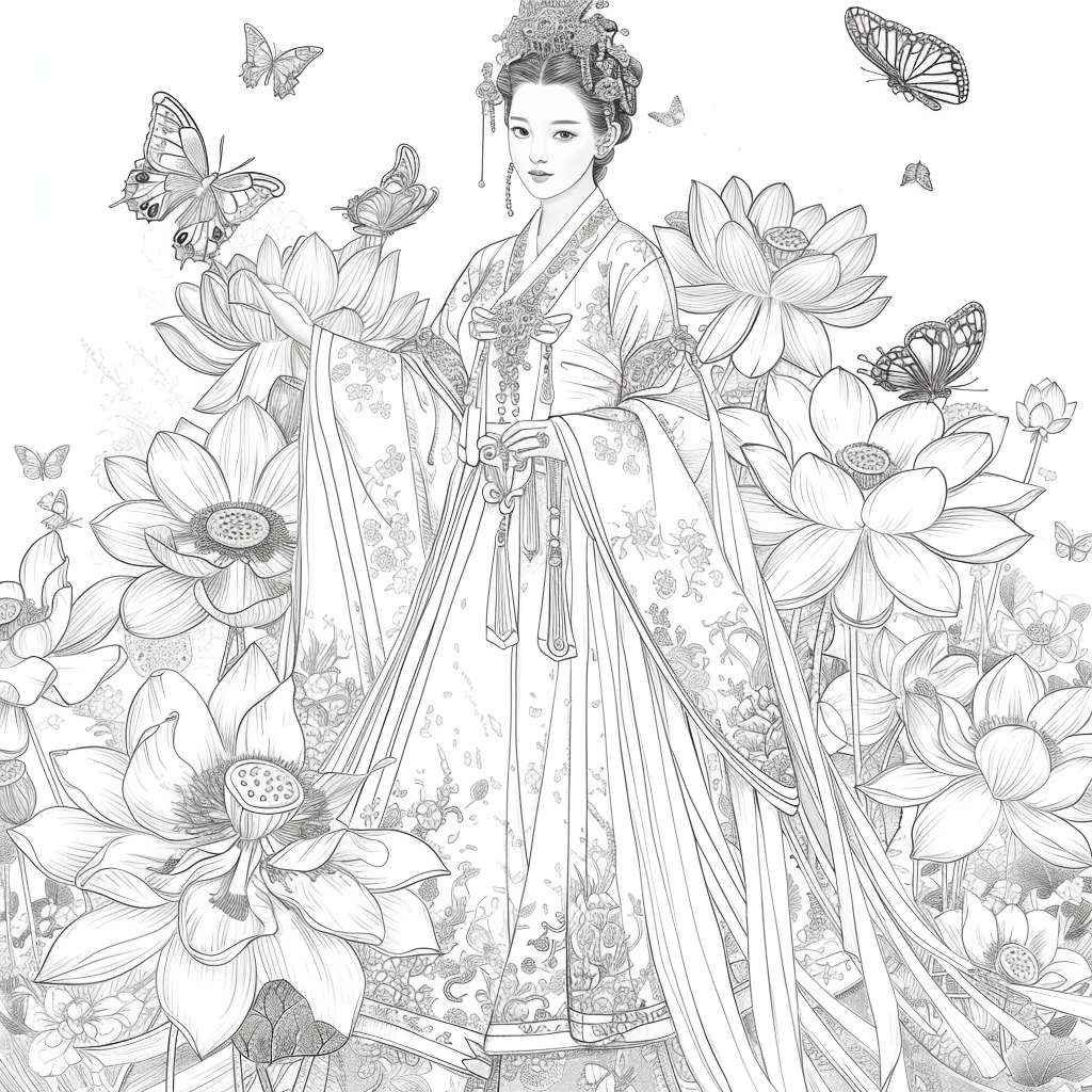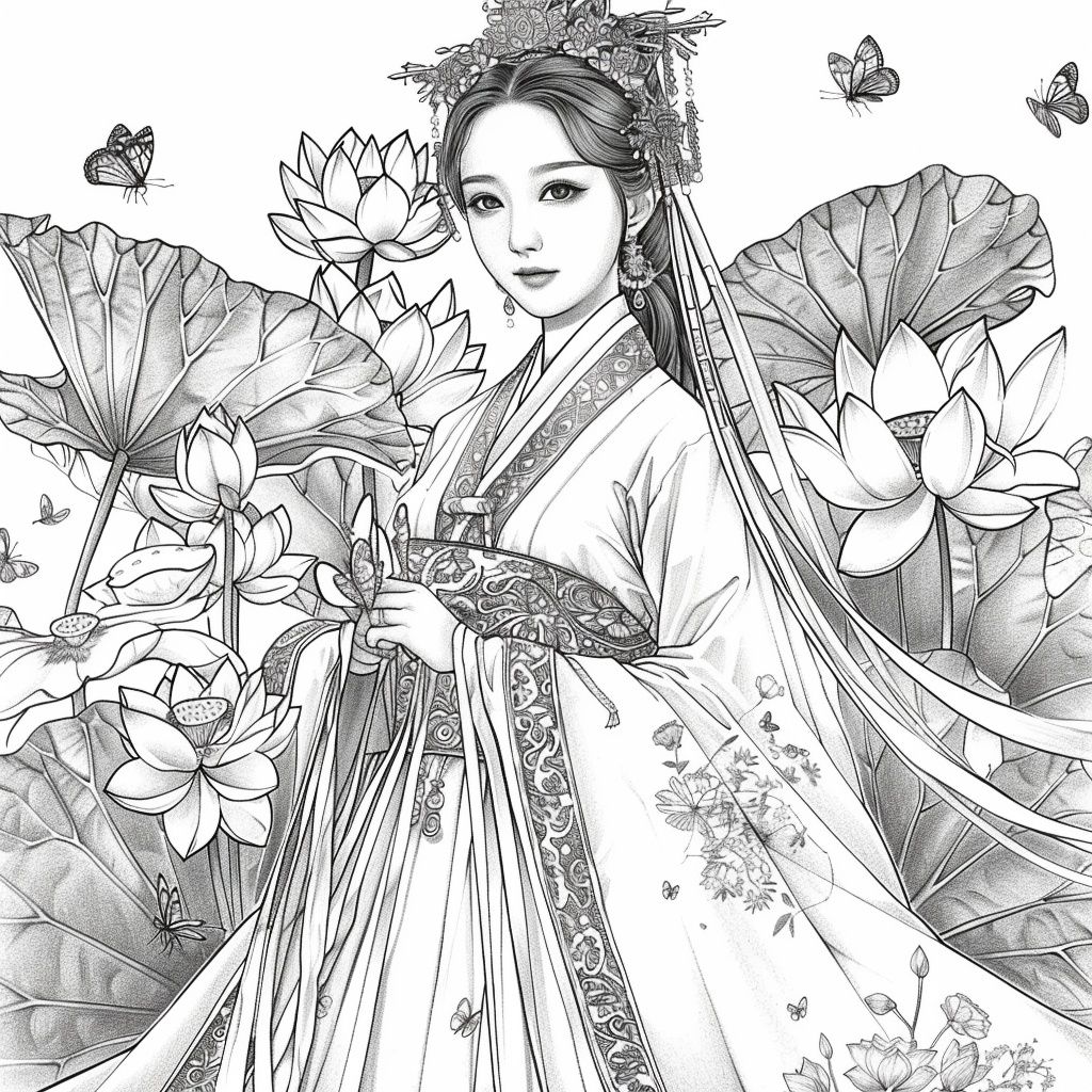 A majestic Korean bride stands gracefully amidst blooming lotus flowers, her presence radiating elegance and serenity. She wears a traditional hanbok in delicate pastel shades of lavender, gold, and rose, adorned with exquisite embroidery and flowing silk layers. A golden jeweled crown rests upon her dark hair, which is styled with intricate ornaments that sparkle in harmony with her attire. Around her, butterflies dance and lotus blossoms bloom against a dreamy watercolor background, symbolizing purity, grace, and transformation. This artwork beautifully blends tradition, nature, and ethereal fantasy into a vision of timeless bridal majesty.