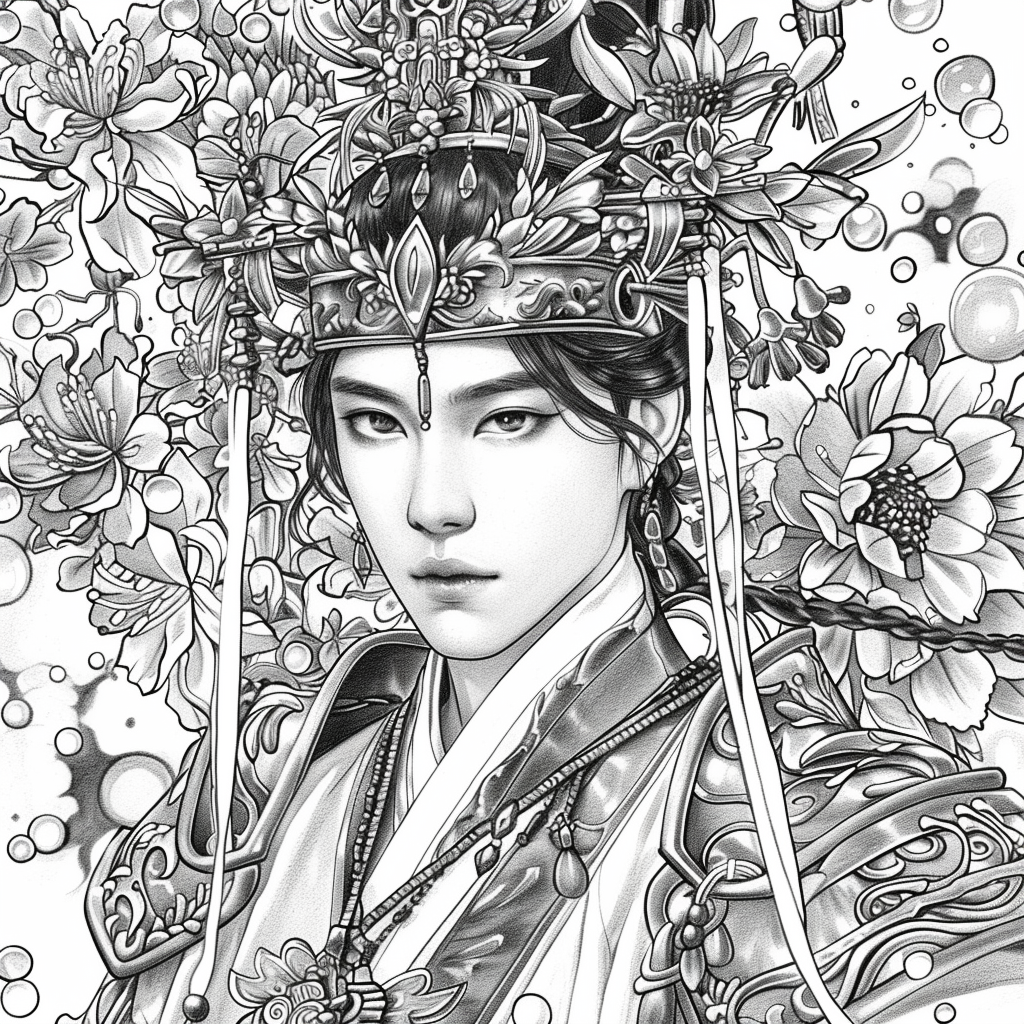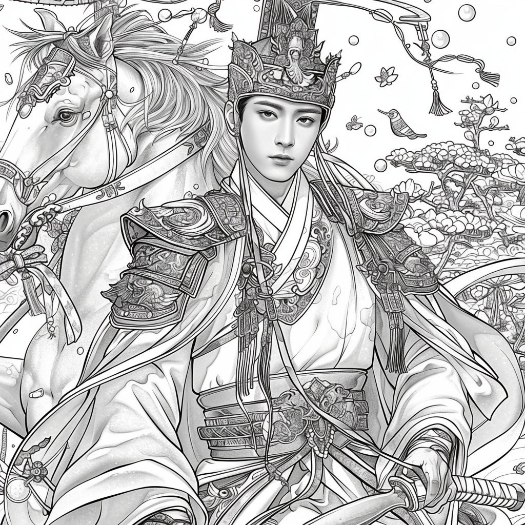 A magnificent fantasy illustration depicting a young warrior in ornate golden armor, riding atop a majestic war elephant. The general’s armor shines with intricate patterns of dragons and phoenixes, crowned with a regal helmet adorned with flowing plumes. With a poised sword in hand, the figure exudes strength, courage, and divine authority. The elephant, richly decorated with embroidered cloth and jeweled harness, stands proudly among a sea of blooming lotus flowers, symbolizing purity, power, and enlightenment. The vivid palette of pinks, purples, and gold contrasts harmoniously with the gray strength of the elephant, creating a scene of both grandeur and serenity.