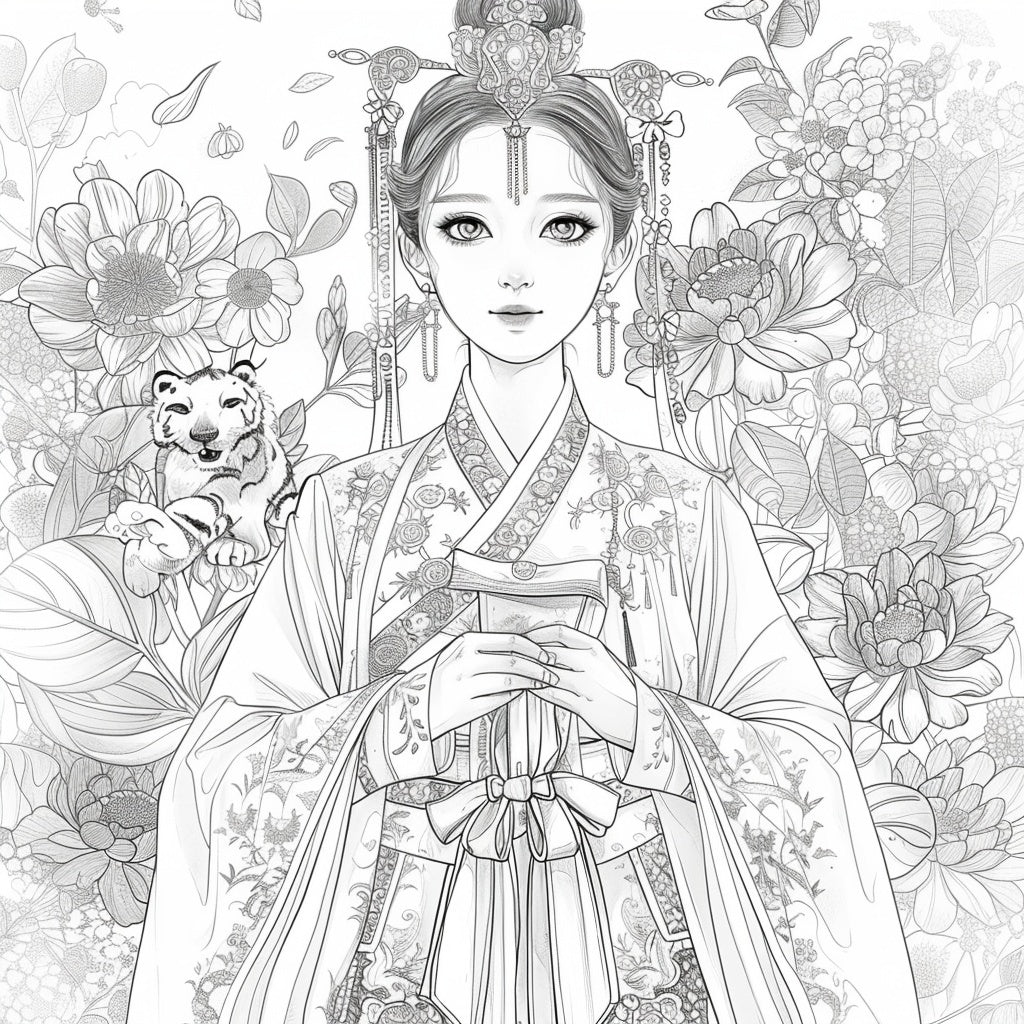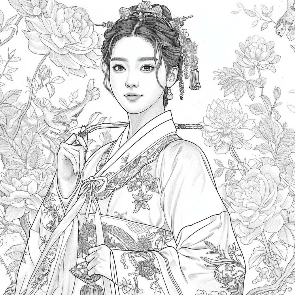 This artwork portrays a graceful young Korean maiden dressed in a vibrant rainbow-colored hanbok, richly adorned with floral embroidery. She stands elegantly amidst a flourishing frame of blossoms, peonies, and colorful foliage, symbolizing renewal, purity, and vitality. Her serene gaze, delicate accessories, and ornate hairpins highlight her nobility, while the watercolor textures of her attire flow seamlessly into the floral surroundings. A vivid harmony of tradition and nature, the scene radiates grace, joy, and timeless cultural elegance.