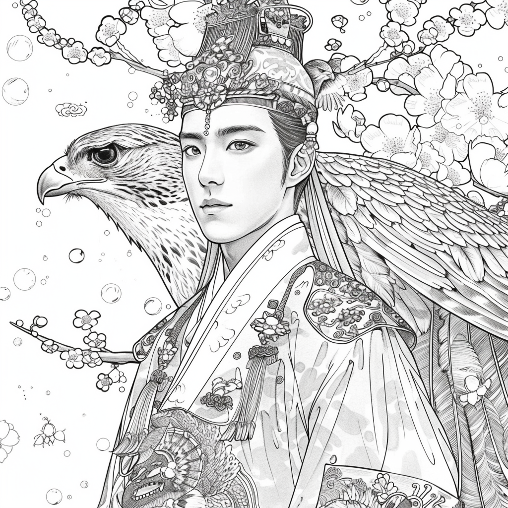 A young maiden adorned in regal attire gazes with quiet strength, framed by an ornate jeweled crown and cascading floral headdress. Vivid peonies, roses, and exotic blooms surround her, blending with pearls and flowing ribbons that shimmer with elegance. Beside her, an elephant stands as a guardian, symbolizing wisdom, strength, and protection. The harmony between the maiden’s delicate beauty and the elephant’s enduring presence conveys a balance of grace and power, while the vivid colors and intricate details evoke a timeless sense of cultural richness and mysticism.