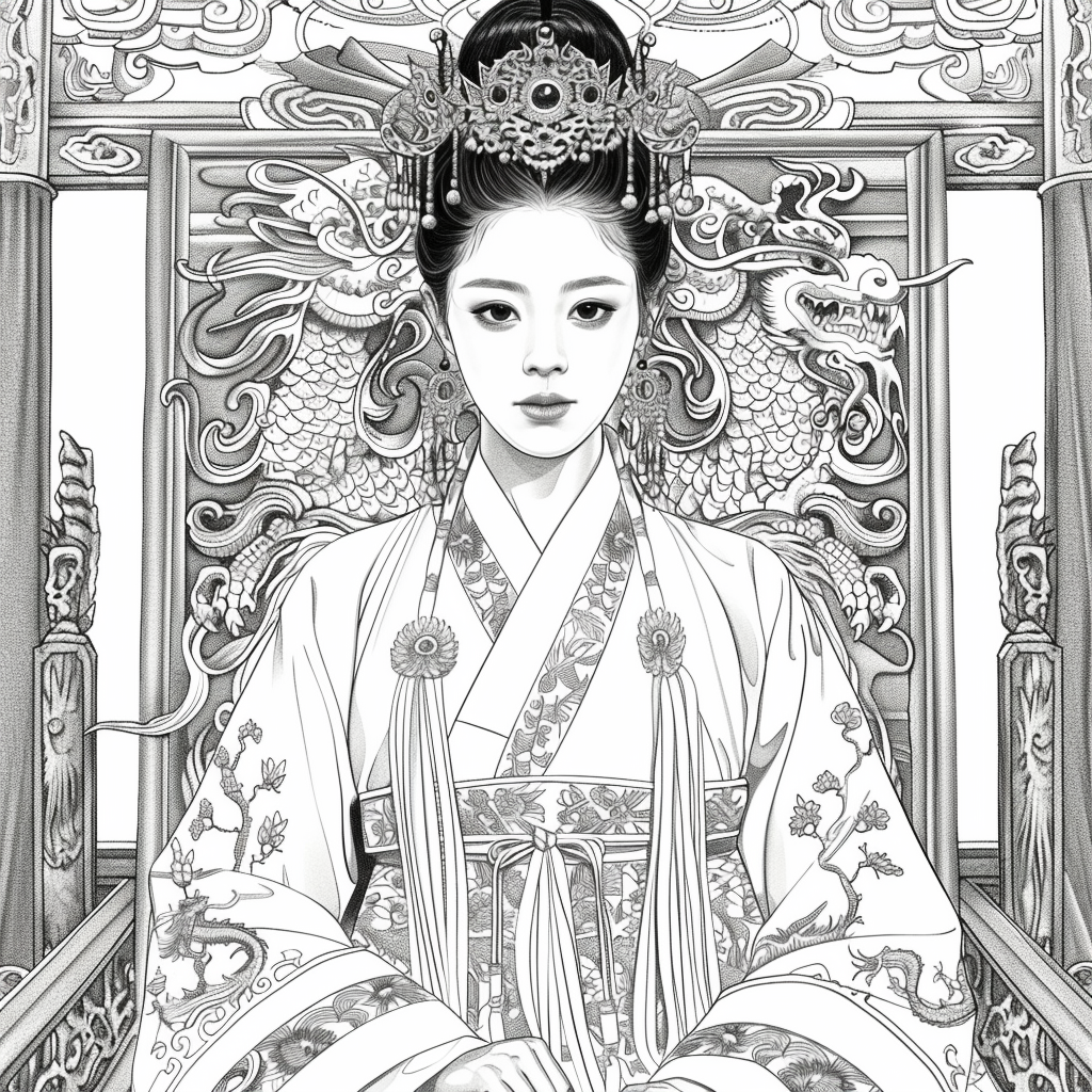 A regal queen sits gracefully upon an ornate throne, her presence radiating power and elegance. She is adorned in a resplendent red hanbok richly embroidered with golden dragons, symbols of authority and divine protection. Her headdress glimmers with intricate jewels and dangling ornaments, completing her aura of imperial dignity. Behind her, a tapestry of dragons and blue silk further emphasizes her commanding presence. This portrait captures the timeless grandeur, strength, and nobility of Korea’s royal heritage.