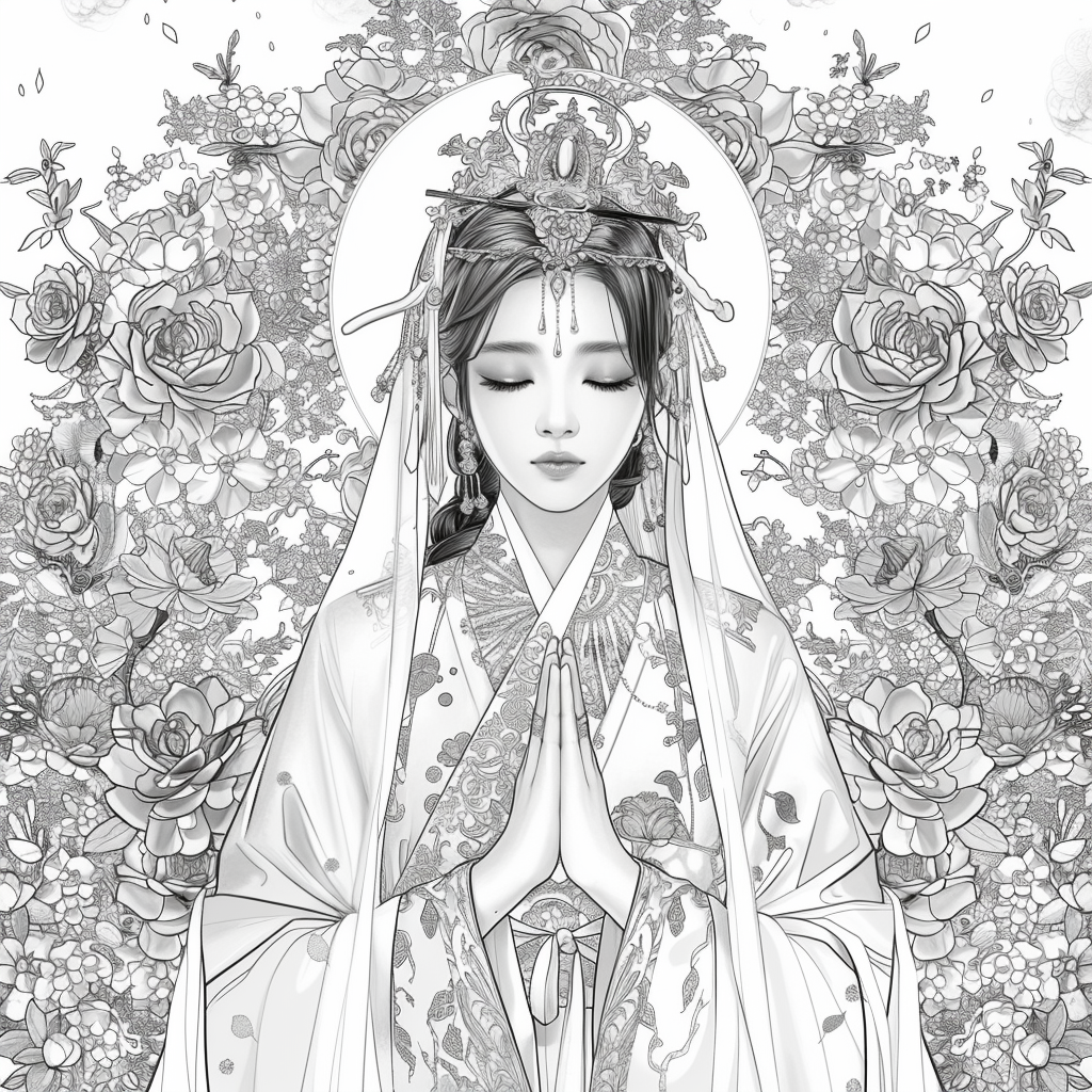 A majestic empress stands in serene prayer, her hands folded with divine grace. Draped in flowing robes of turquoise, emerald, and violet, her attire blooms with embroidered flowers and shimmering patterns that echo the life of the seas and gardens around her. A radiant halo-like headdress crowns her presence, while behind her, waves swirl in harmony with vibrant blossoms, temples, and distant boats. She embodies balance between land and sea, strength and compassion, a timeless guardian of beauty, prosperity, and spiritual peace.