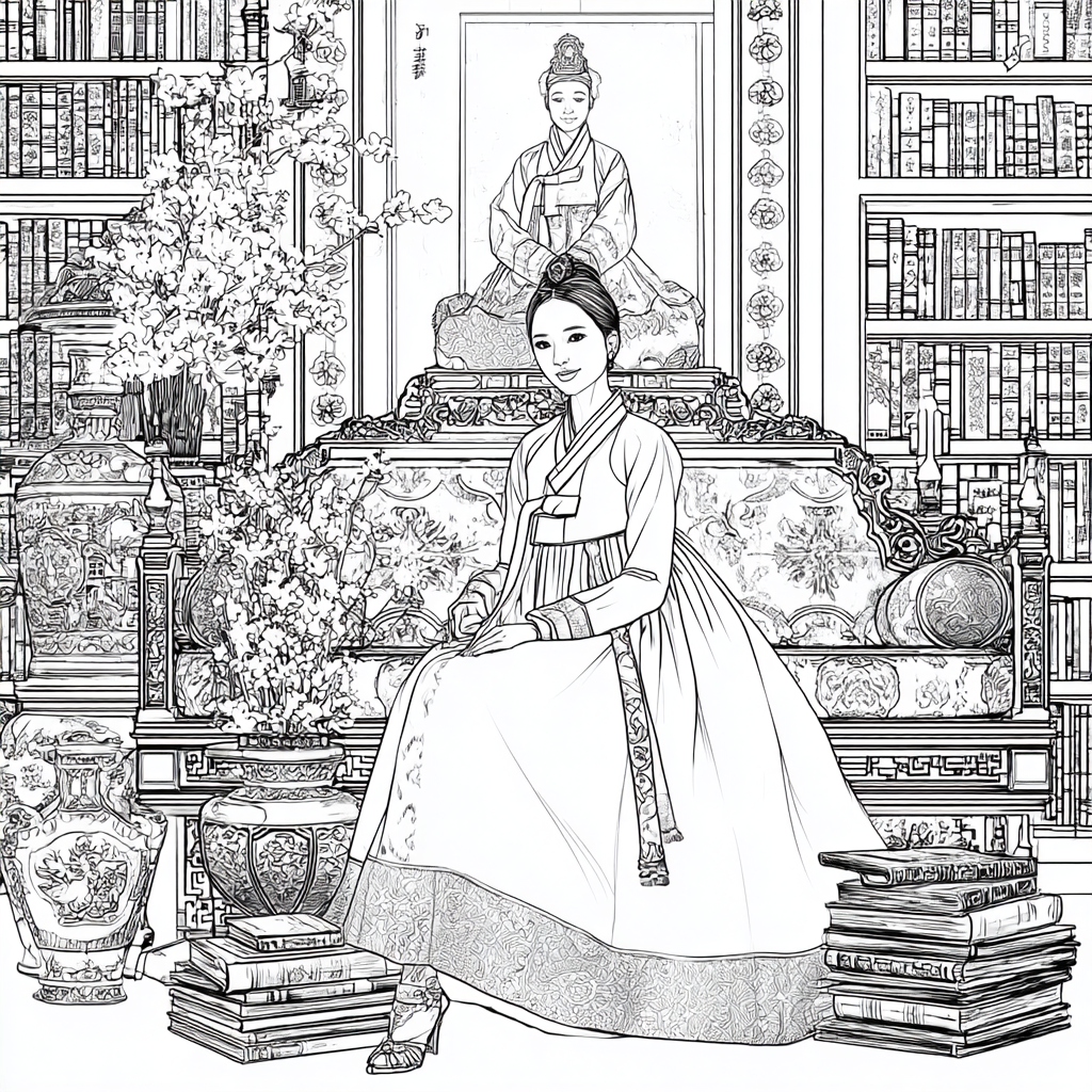 A serene Korean princess sits gracefully within an opulent chamber adorned with intricately painted screens and lacquered boxes. Her hanbok features a deep emerald skirt embroidered with delicate floral motifs, paired with an elegant ivory jeogori that glows softly under the warm light. The background is a tapestry of vibrant traditional patterns—golden panels, ornate floral screens, and hand-painted chests—creating a world rich with cultural history and artistic mastery. On each side, vases filled with pink and purple blossoms add softness to the regal atmosphere. With her eyes gently lowered and hands folded in quiet composure, she embodies dignity, refinement, and a timeless elegance rooted in Korean tradition.