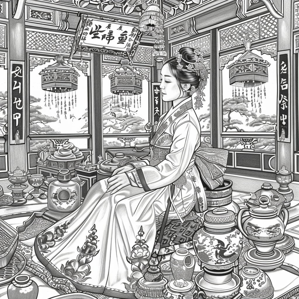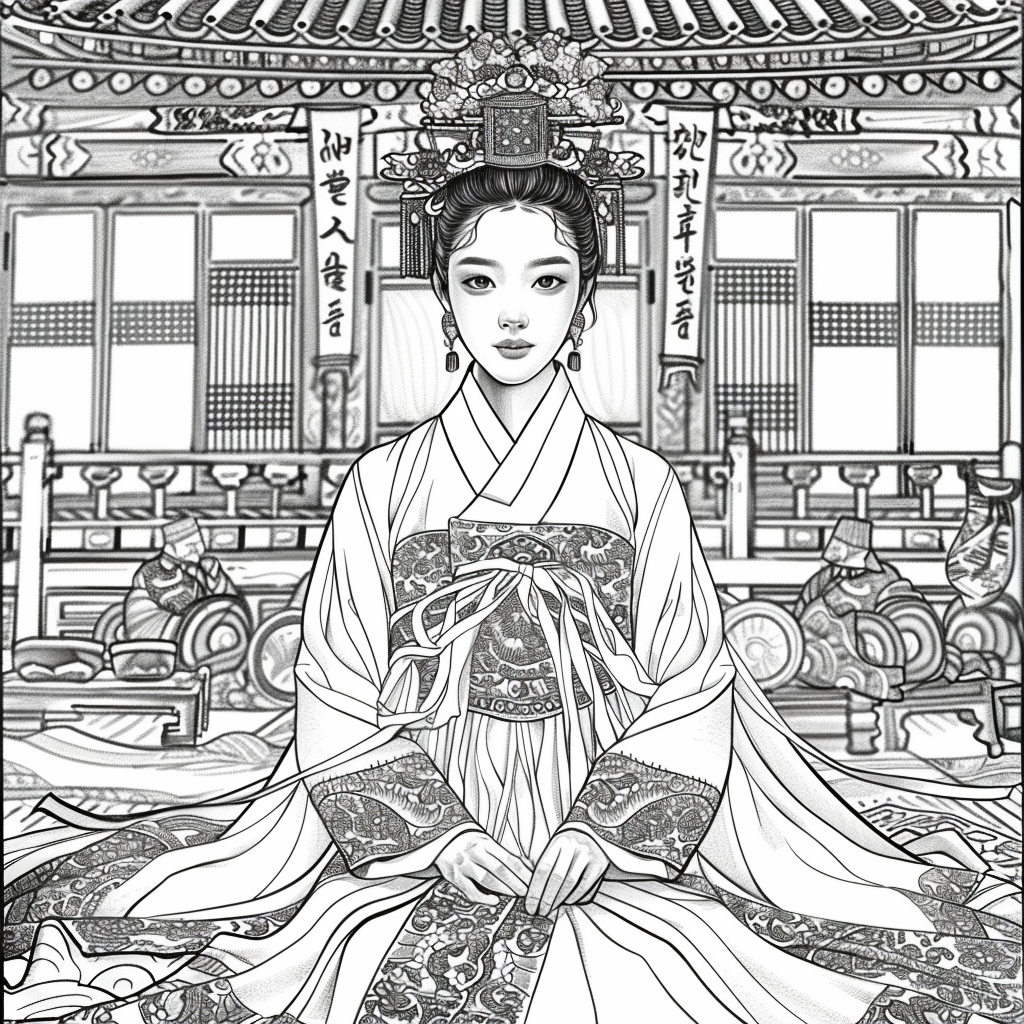 A Korean woman sits gracefully with her back turned, facing the grand palace adorned in intricate, colorful patterns. Her hanbok flows magnificently, each panel alive with vibrant hues of orange, blue, pink, and gold, decorated with symbolic motifs of nature, prosperity, and harmony. The richly painted palace pillars and hanging banners mirror her attire, creating a perfect dialogue between architecture and fashion. Her poised presence against the backdrop of tradition evokes dignity, reverence, and the timeless beauty of Korean heritage.