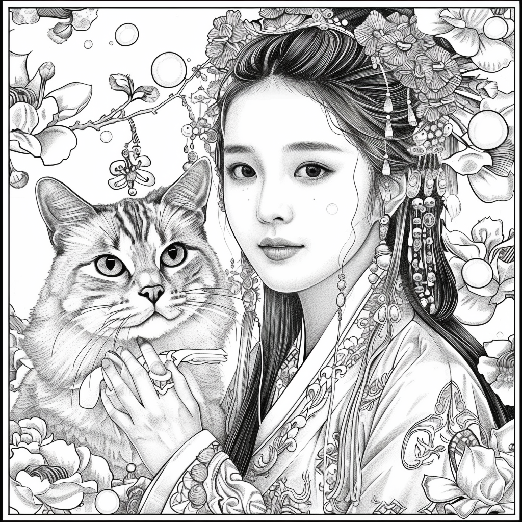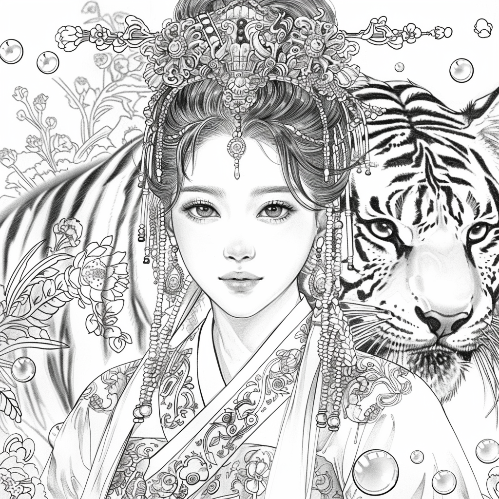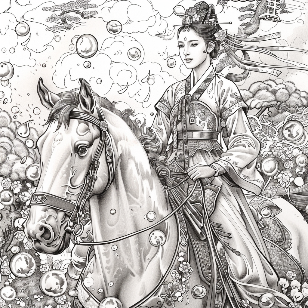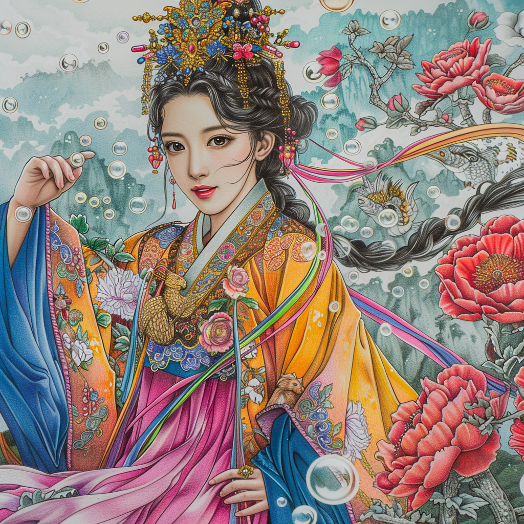 A stunning princess gazes forward with captivating eyes, her expression filled with both grace and strength. She is adorned in an elaborate hanbok, layered in brilliant hues of gold, violet, and sapphire, intricately embroidered with floral motifs and phoenix designs. A golden crown encrusted with jewels and delicate blossoms rests upon her head, its ribbons flowing like streams of rainbow light in the wind. Around her, peonies bloom in vibrant shades of crimson and pink, while delicate bubbles rise through the scene, adding a touch of ethereal wonder. Her braided hair, woven with ornaments, flows gracefully as if touched by divine energy. This artwork captures the essence of timeless beauty, dignity, and enchantment, evoking the image of a princess who embodies both nobility and the flourishing spirit of nature.