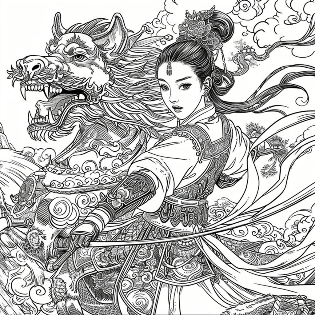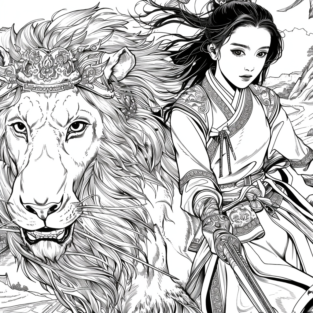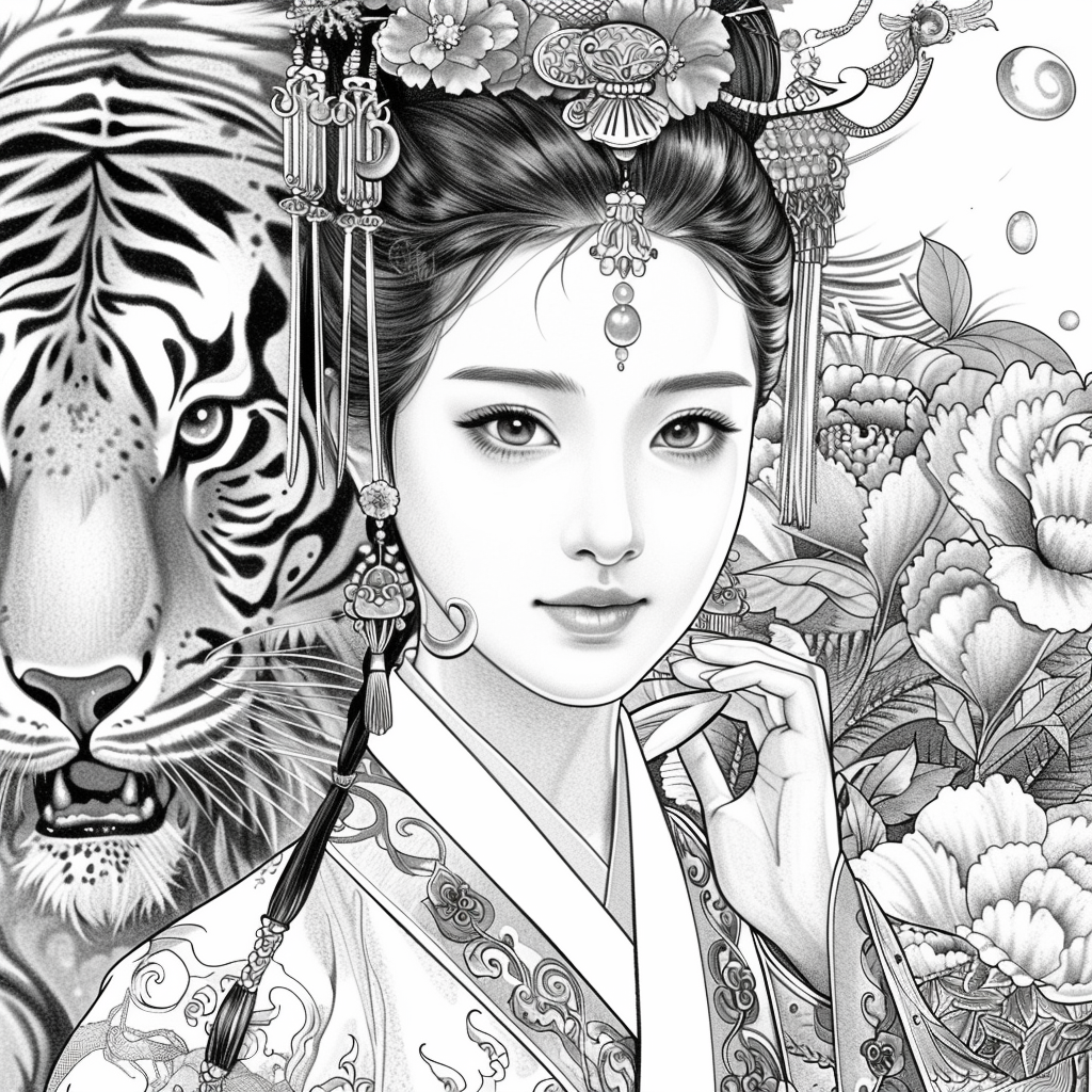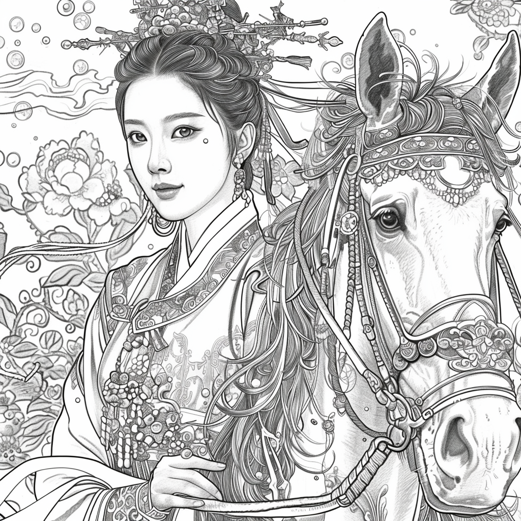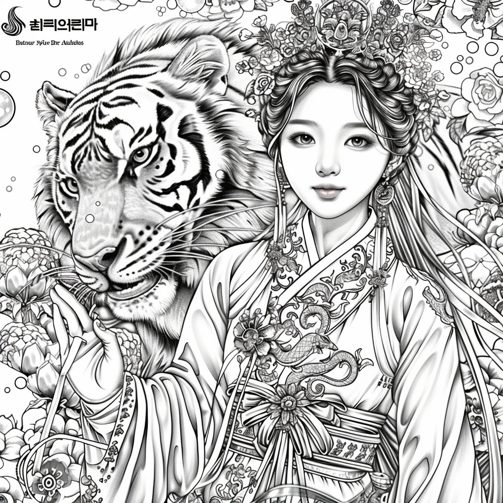 A stunning princess gazes forward with captivating eyes, her expression filled with both grace and strength. She is adorned in an elaborate hanbok, layered in brilliant hues of gold, violet, and sapphire, intricately embroidered with floral motifs and phoenix designs. A golden crown encrusted with jewels and delicate blossoms rests upon her head, its ribbons flowing like streams of rainbow light in the wind. Around her, peonies bloom in vibrant shades of crimson and pink, while delicate bubbles rise through the scene, adding a touch of ethereal wonder. Her braided hair, woven with ornaments, flows gracefully as if touched by divine energy. This artwork captures the essence of timeless beauty, dignity, and enchantment, evoking the image of a princess who embodies both nobility and the flourishing spirit of nature.
