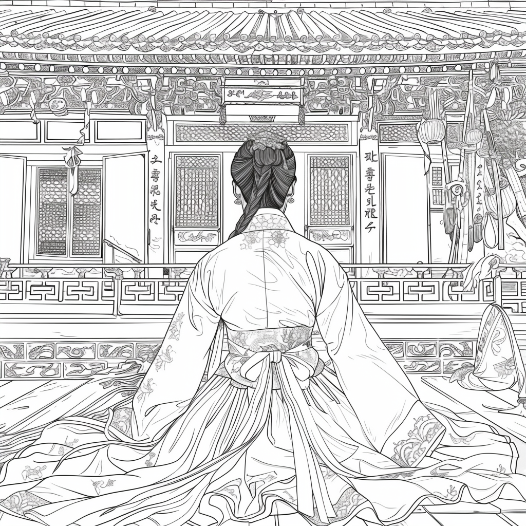 This artwork captures a graceful Korean woman seated within the gates of a traditional palace, her poise reflecting both serenity and nobility. She wears a resplendent hanbok in rich hues of crimson, gold, and sapphire blue, embroidered with delicate floral motifs symbolizing prosperity and beauty. Her calm expression and upright posture embody dignity, while her surroundings—monochrome palace structures and traditional decorations—contrast strikingly with the vivid colors of her attire. Adorned with hair ornaments and layered fabrics, she represents the harmony of cultural refinement, the vibrancy of life, and the preservation of heritage within history’s frame.
