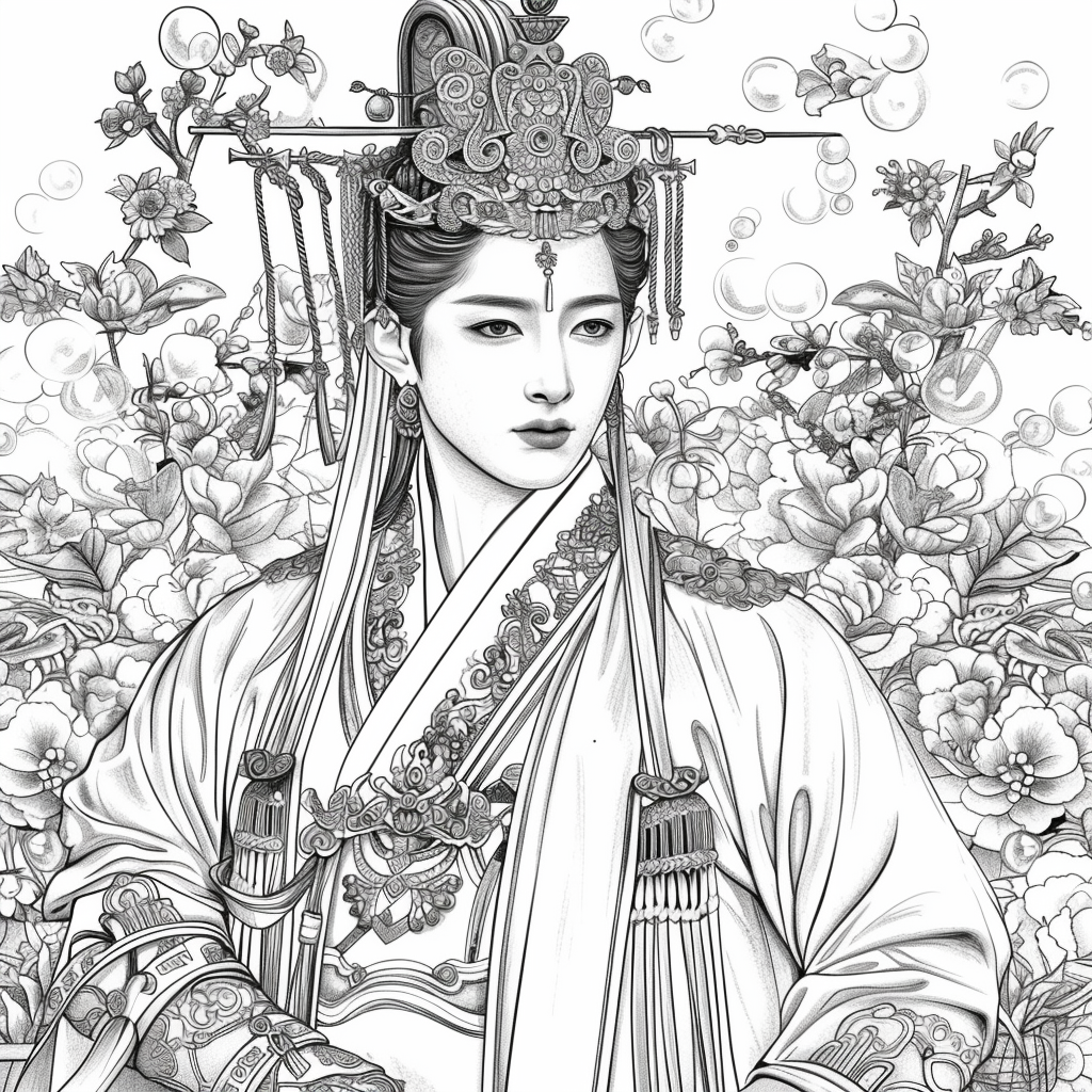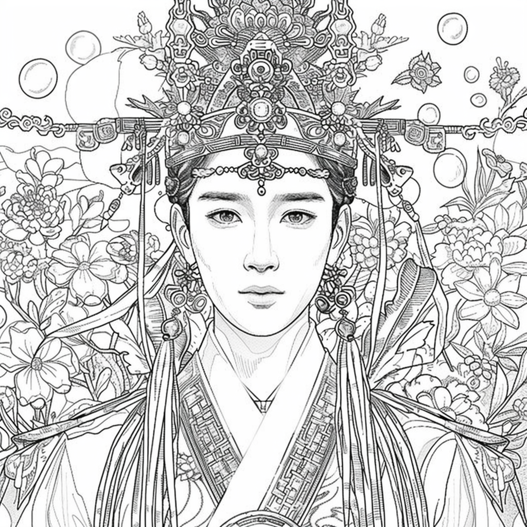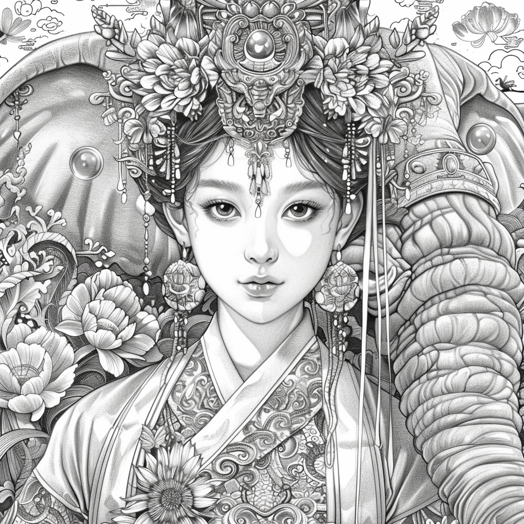 This artwork portrays a noble prince in resplendent ceremonial attire, his robes adorned with intricate patterns and a vivid array of colors—gold, crimson, emerald, and sapphire—symbolizing prosperity and royal dignity. His ornate headdress blooms with flowers and jewels, extending like a crown of nature’s abundance. Behind him stands a majestic elephant, its calm presence symbolizing wisdom, strength, and stability. Flowing waves, lotus blossoms, and swirling motifs envelop the scene, blending human grace with the grandeur of nature and myth. Together, the prince and the elephant embody harmony, resilience, and the eternal bond between leadership and compassion.