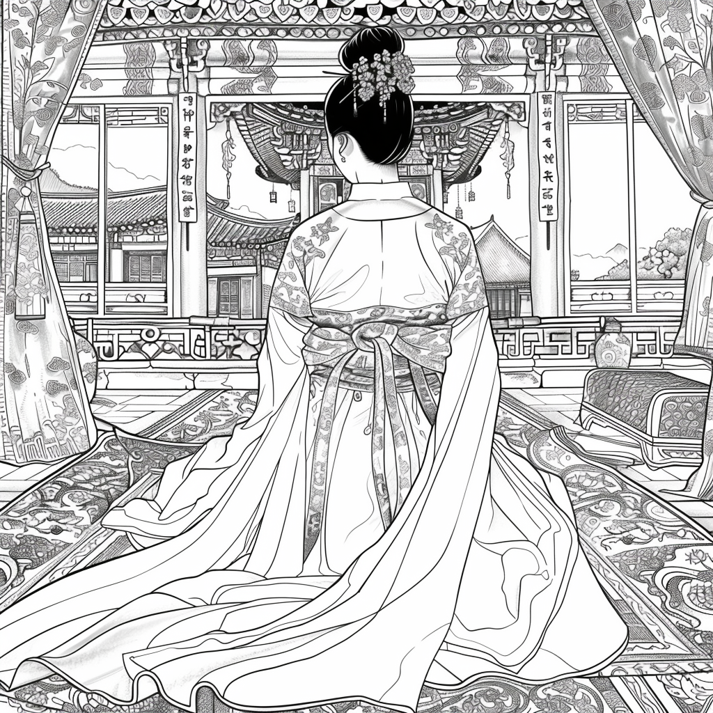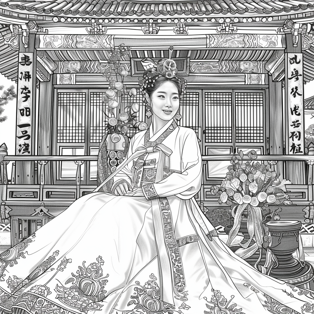 This artwork captures the serene beauty of a Korean woman seated gracefully in a traditional courtyard. She wears a richly embroidered hanbok with layers of vivid ribbons, floral ornaments, and intricate patterns, standing out against the monochrome backdrop of hanok architecture. Her calm expression evokes reflection and poise, as if she carries the quiet strength of history within her. The balance of vibrant colors against grayscale surroundings symbolizes the endurance of cultural heritage, where tradition blooms vividly even in stillness.