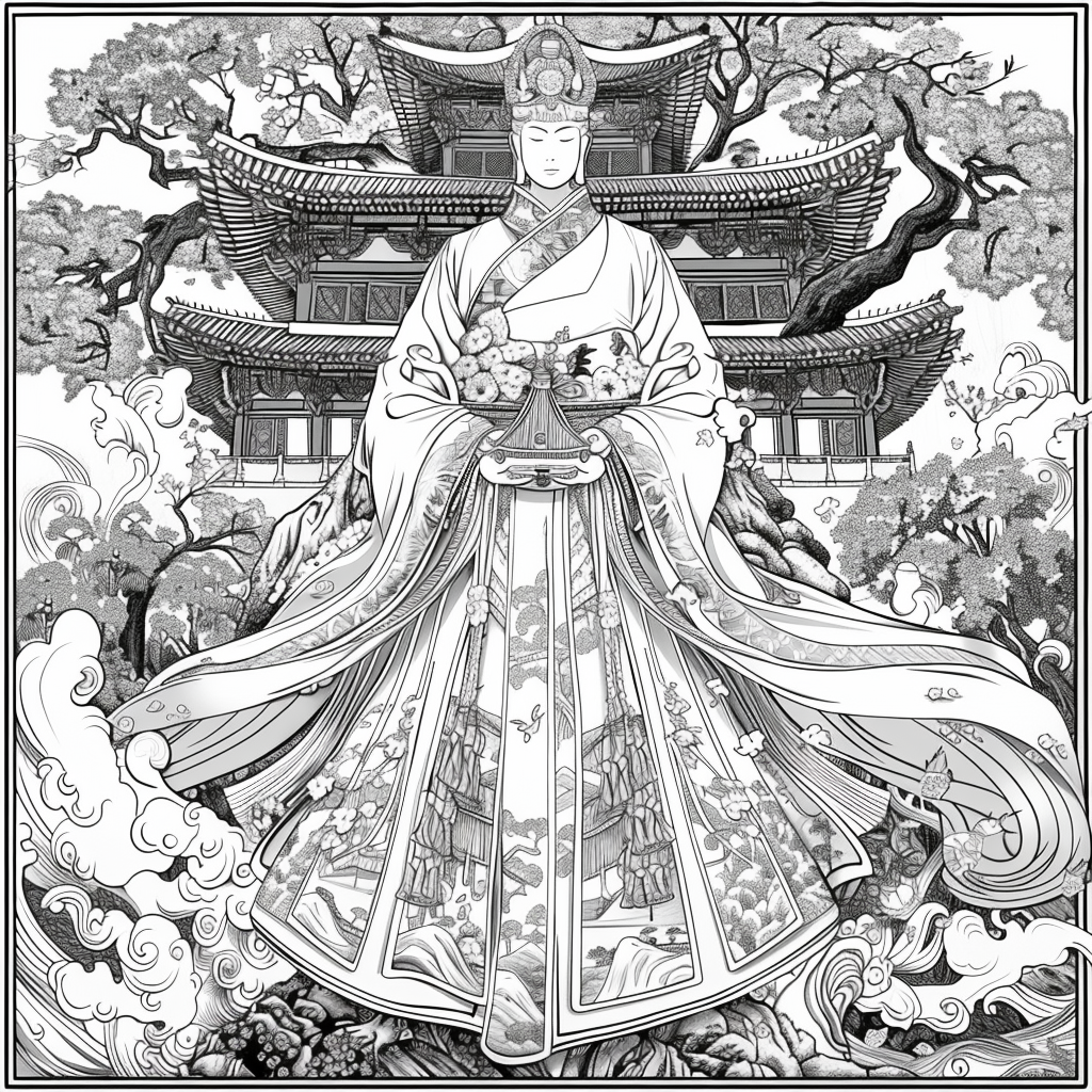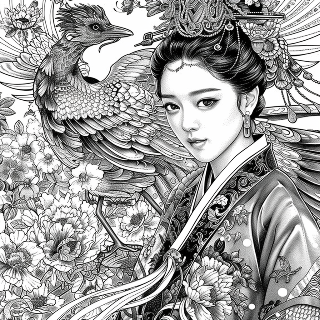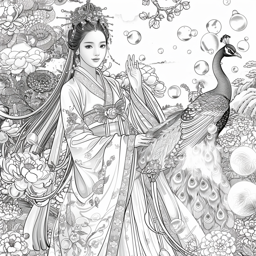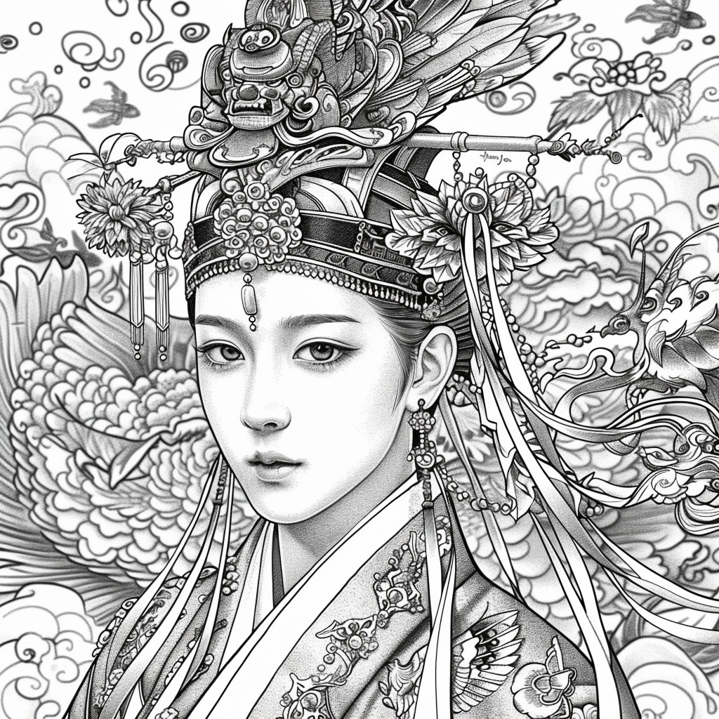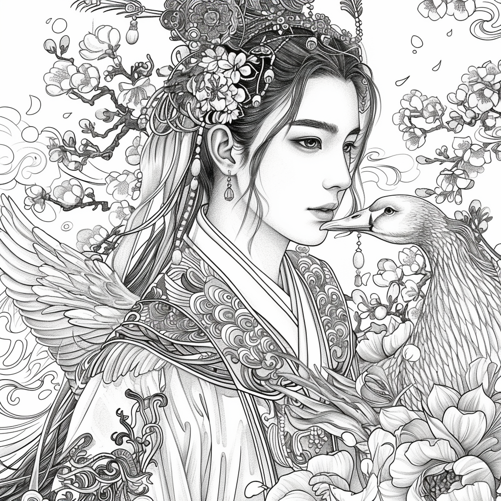 This enchanting artwork features a regal empress adorned in elaborate robes of teal, orange, and crimson, her attire richly embroidered with intricate patterns. A golden crown rests upon her head, signifying sovereignty and divine presence. Beside her, a majestic swan spreads its wings, symbolizing purity, transformation, and spiritual guardianship. Surrounding her are rainbow arcs, floating bubbles, and waves of natural beauty, merging fantasy with tradition. The Empress’s calm yet commanding expression conveys wisdom and authority, embodying the eternal balance of elegance, strength, and serenity.