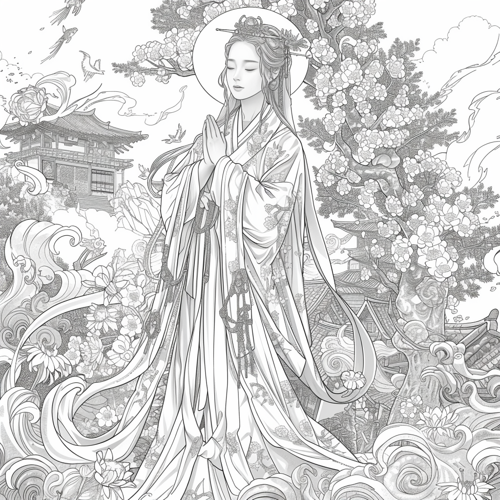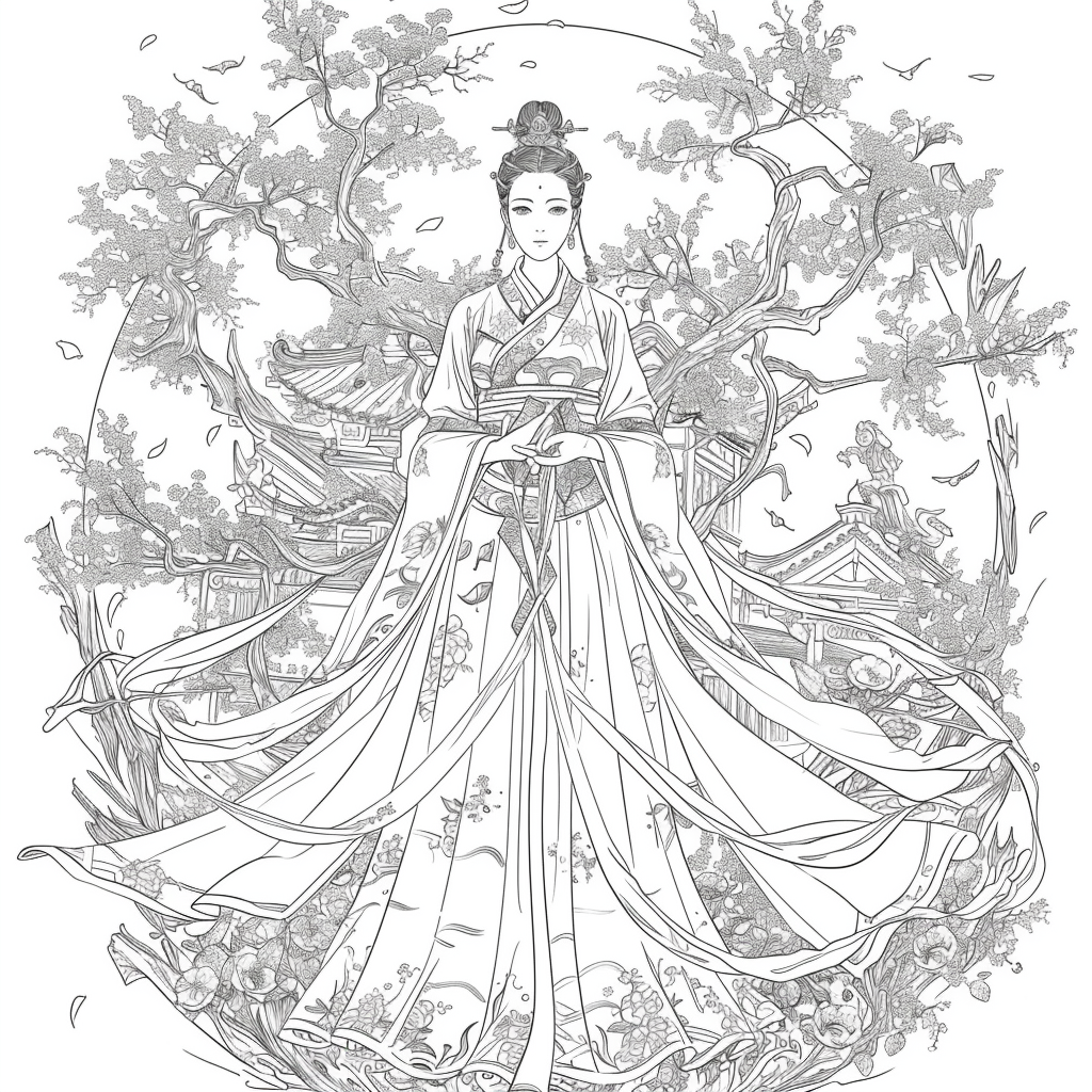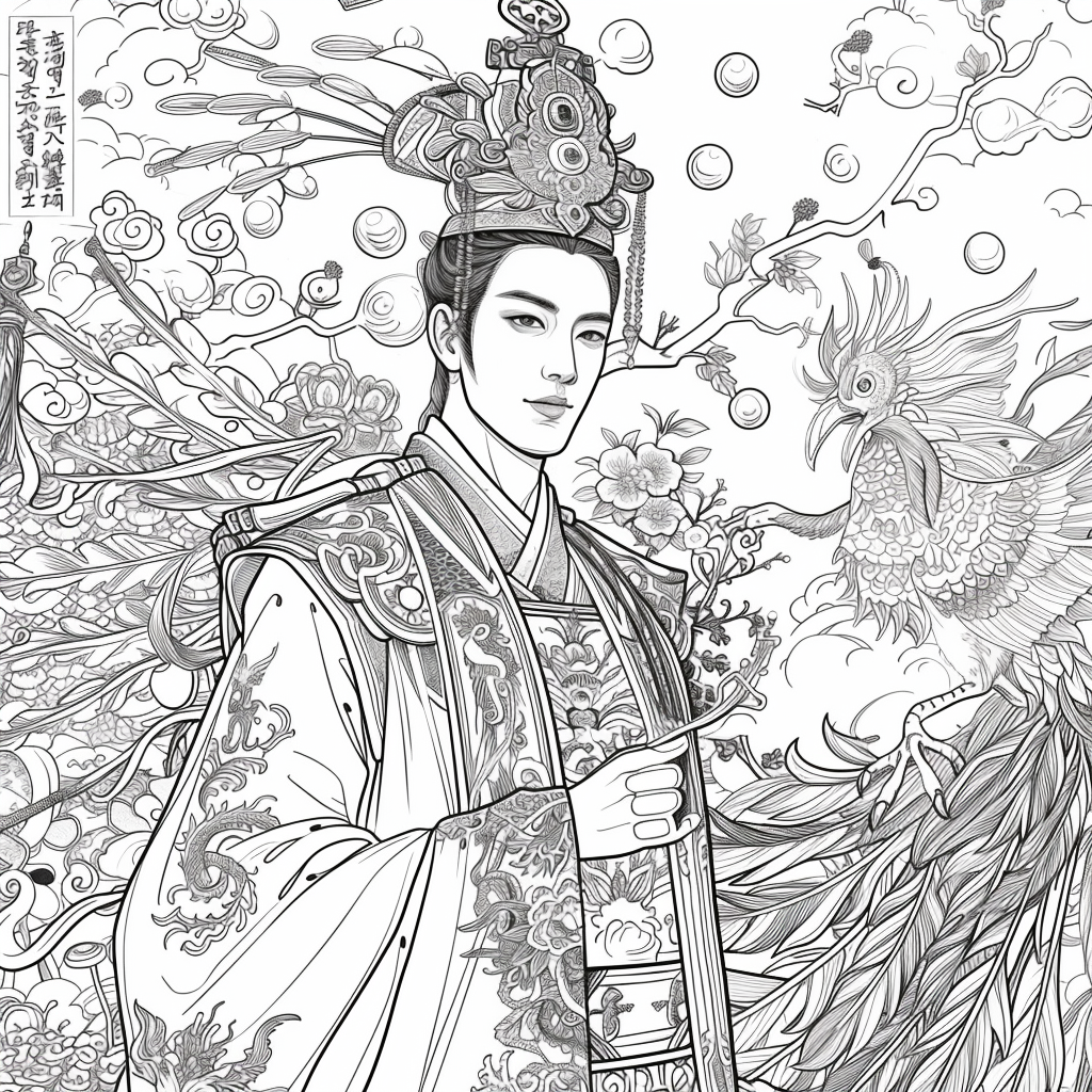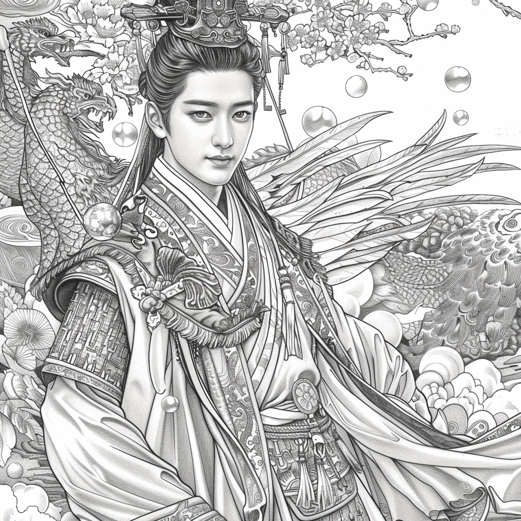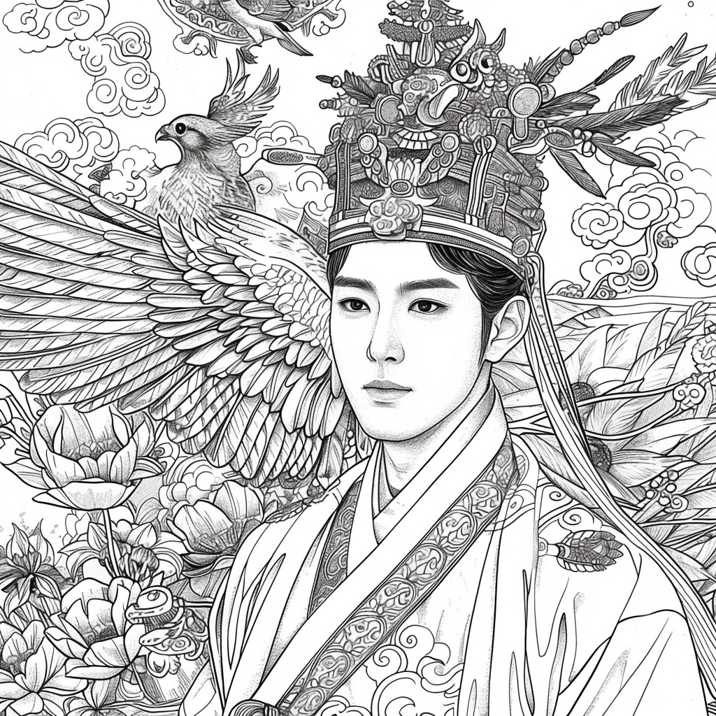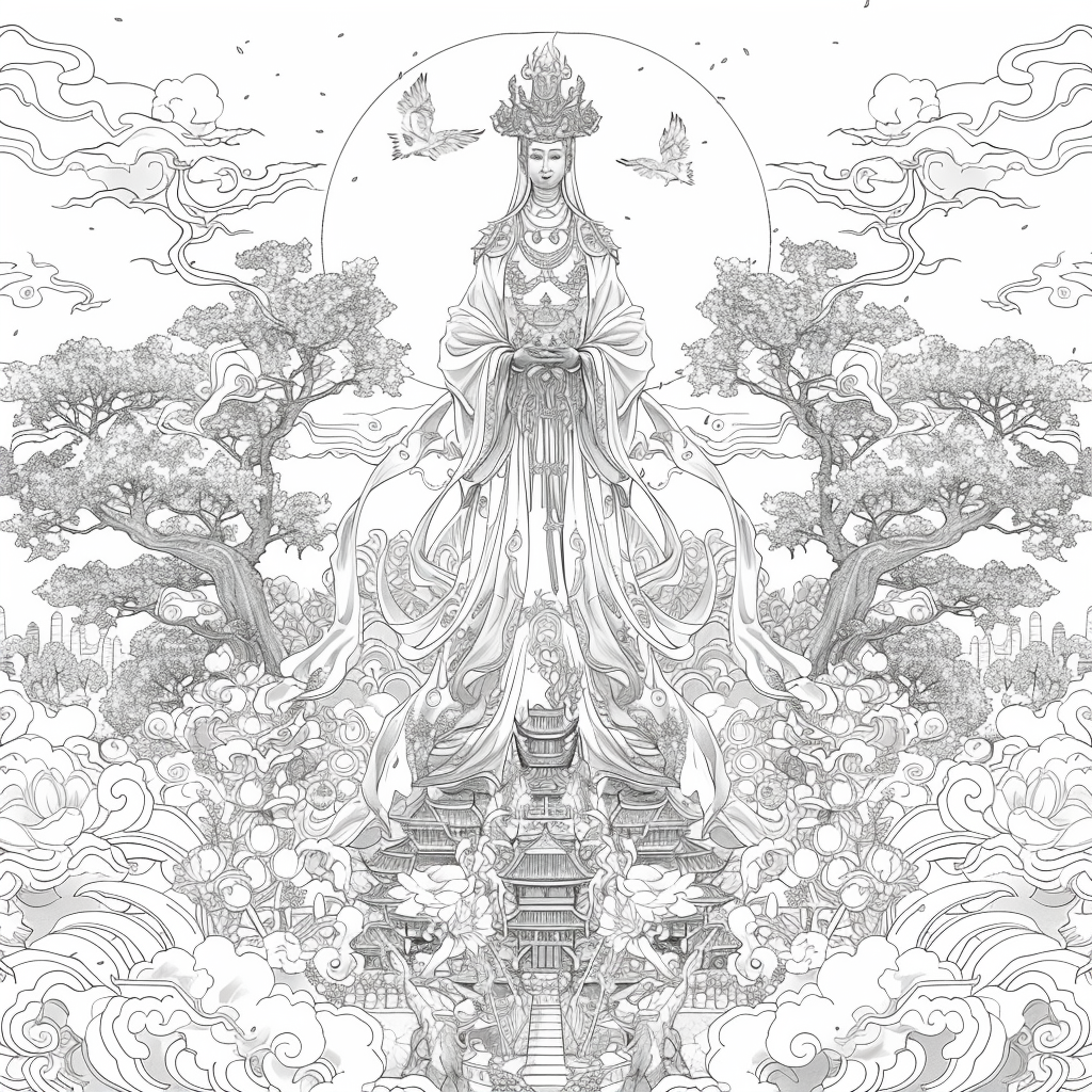 This enchanting artwork features a regal empress adorned in elaborate robes of teal, orange, and crimson, her attire richly embroidered with intricate patterns. A golden crown rests upon her head, signifying sovereignty and divine presence. Beside her, a majestic swan spreads its wings, symbolizing purity, transformation, and spiritual guardianship. Surrounding her are rainbow arcs, floating bubbles, and waves of natural beauty, merging fantasy with tradition. The Empress’s calm yet commanding expression conveys wisdom and authority, embodying the eternal balance of elegance, strength, and serenity.