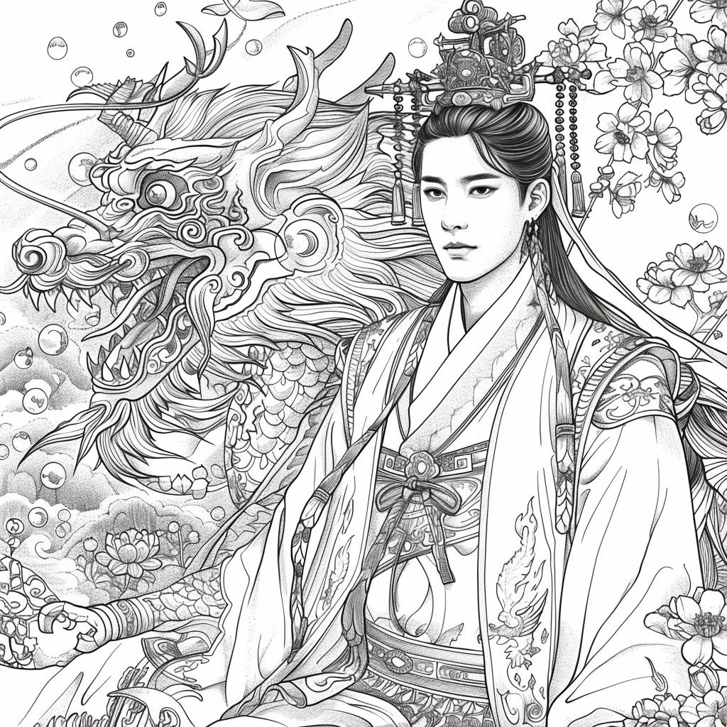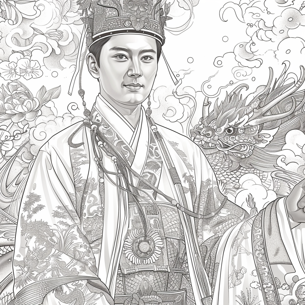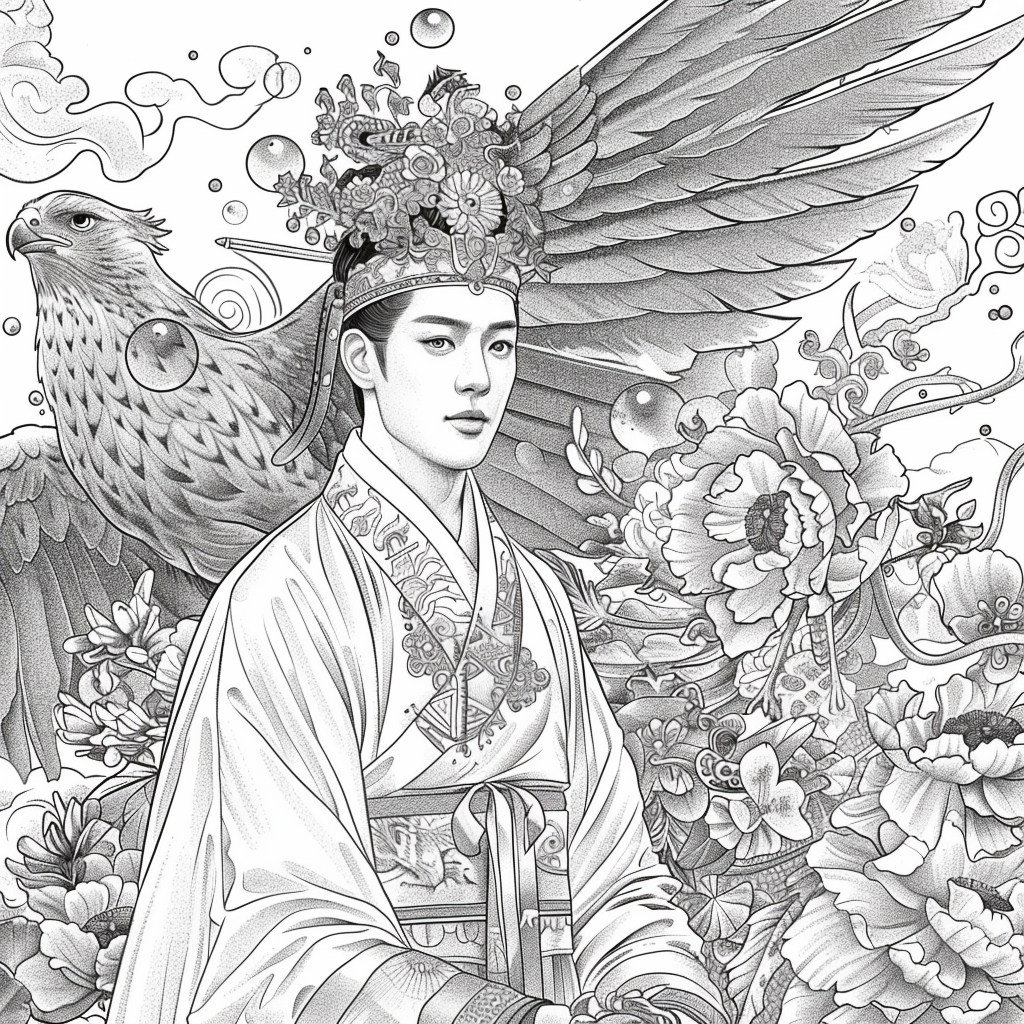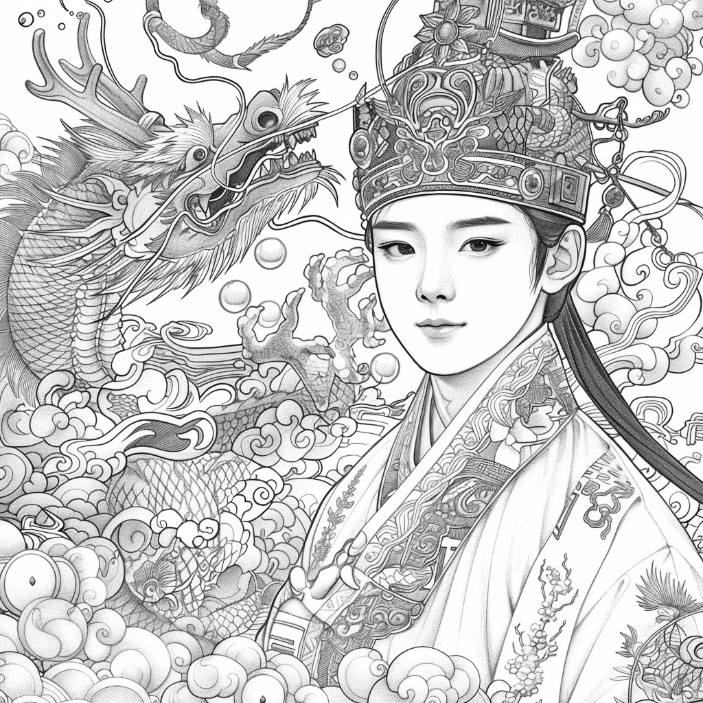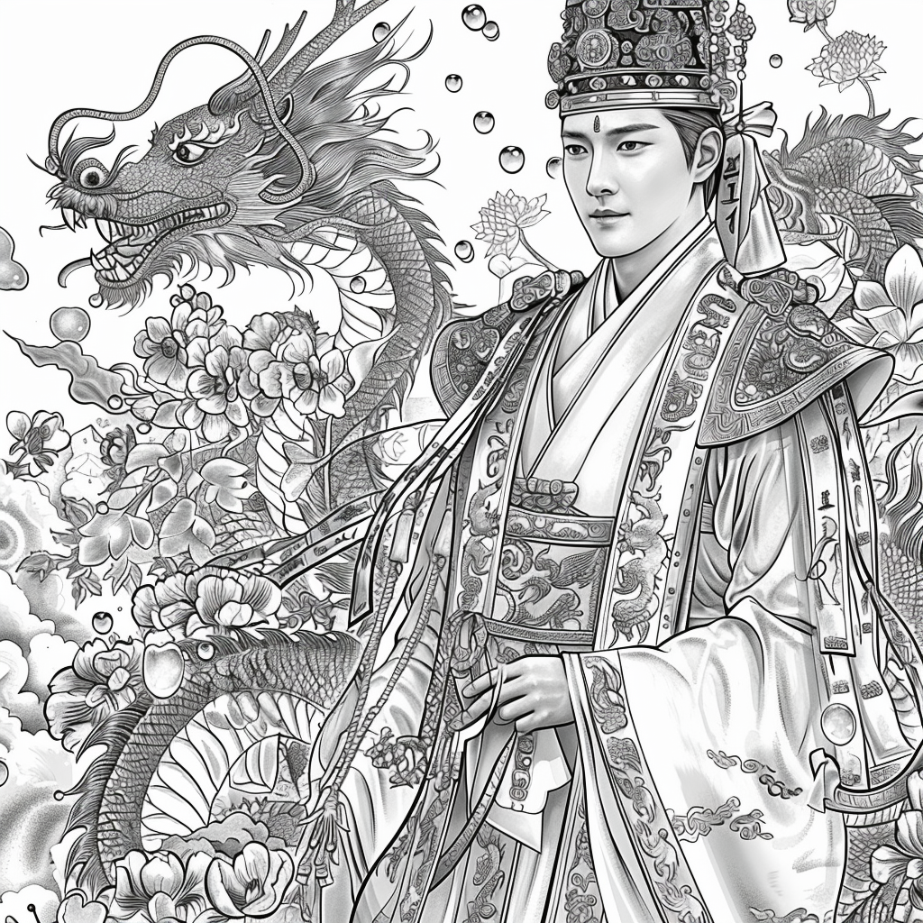 This artwork portrays a young Korean king adorned in an exquisitely detailed royal robe and ornate crown, exuding strength and nobility. Beside him roars a majestic tiger, symbolizing courage and protection. Flowing water, lotus blossoms, and delicate bubbles swirl around, blending the raw energy of nature with the elegance of tradition. The fusion of vibrant patterns, mythic symbolism, and serene yet powerful atmosphere highlights the balance between authority, spirit, and harmony in Korean heritage.