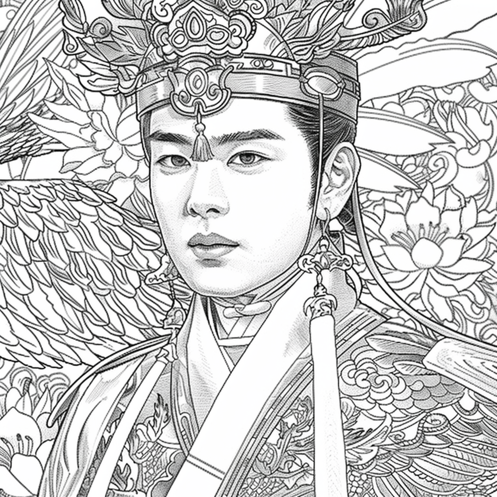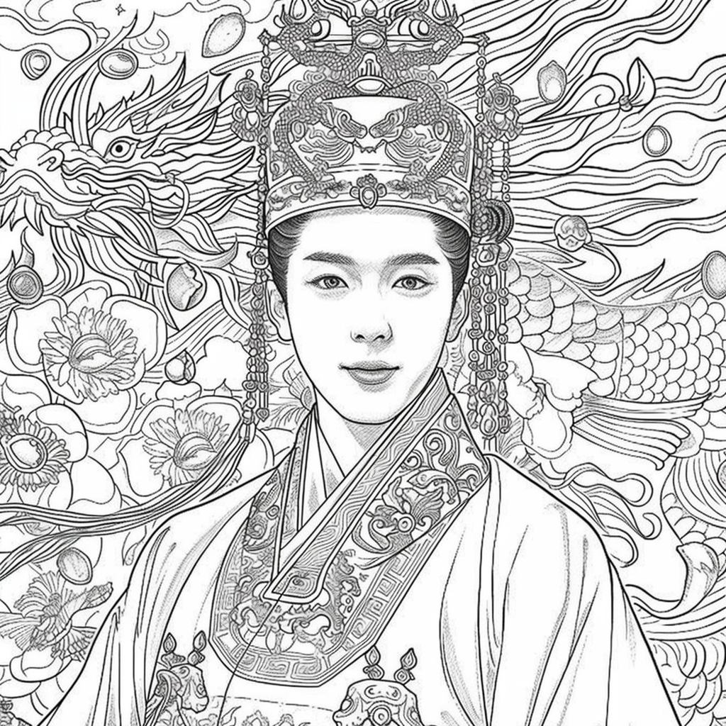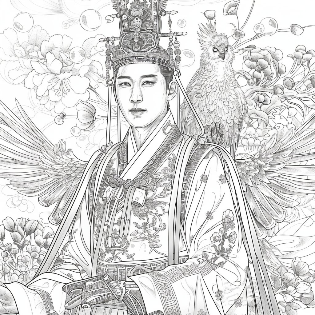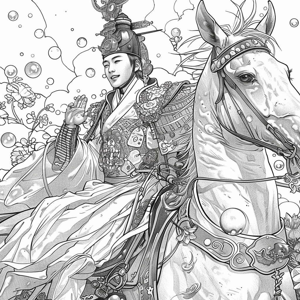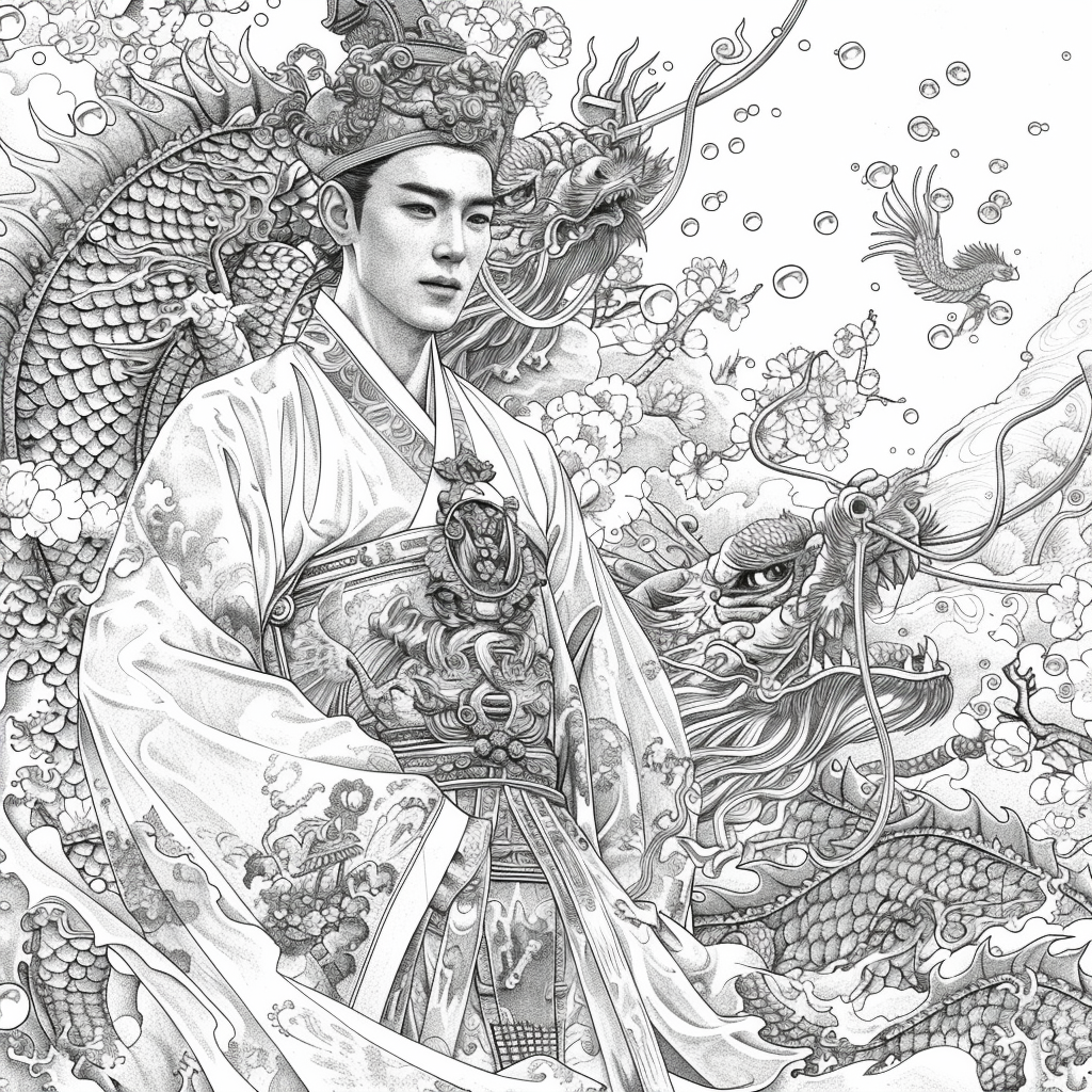 This artwork portrays a young Korean king adorned in an exquisitely detailed royal robe and ornate crown, exuding strength and nobility. Beside him roars a majestic tiger, symbolizing courage and protection. Flowing water, lotus blossoms, and delicate bubbles swirl around, blending the raw energy of nature with the elegance of tradition. The fusion of vibrant patterns, mythic symbolism, and serene yet powerful atmosphere highlights the balance between authority, spirit, and harmony in Korean heritage.