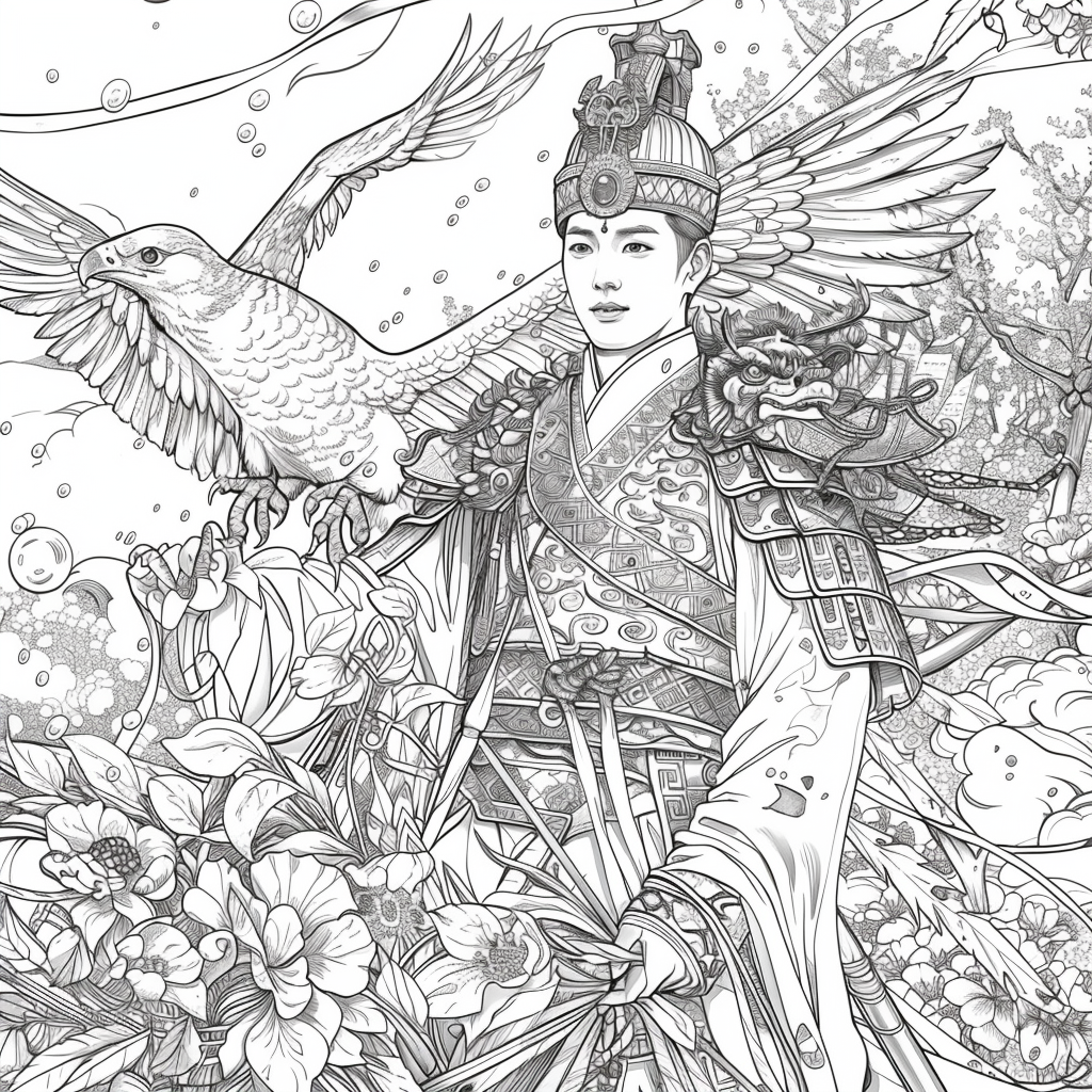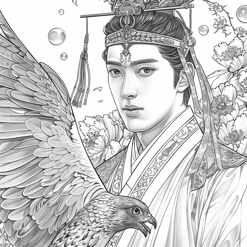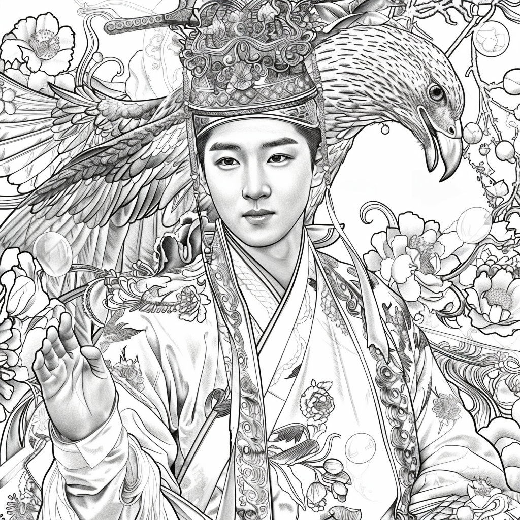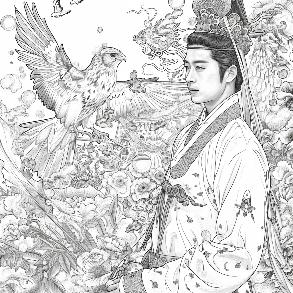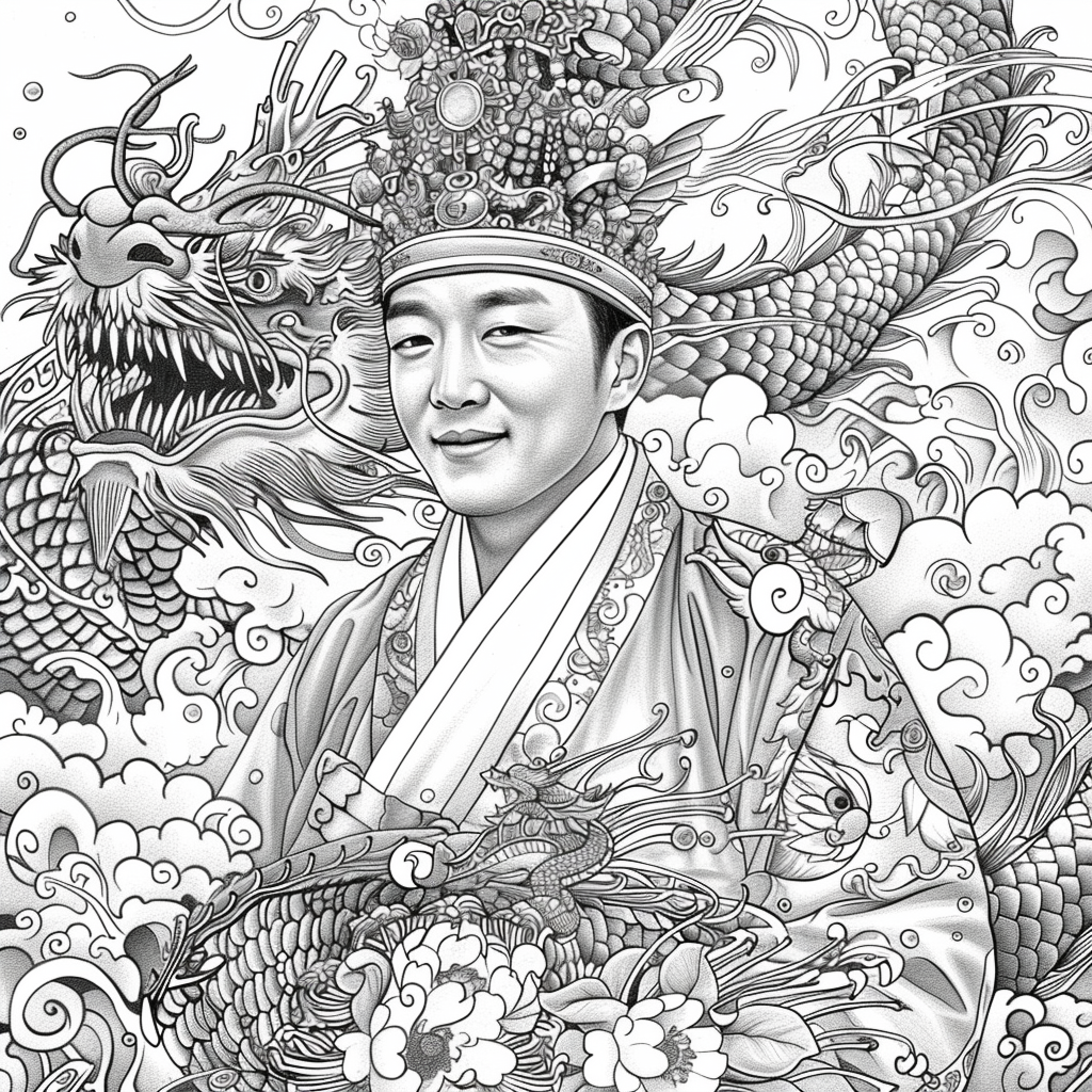 This artwork portrays a young Korean king adorned in an exquisitely detailed royal robe and ornate crown, exuding strength and nobility. Beside him roars a majestic tiger, symbolizing courage and protection. Flowing water, lotus blossoms, and delicate bubbles swirl around, blending the raw energy of nature with the elegance of tradition. The fusion of vibrant patterns, mythic symbolism, and serene yet powerful atmosphere highlights the balance between authority, spirit, and harmony in Korean heritage.
