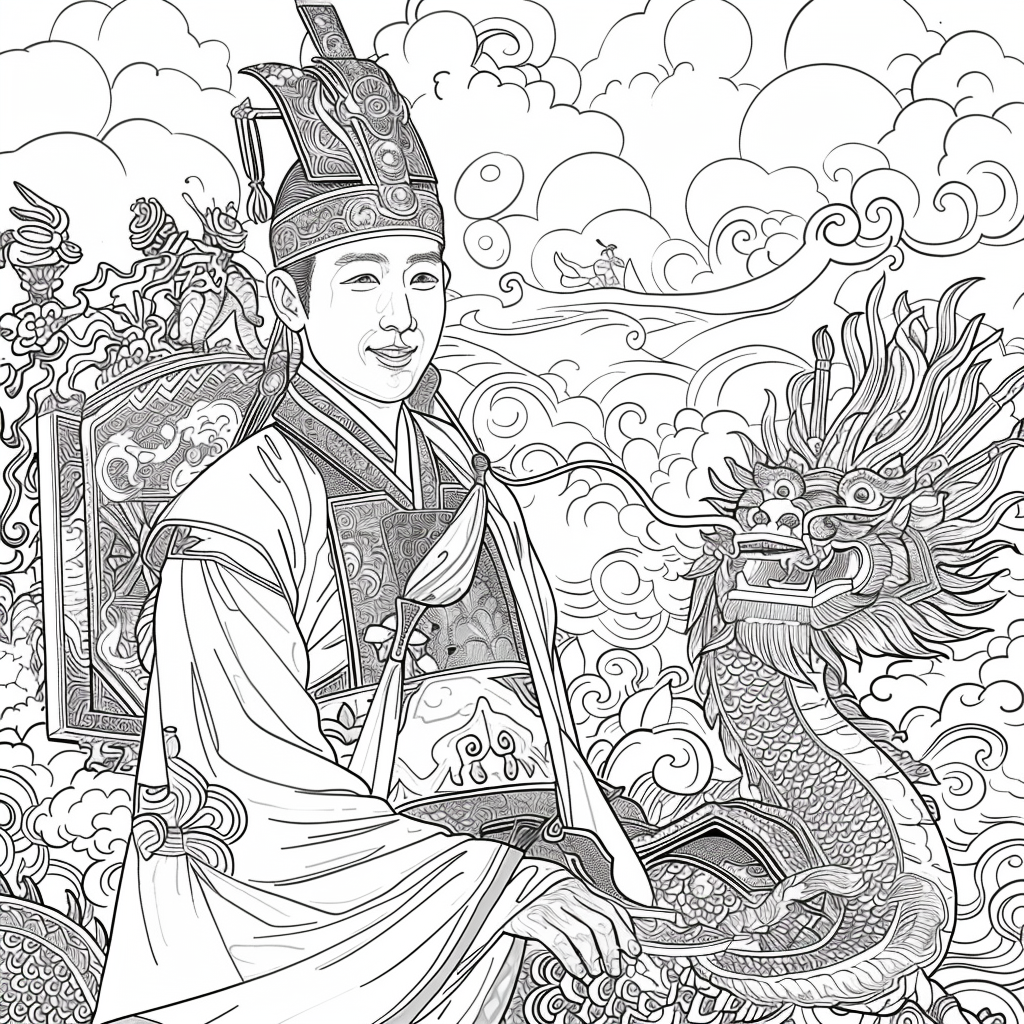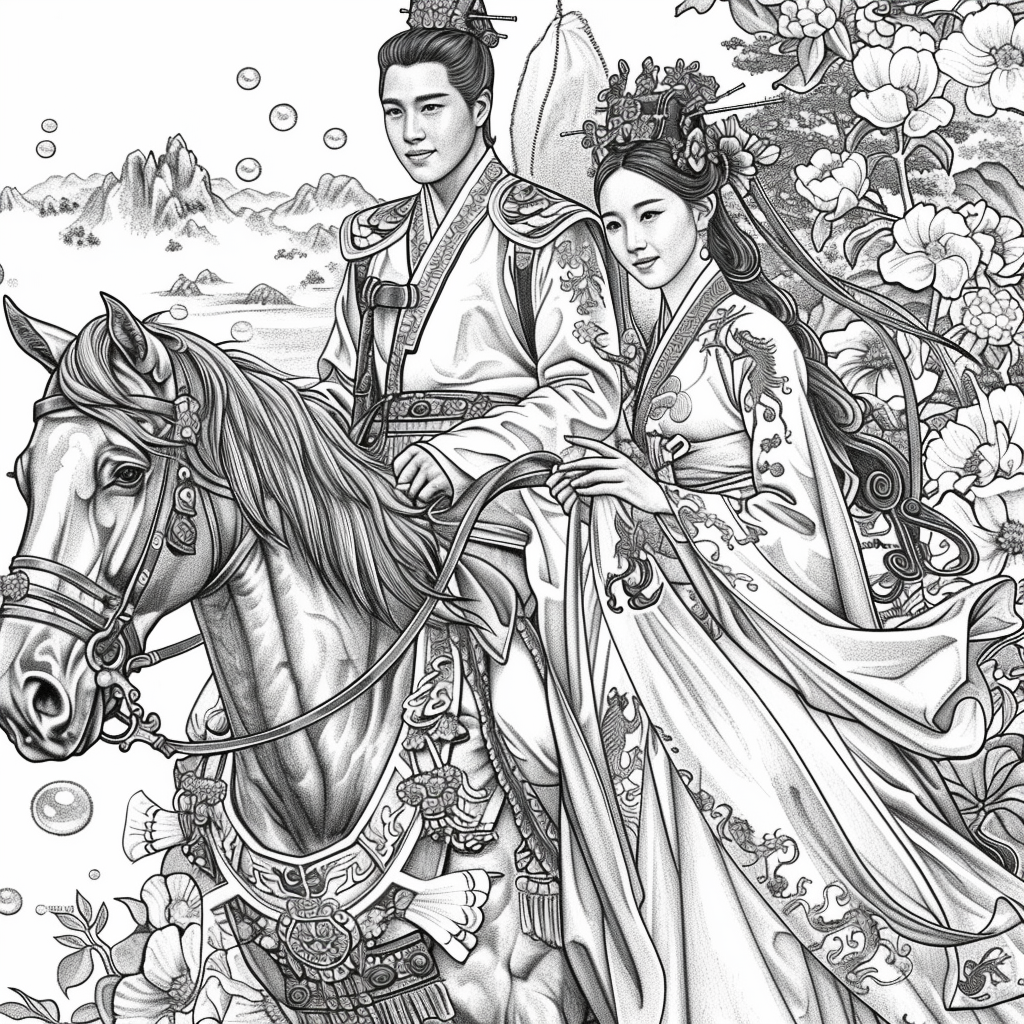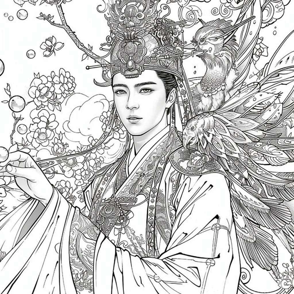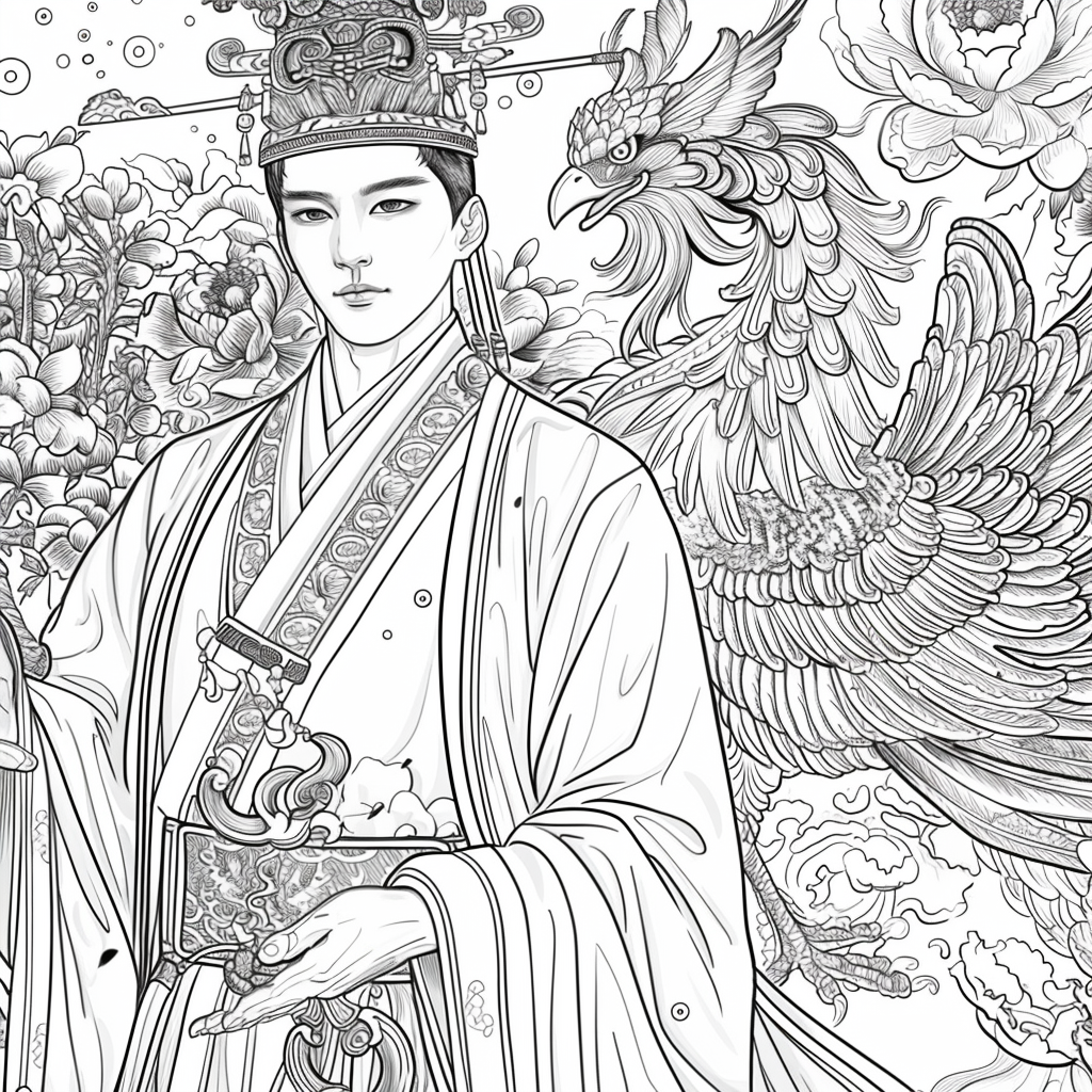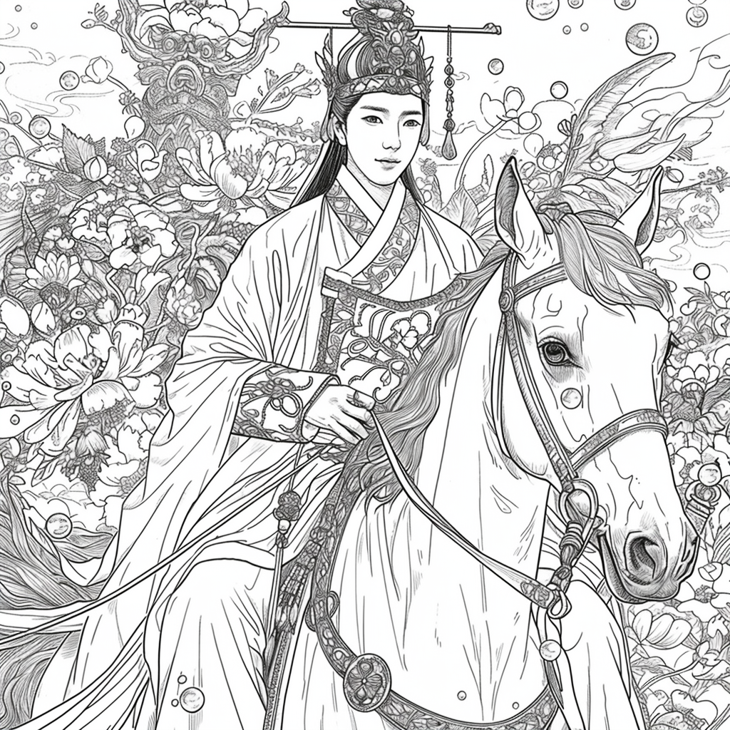 This artwork portrays a young Korean king adorned in an exquisitely detailed royal robe and ornate crown, exuding strength and nobility. Beside him roars a majestic tiger, symbolizing courage and protection. Flowing water, lotus blossoms, and delicate bubbles swirl around, blending the raw energy of nature with the elegance of tradition. The fusion of vibrant patterns, mythic symbolism, and serene yet powerful atmosphere highlights the balance between authority, spirit, and harmony in Korean heritage.
