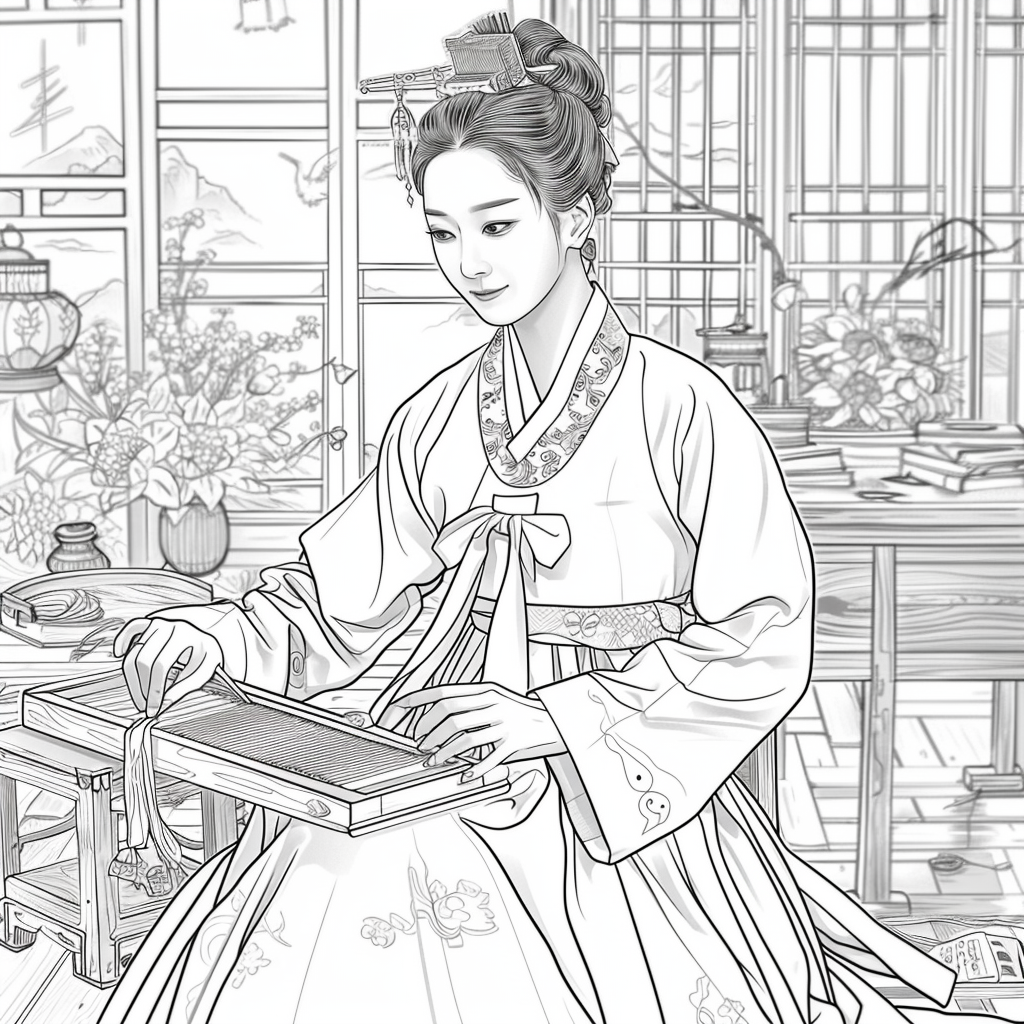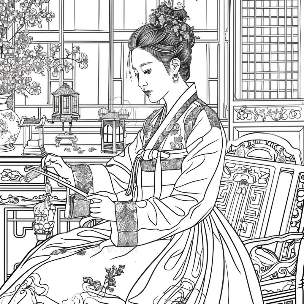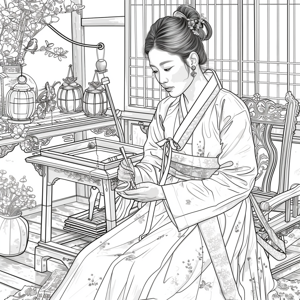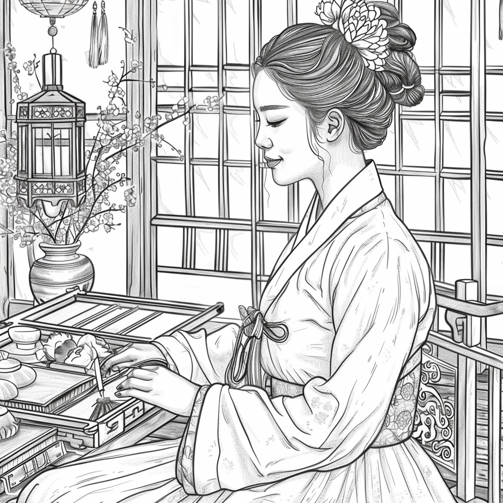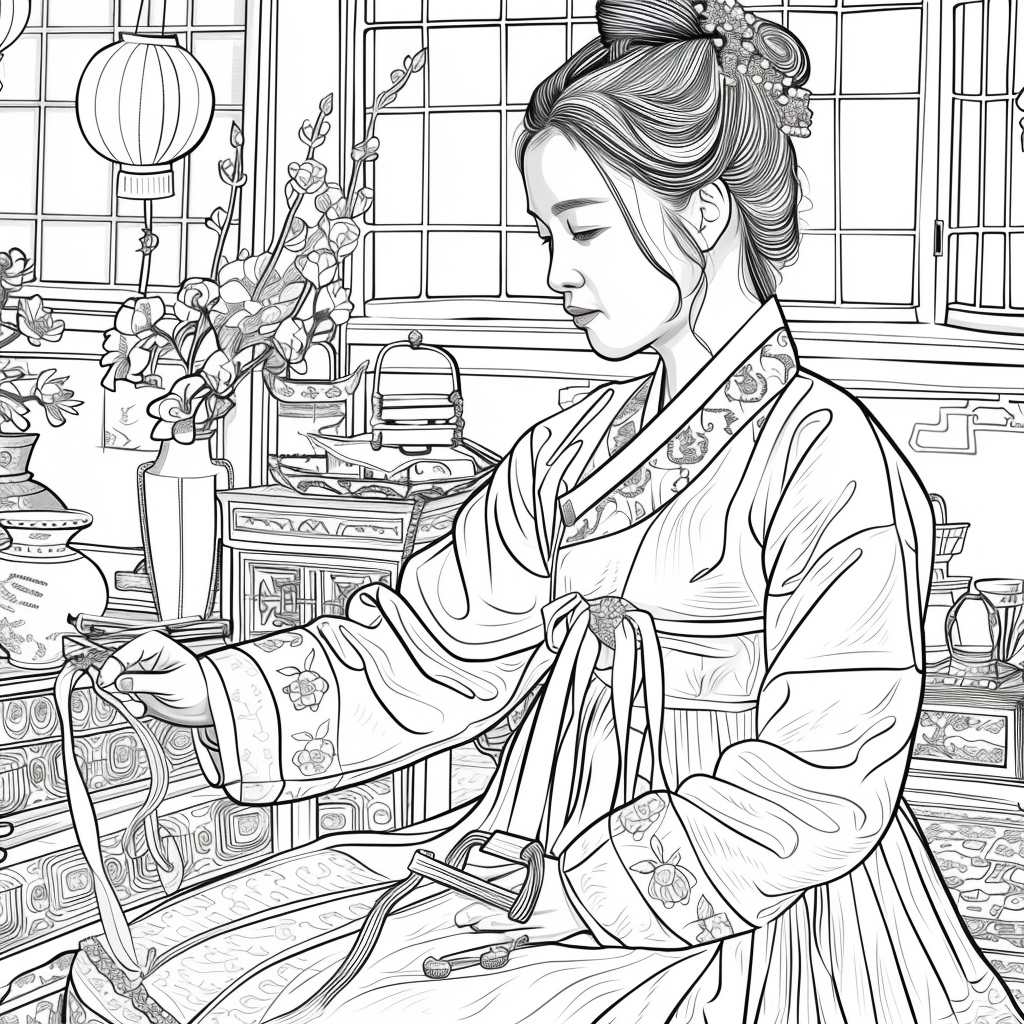 A graceful Korean woman dressed in a vibrant hanbok of soft pinks, blues, and gold embroidery sits by the window of a traditional room, delicately engaged in needlework. Warm sunlight filters through the lattice window, casting a serene glow over the wooden furniture and ceramic vases around her. A red lantern and blossoming branches bring a gentle sense of spring, while her calm expression reflects elegance, patience, and devotion to art. The watercolor textures and fine details capture a timeless scene of harmony, blending beauty, tradition, and domestic tranquility.