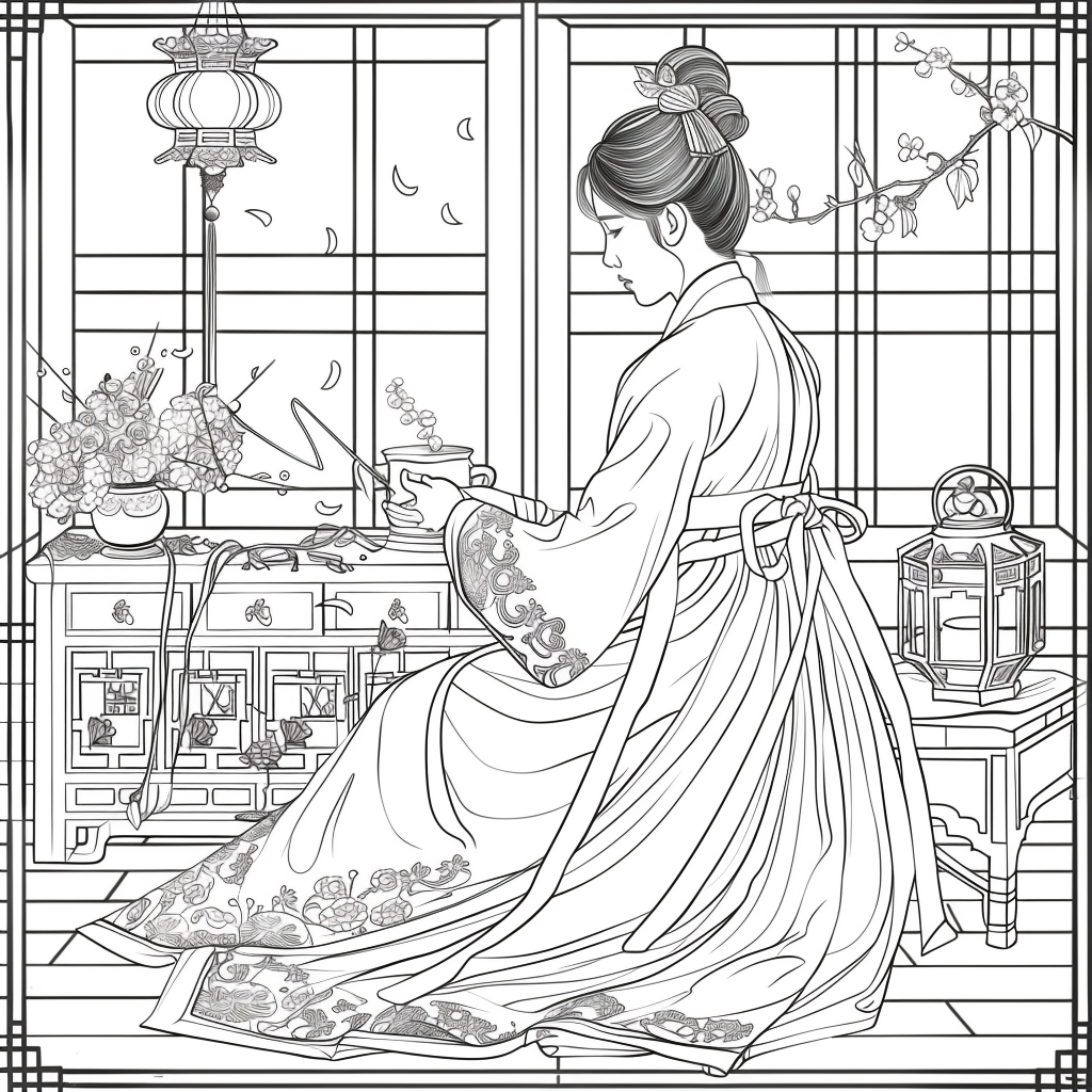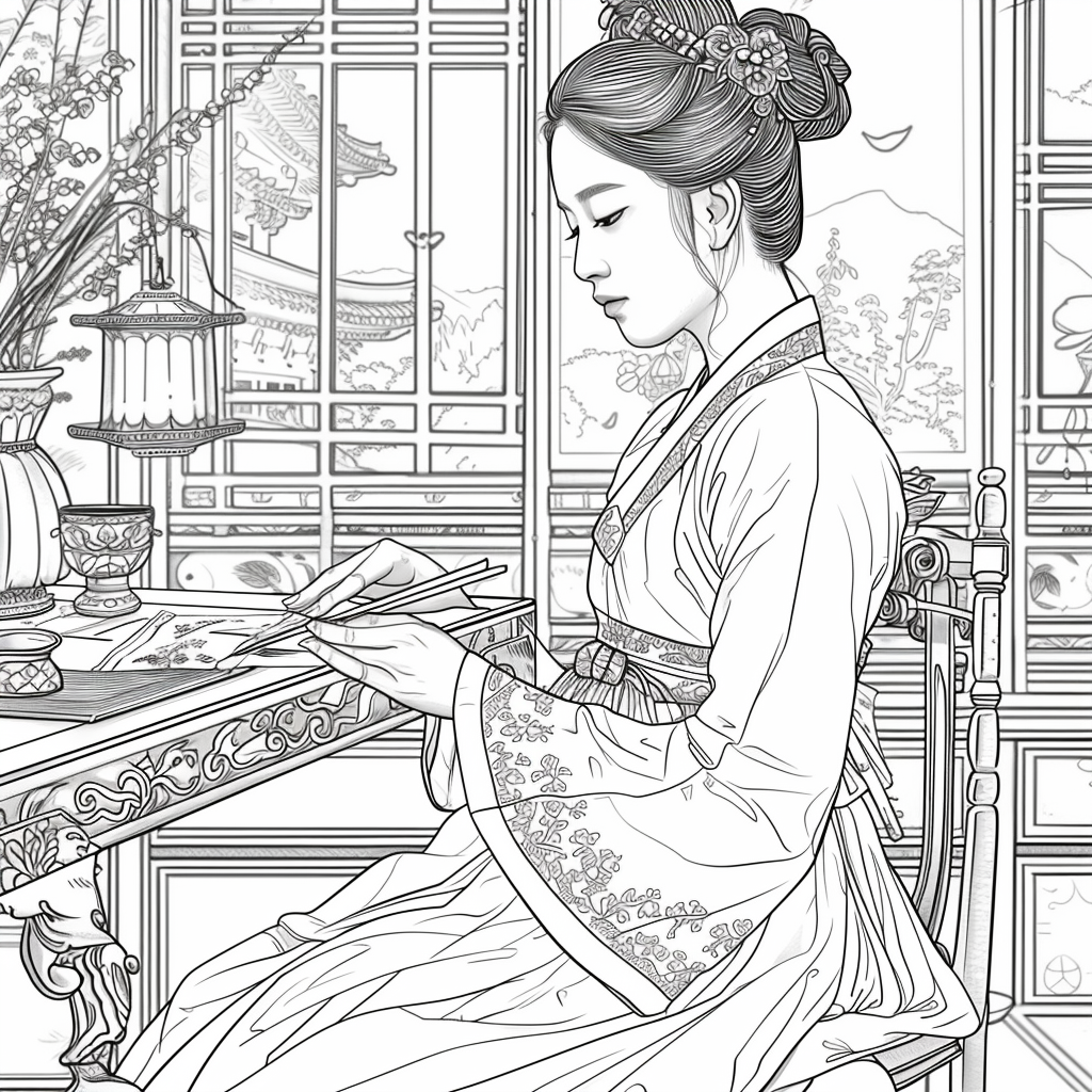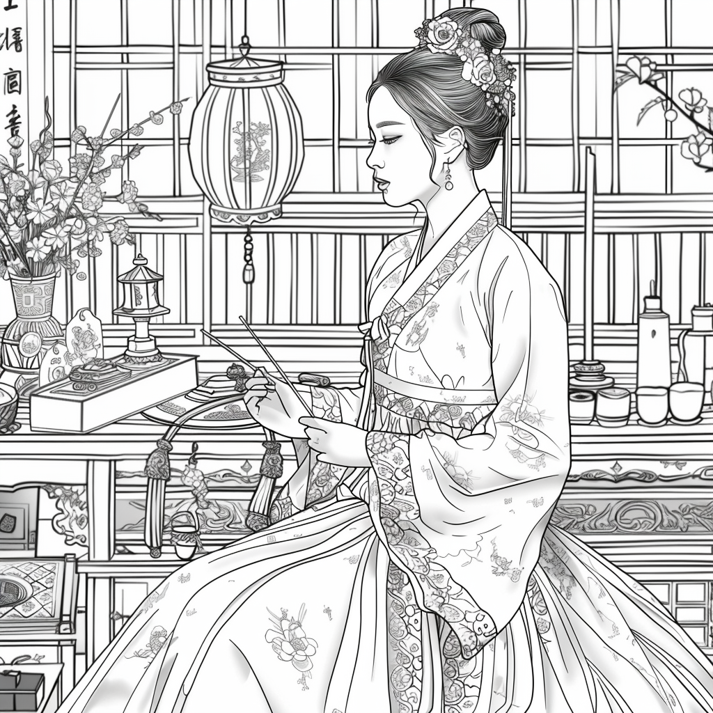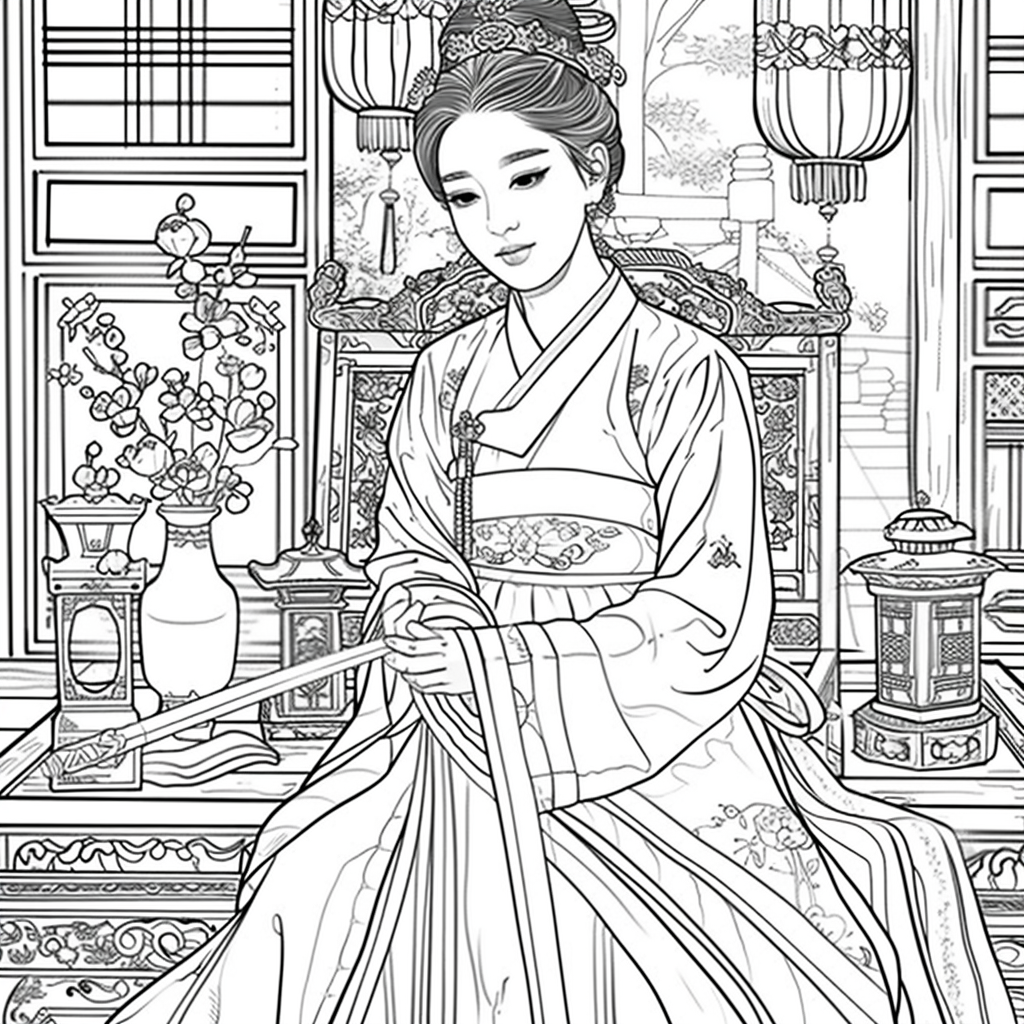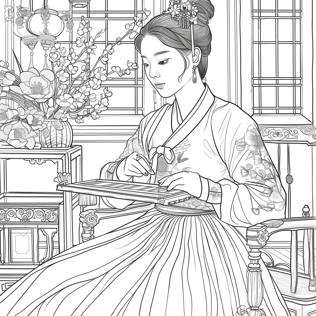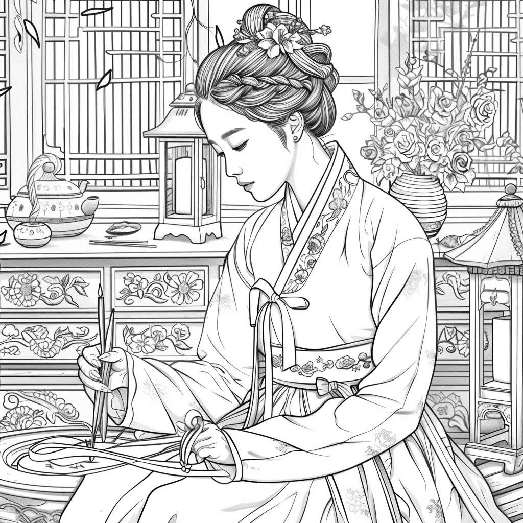 A graceful Korean woman dressed in a vibrant hanbok of soft pinks, blues, and gold embroidery sits by the window of a traditional room, delicately engaged in needlework. Warm sunlight filters through the lattice window, casting a serene glow over the wooden furniture and ceramic vases around her. A red lantern and blossoming branches bring a gentle sense of spring, while her calm expression reflects elegance, patience, and devotion to art. The watercolor textures and fine details capture a timeless scene of harmony, blending beauty, tradition, and domestic tranquility.
